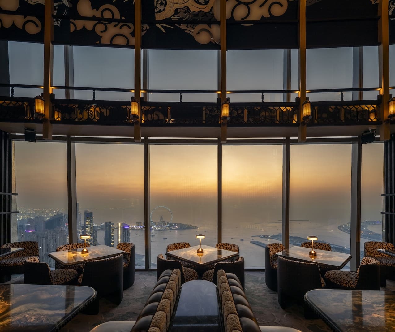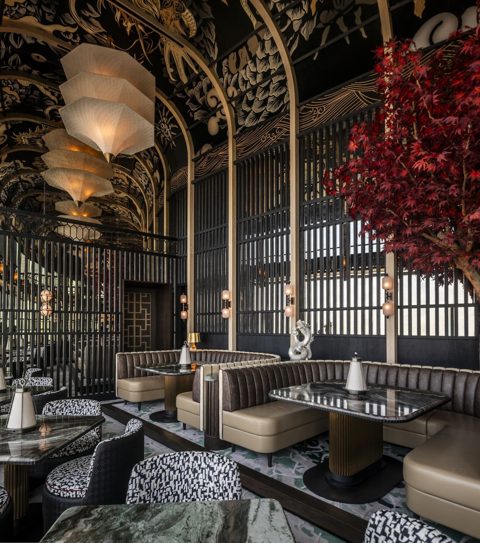 Guests arrive through a dramatic triple-height atrium, conceived as a contemporary interpretation of a Chinese courtyard and anchored by Tattu’s signature sweeping cherry blossom tree above the main reception. Flanking this central space, dedicated reception areas invite exploration of the multi-storey dining and bar experiences. Spanning three levels, TATTU Dubai offers panoramic views across the Palm, with front-row seats for the city’s spectacular sunsets. Completing the experience, two private dining rooms provide intimate, elevated settings where storytelling, symbolism, and atmosphere come together in perfect harmony.