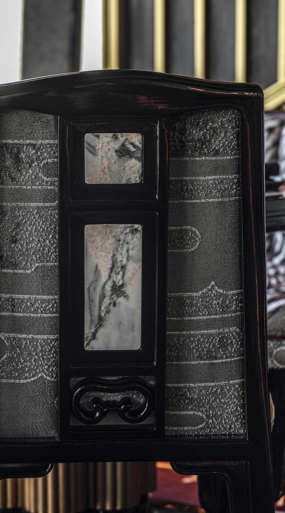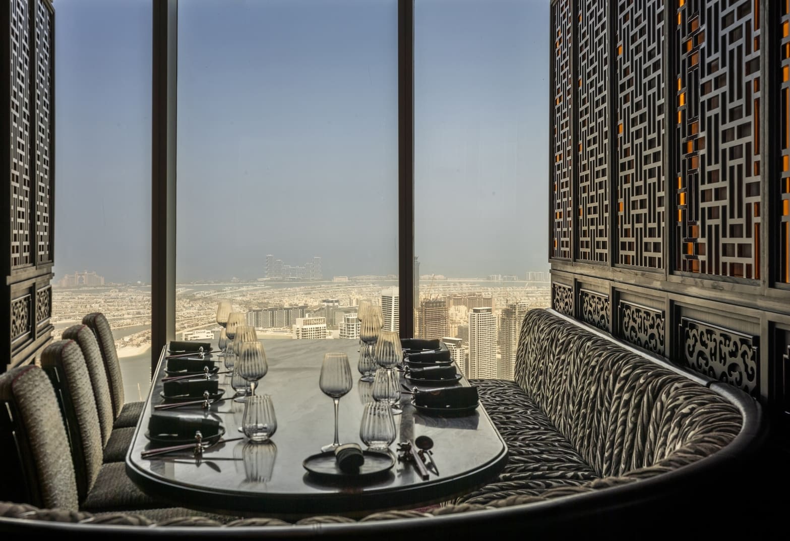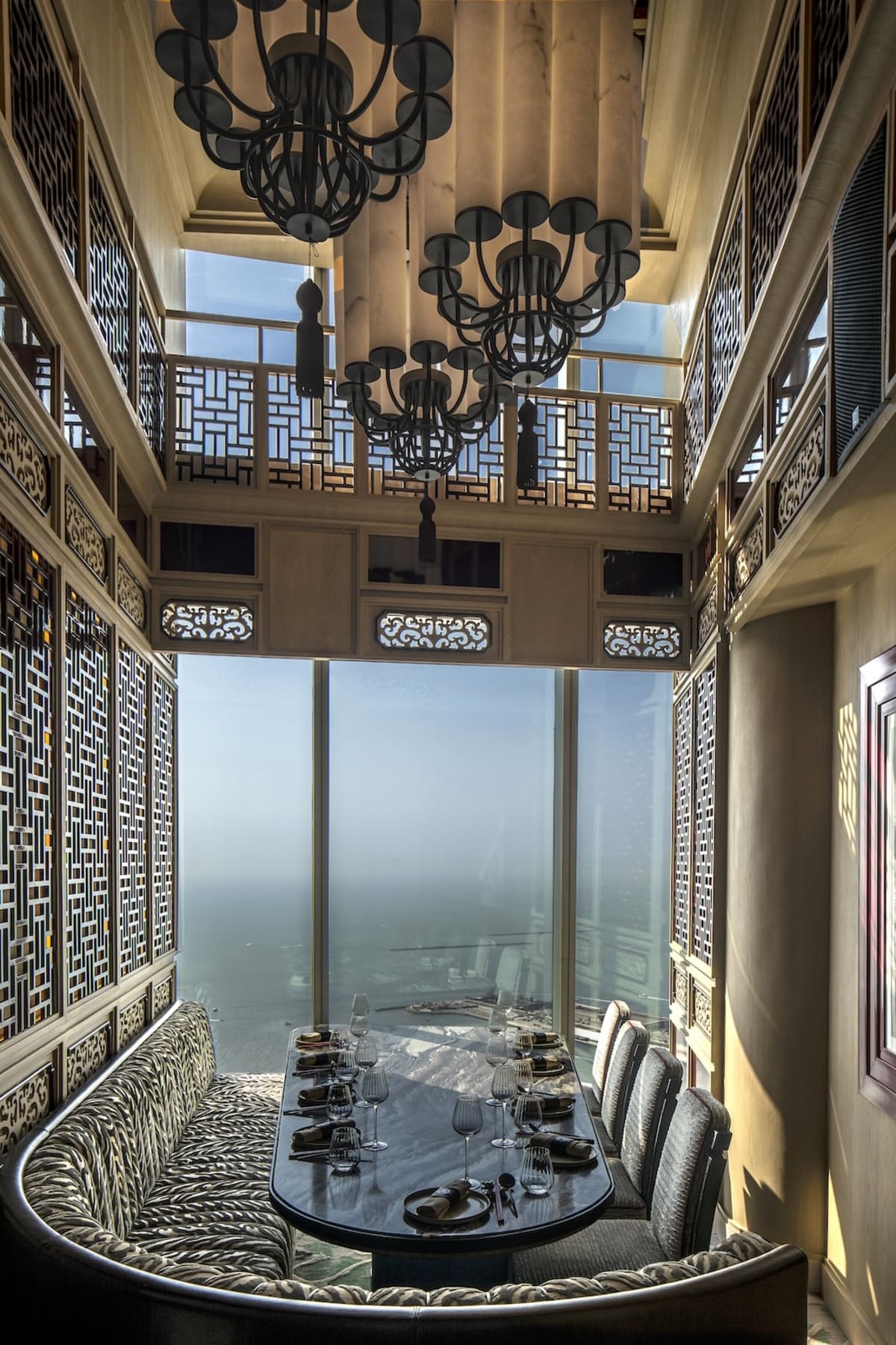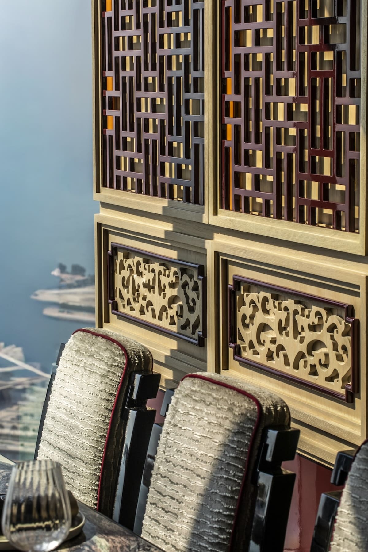 Continuing the theme of contrasts, the Private Dining Room offers a cosier, home-like atmosphere with stunning views of The Palm. Lacquered timber panels and intricate fretwork, paired with oversized hanging lanterns and an impressive table made of cut Avalanche Quartzite, a modern take on traditional Chinese design, blending contemporary and cultural elements.