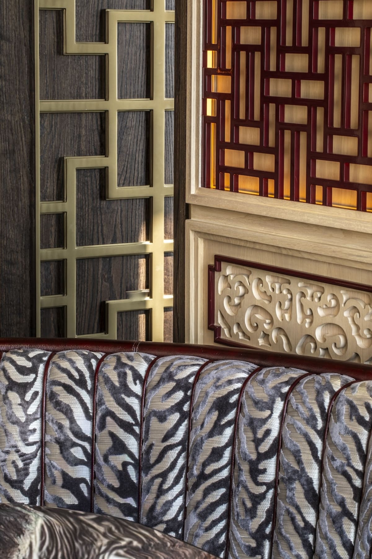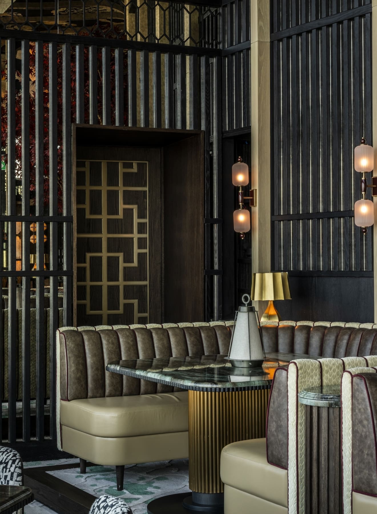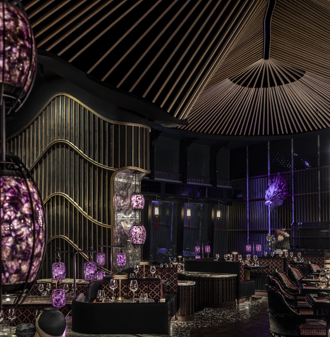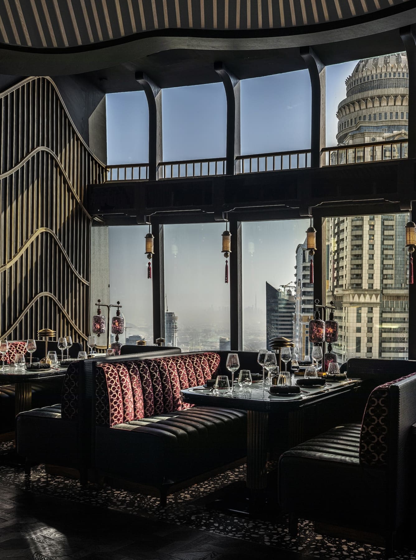 Continuing the theme of contrasts, the Private Dining Room offers a cosier, home-like atmosphere with stunning views of The Palm. Lacquered timber panels and intricate fretwork, paired with oversized hanging lanterns and an impressive table made of cut Avalanche Quartzite, a modern take on traditional Chinese design, blending contemporary and cultural elements.
