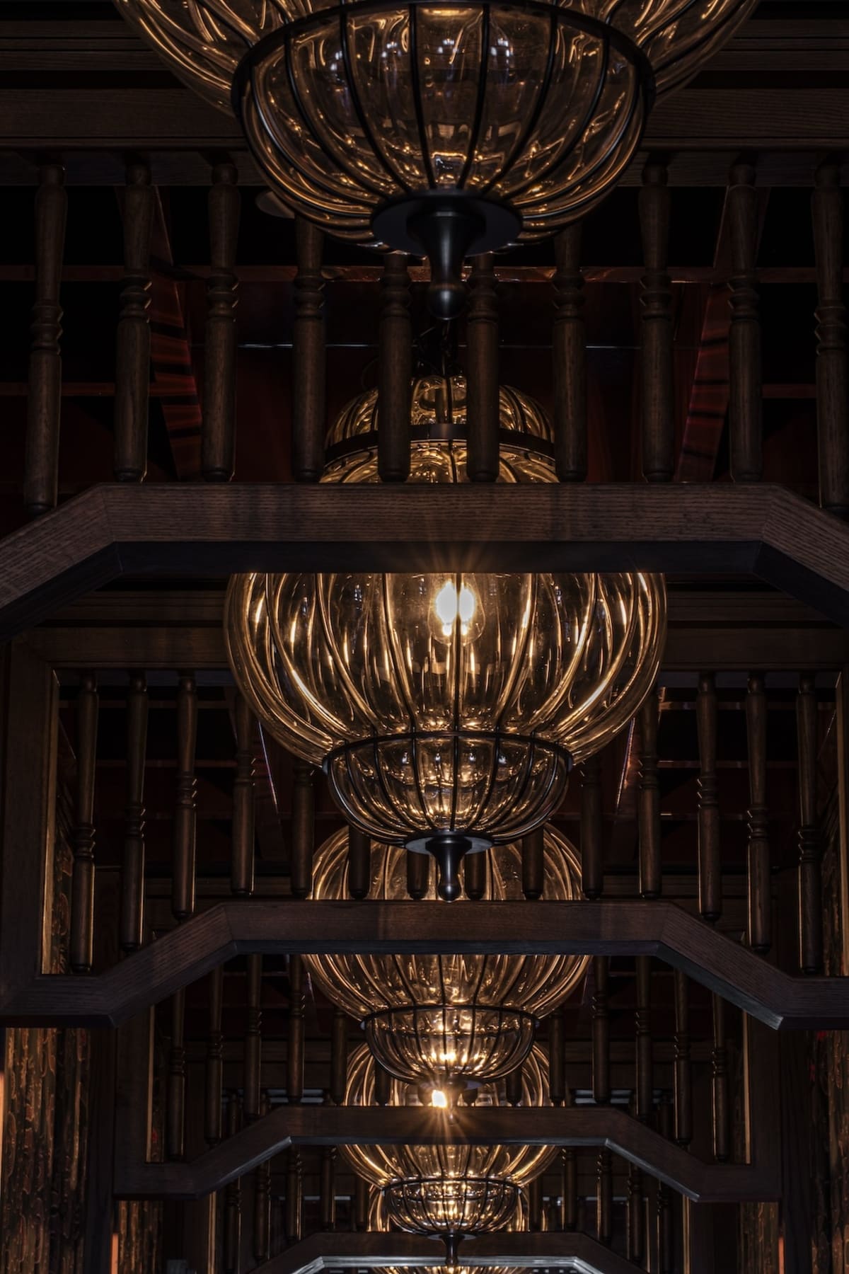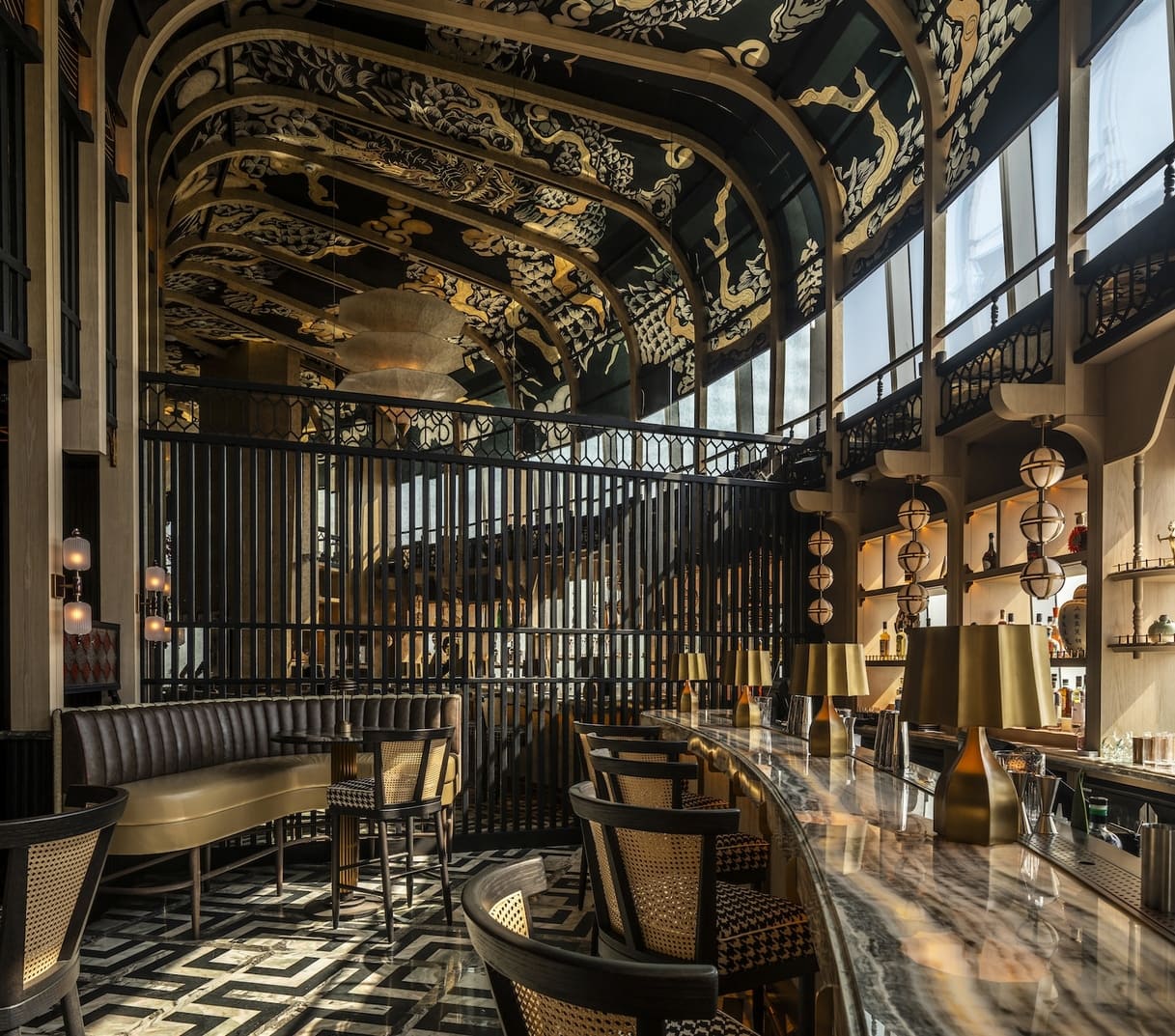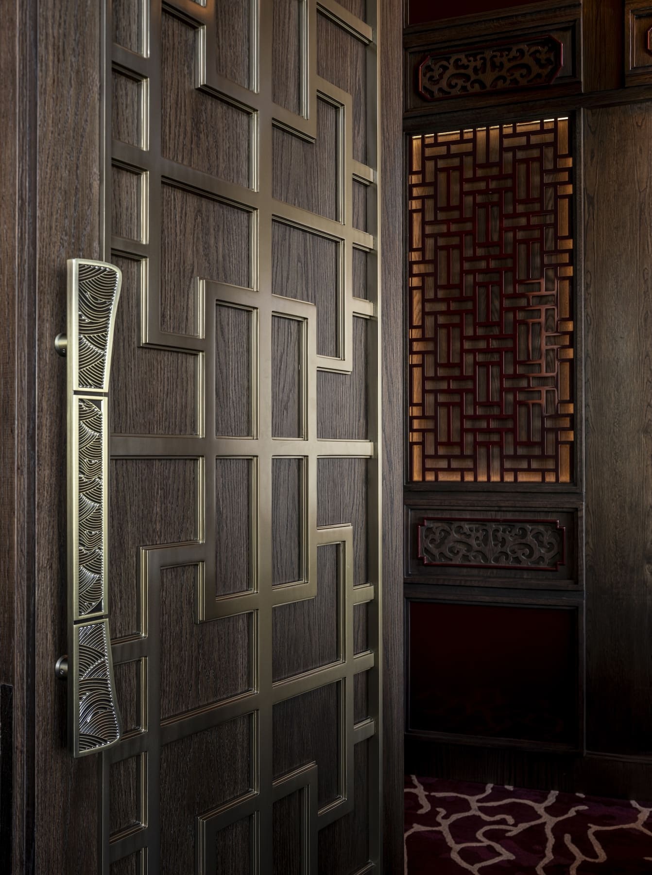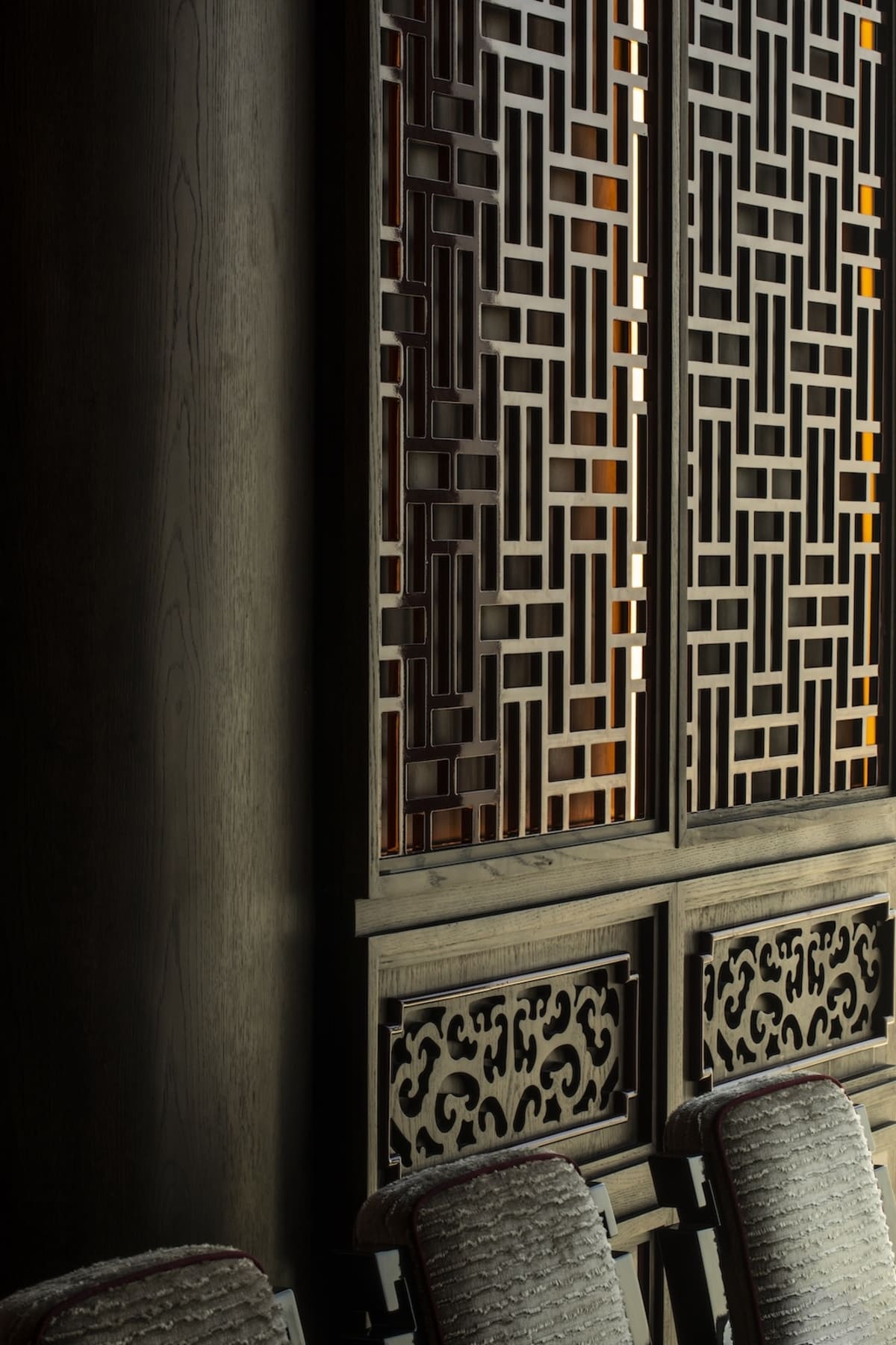 Continuing the theme of contrasts, the Private Dining Room offers a cosier, home-like atmosphere with stunning views of The Palm. Lacquered timber panels and intricate fretwork, paired with oversized hanging lanterns and an impressive table made of cut Avalanche Quartzite, a modern take on traditional Chinese design, blending contemporary and cultural elements.