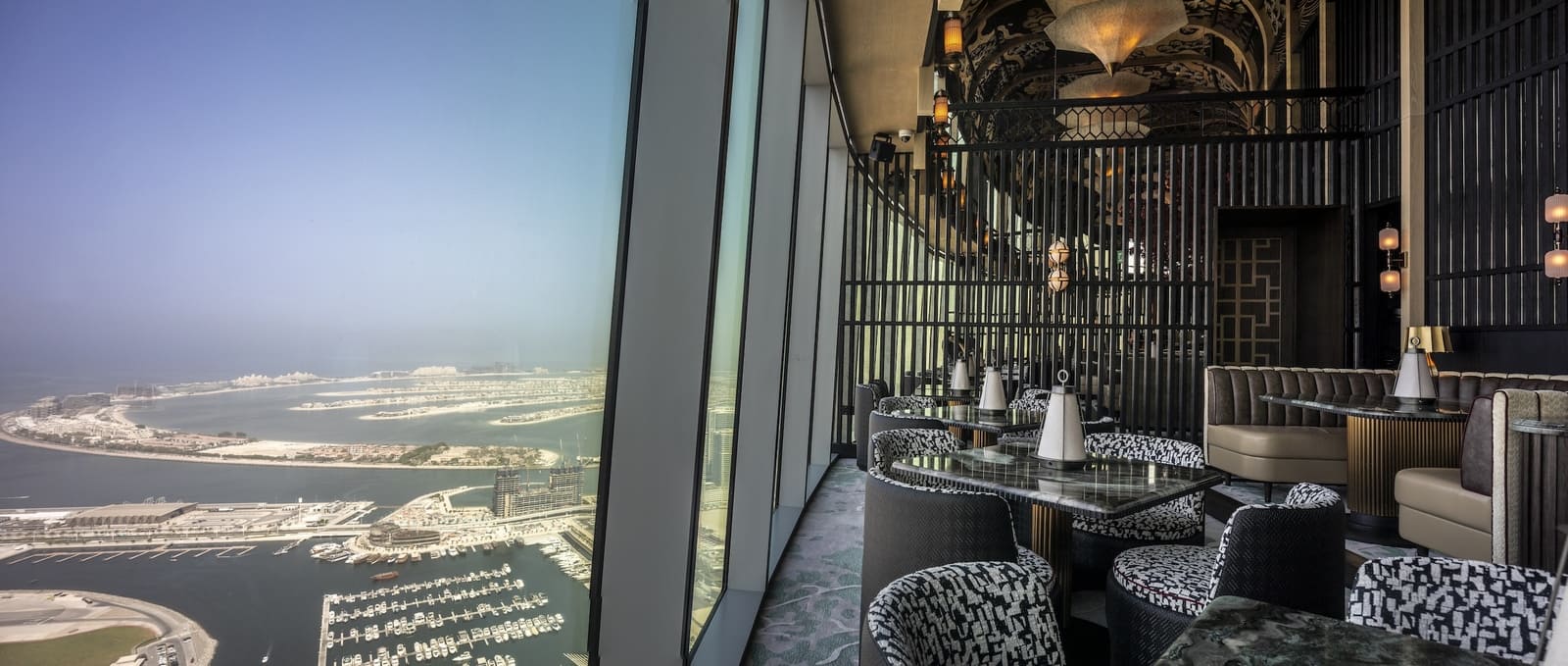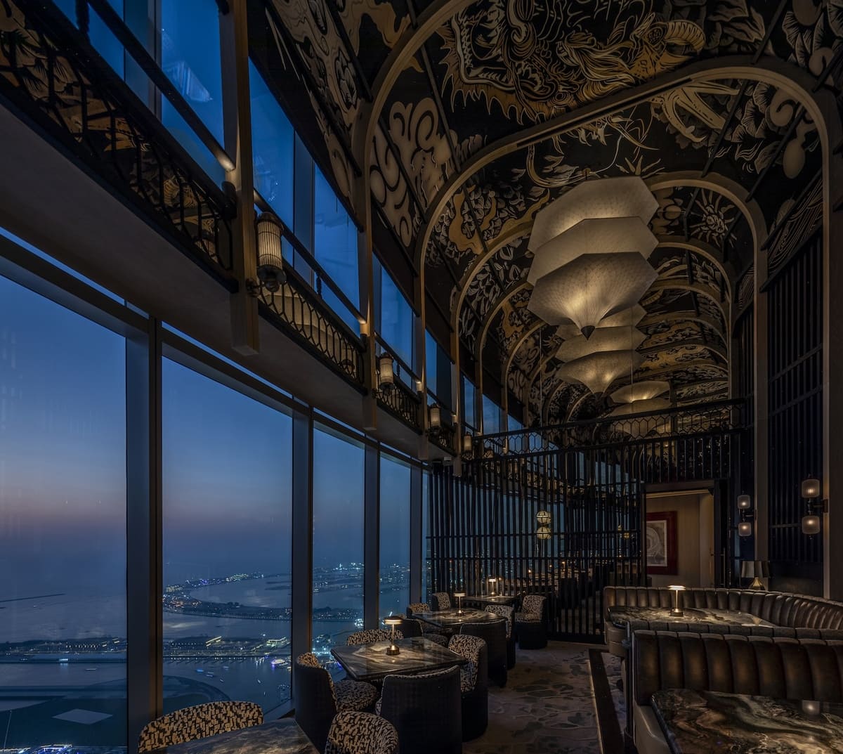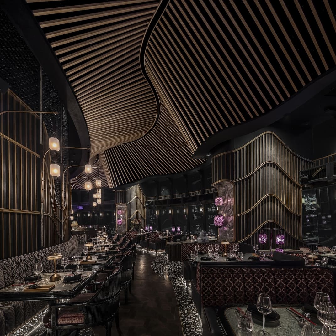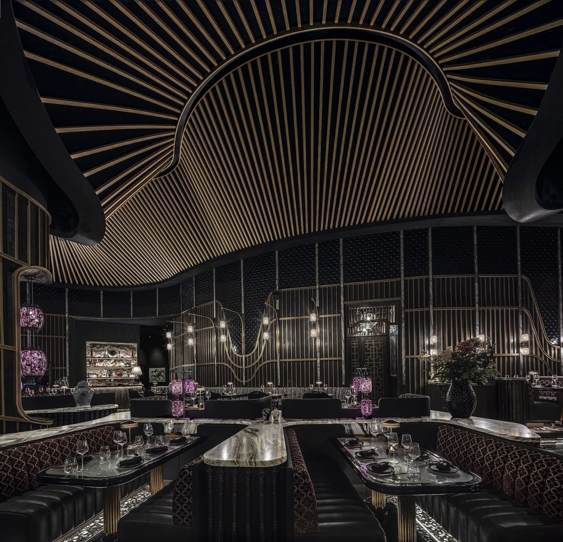 High up in the clouds, on the 74th floor, the richly atmospheric TATTU Restaurant & Bar draws inspiration from ancient mythology. The restaurant offers Tattu’s signature modern Asian cuisine, skilfully blending traditional flavours with innovative presentation. Inspired by the black and white dragon, the restaurant’s duality of light and dark is further emphasised by captivating views of Dubai Marina, The Palm, and Jumeirah. The Black Dragon Dining Room features a striking ceiling inspired by a dragon in motion, showcasing organic design. The flowing shapes are smoothly reflected on the columns and walls, creating a cohesive and inviting dining experience. The adjoining White Dragon Sunset Lounge provides a visual contrast to the black dragon, symbols of duality and balance: the Yin & Yang.
