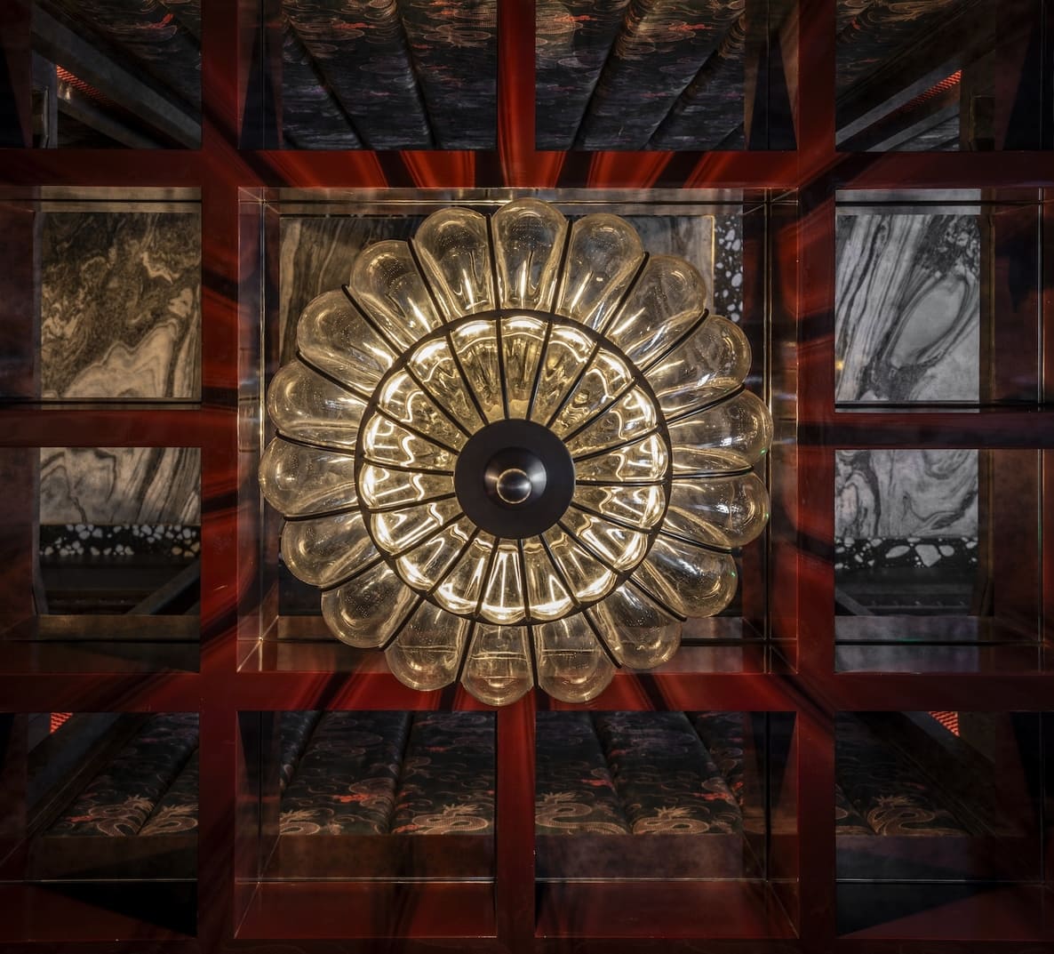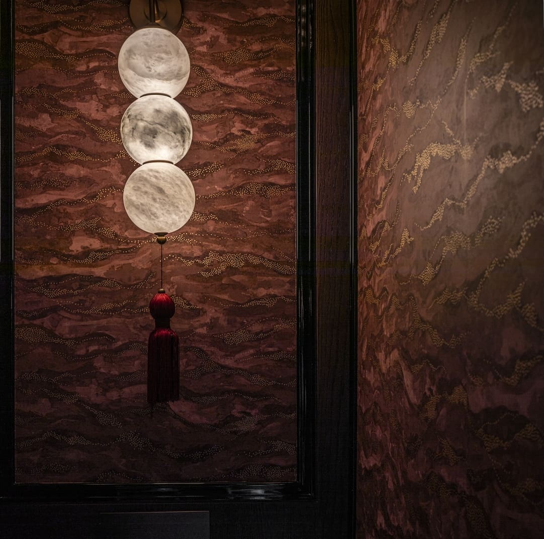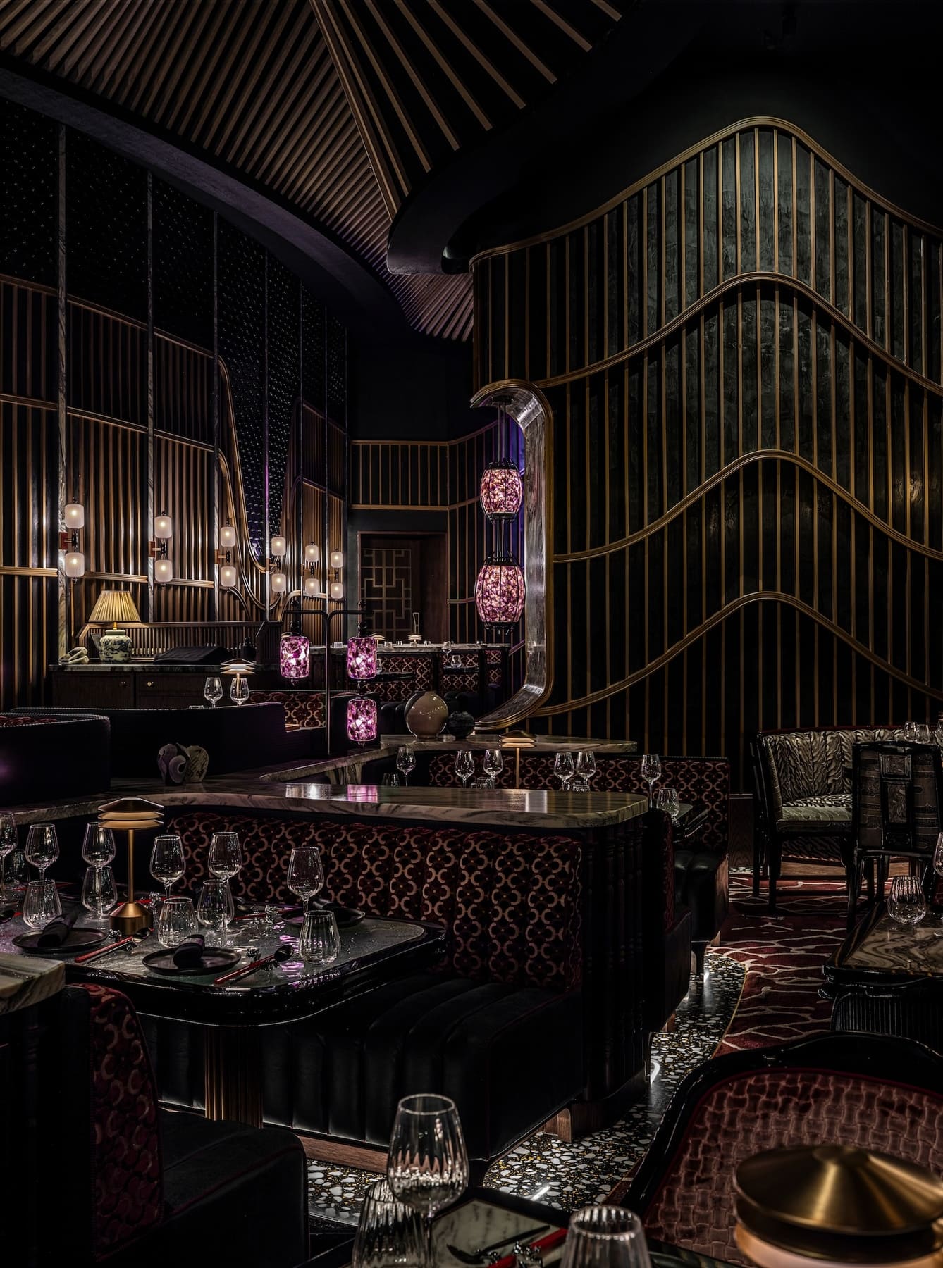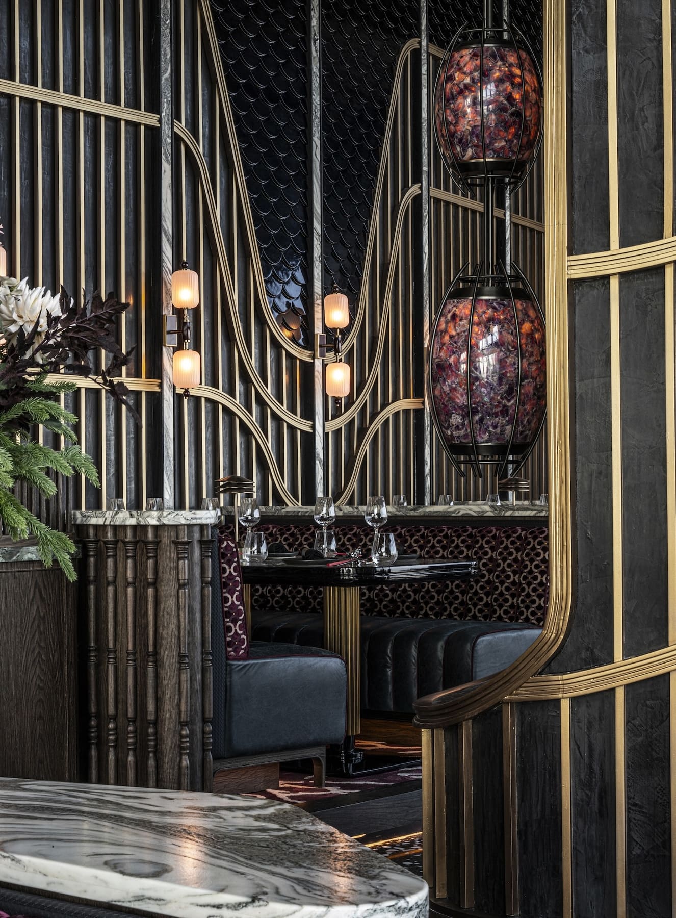 Studio WYZE’s Co-founder and Principal Chris Sayce comments on TATTU Restaurant & Bar’s material palette, saying: “The restaurant adopts a strikingly moody palette – featuring Shou-Sugi-Ban charred Japanese Cedar timber, richly veined marble, amethyst glass, and custom wallpapers – materials that reflect the depth of the black dragon. In contrast, the bar is shaped by the white dragon’s influence, with a lighter palette of white-washed timber, onyx, mirror and pewter.”