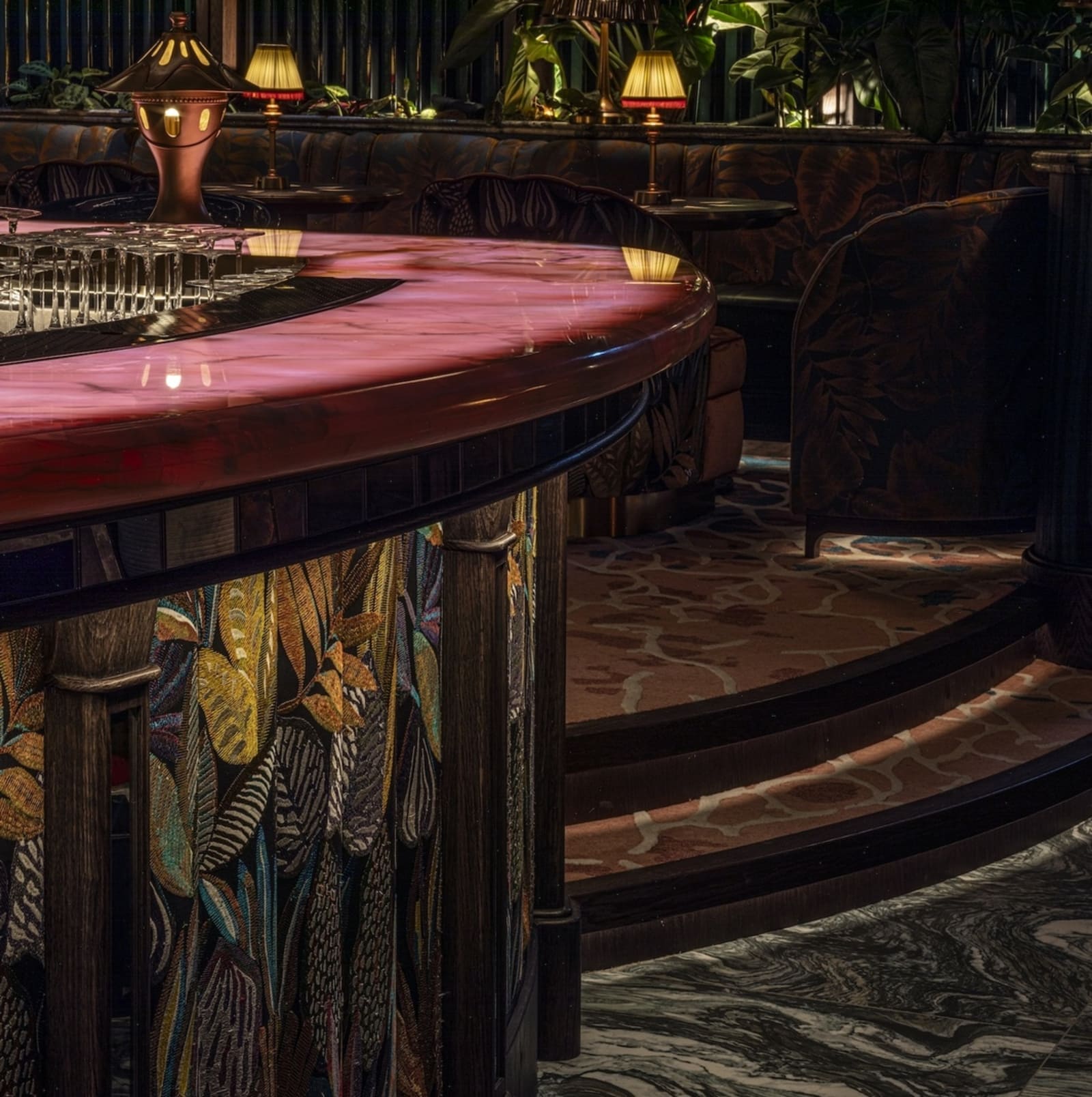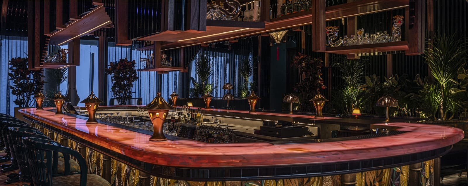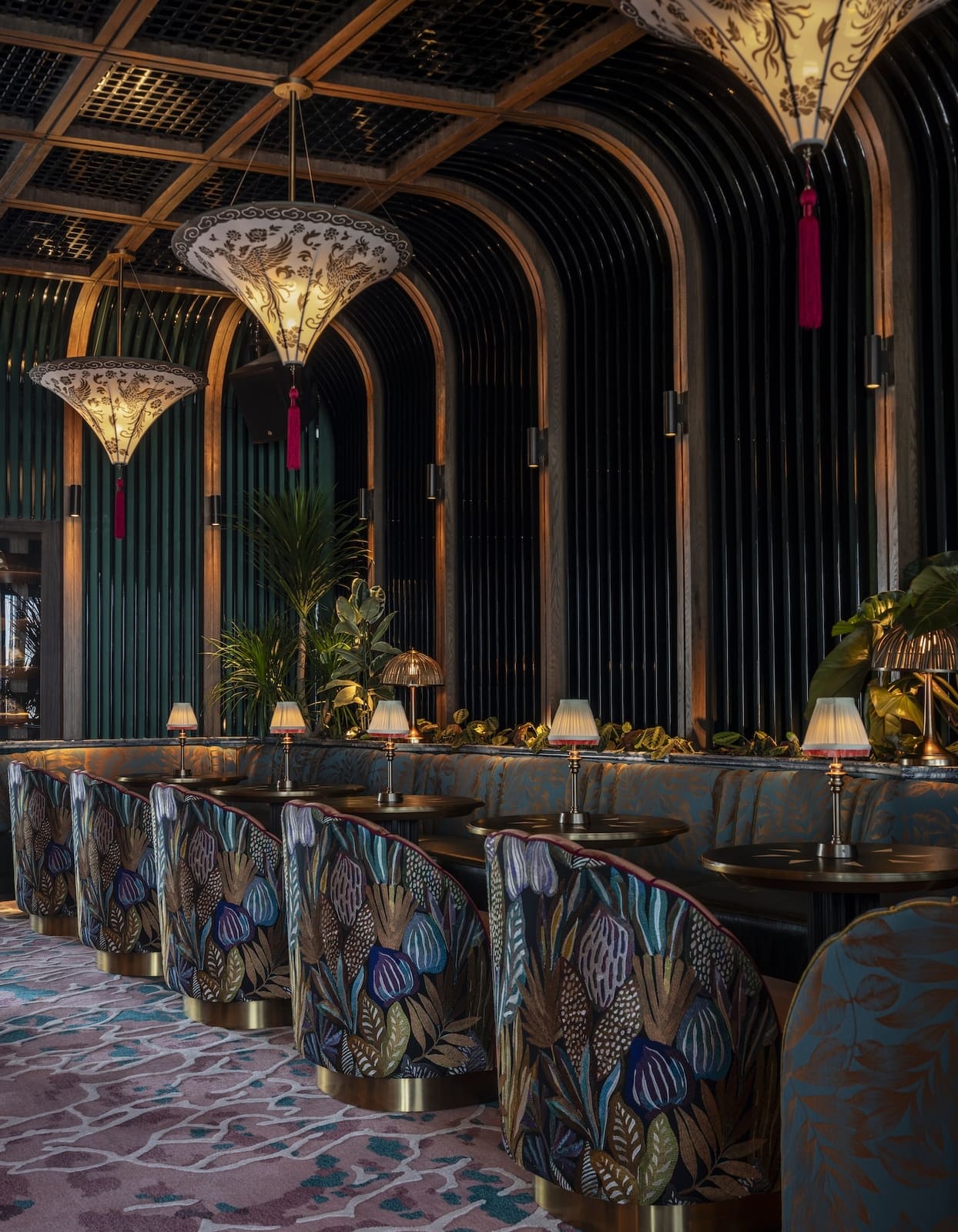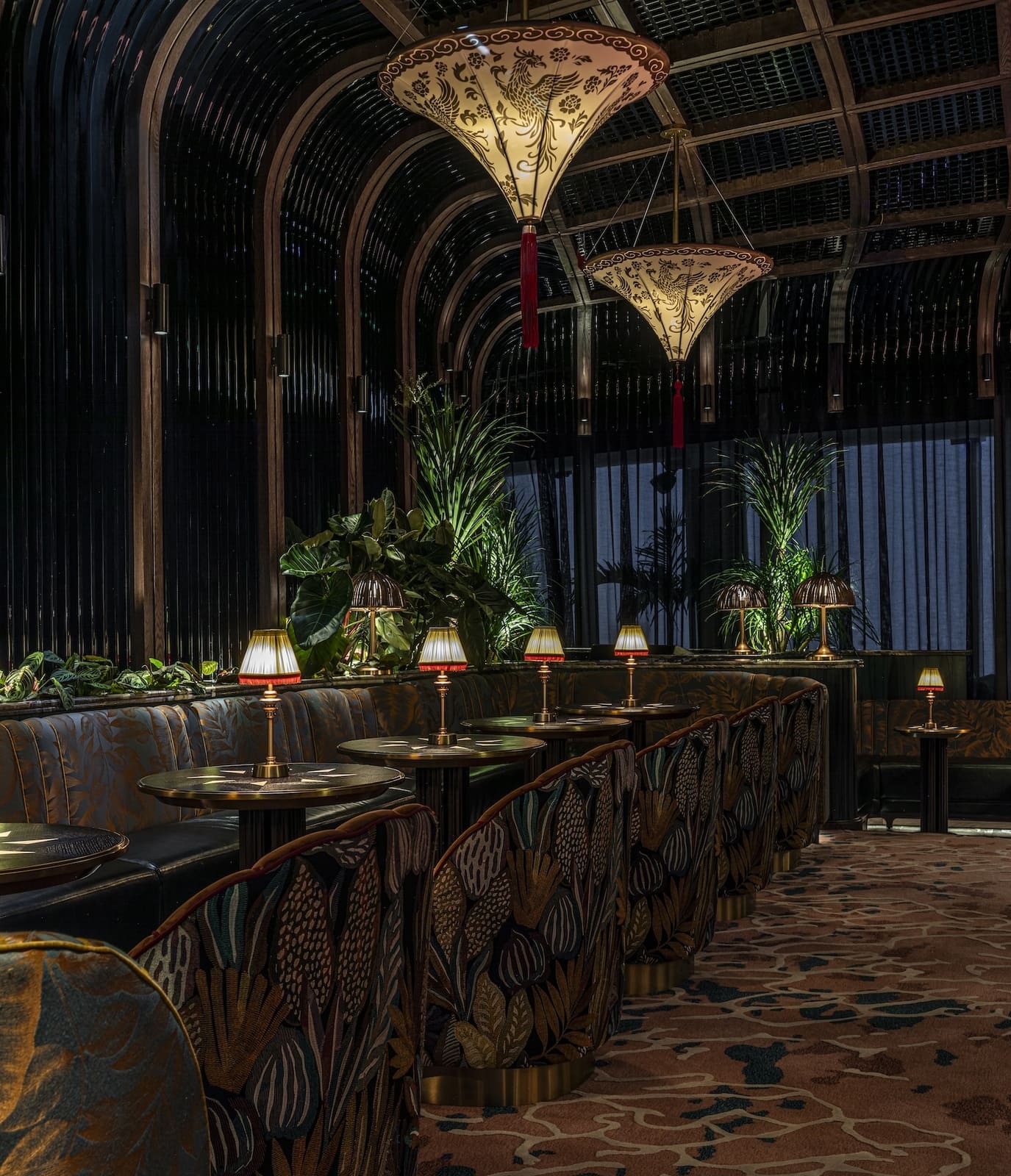 Studio WYZE’s Co-founder and Principal Christina Arbenz, describes the experiential journey as guests move through the Tattu Sky Lounge & Terrace: “Guests are greeted with a vibrant colour palette, tactile fabric-fronted bar, rich textural carpets, and heavily veined marbles, which infuse the space with energy and personality. A setting designed for unforgettable nights high above the city. From the lively interior, guests can flow into the perimeter gallery, a wraparound terrace offering 360-degree views of Dubai. Here, the phoenix narrative extends into the landscape — with Jurassic-style planting and plush lounge seating, creating a surreal ‘roof-top’ orangery.”