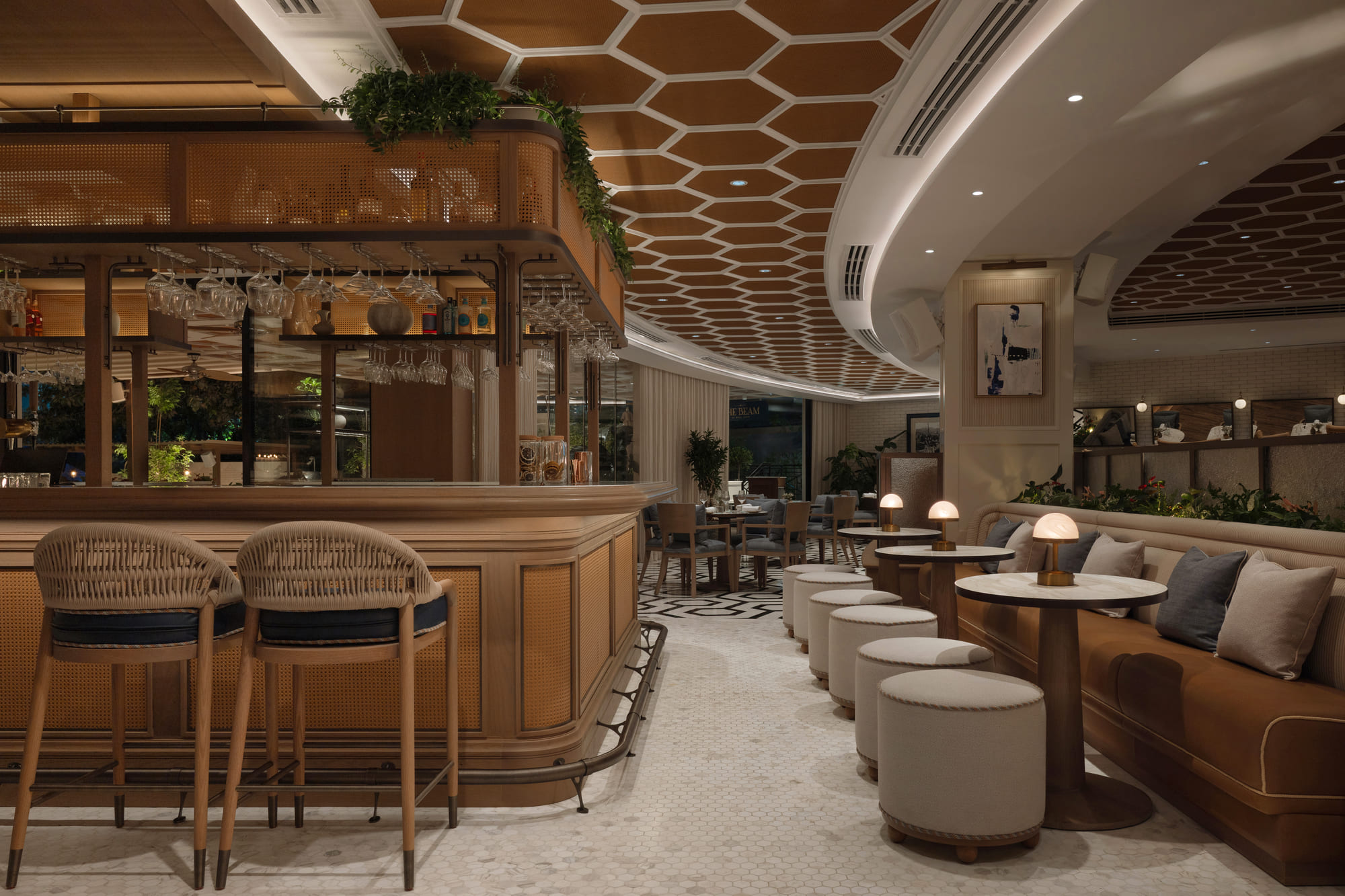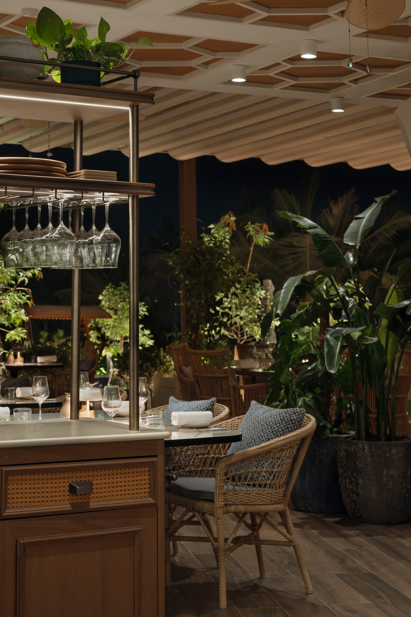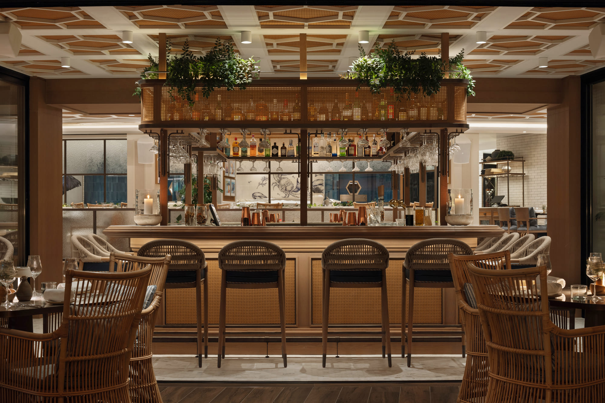 Technical considerations included integrating concealed induction equipment within the breakfast counter and reworking the ceiling design without structural changes, allowing the addition of rattan finishes to existing forms. The flexible design of the bar ensures that it can operate efficiently across all seasons, serving both internal and external guests.