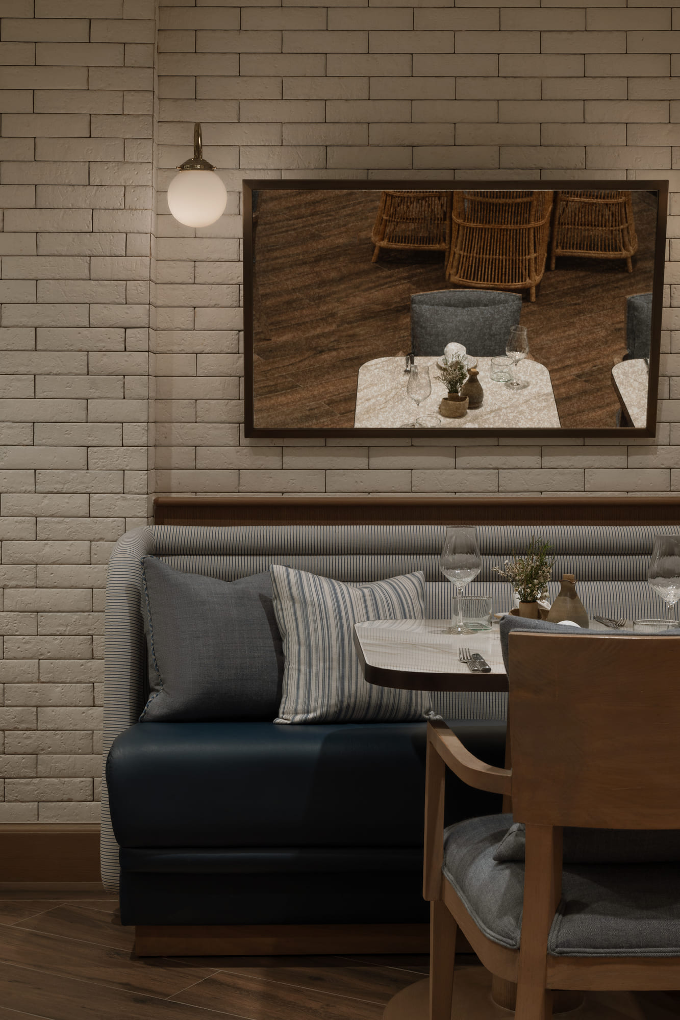 The resulting atmosphere is relaxed and understated, with a coastal sensibility that’s more intuitive than thematic. A sophisticated palette of muted blues, sandy beiges, and soft tan tones runs throughout, offering a calm backdrop that feels grounded yet uplifting. Lighting was carefully considered to complement the interior throughout different times of day, helping to set a welcoming tone from breakfast to dinner.