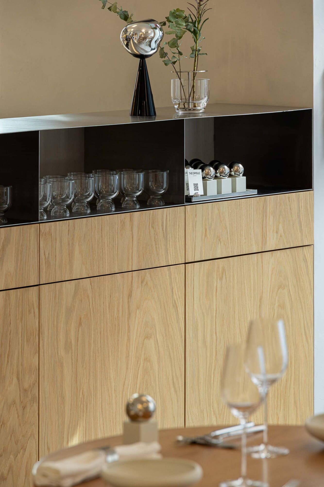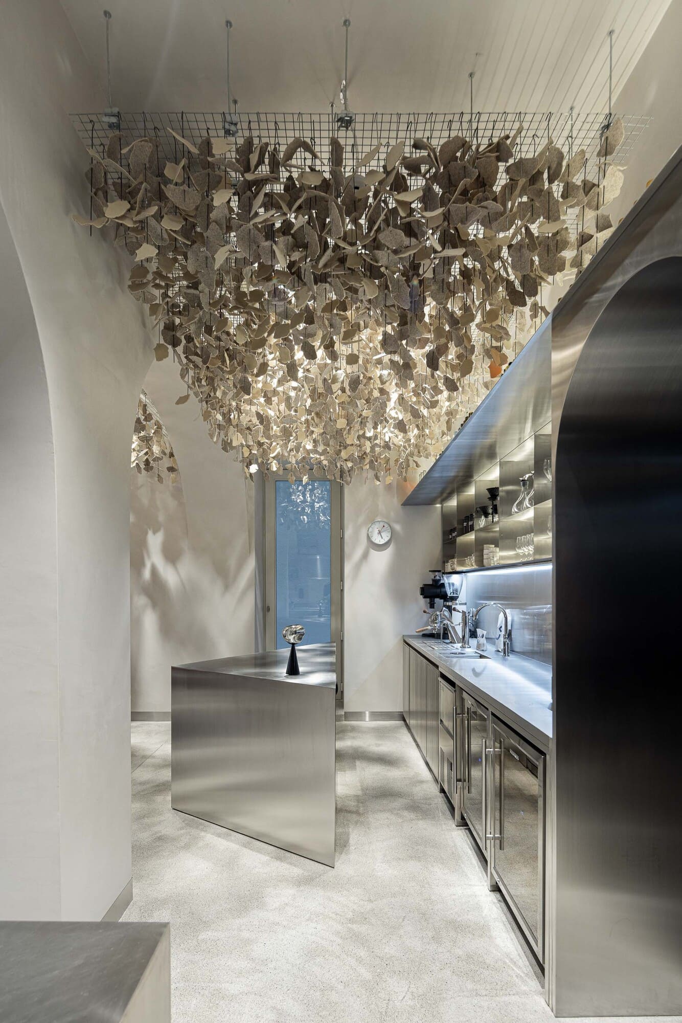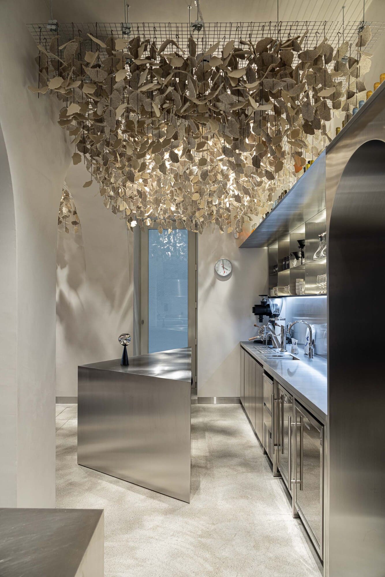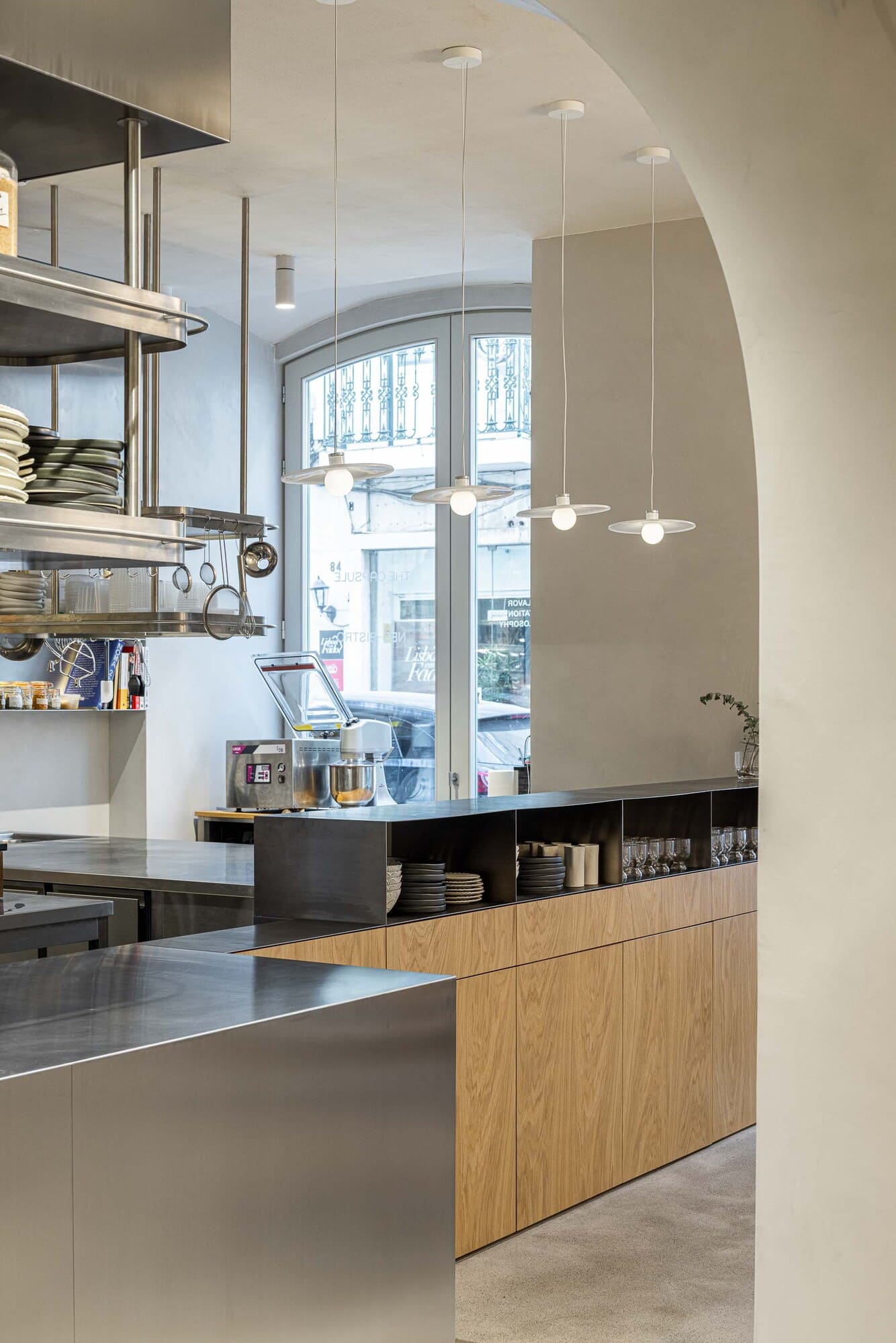 The resulting atmosphere is one of quiet elegance, where simplicity enhances the overall spatial experience, concealing technical complexity while embracing the owners’ dining concept — combining bakery, kitchen, bar, and café.