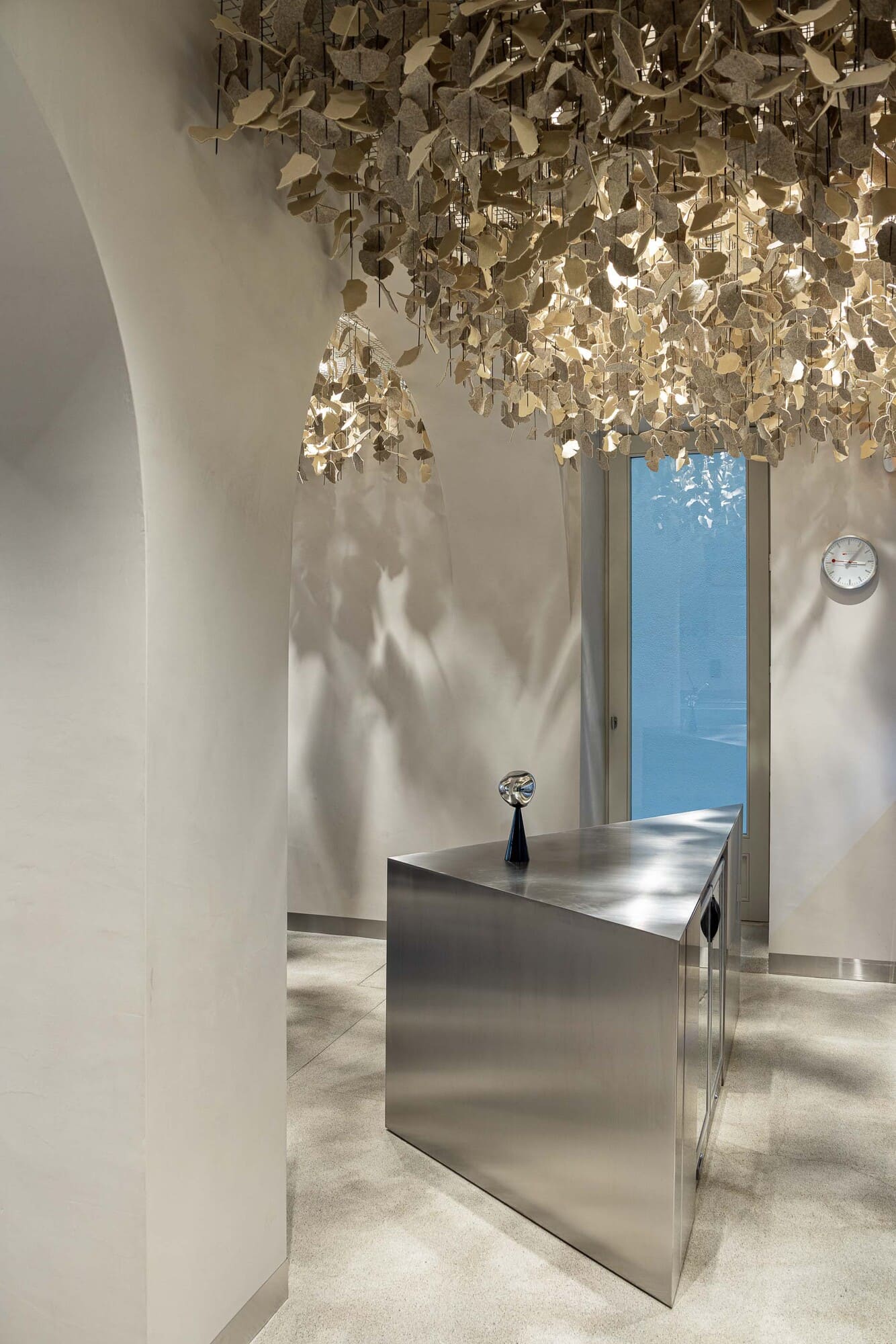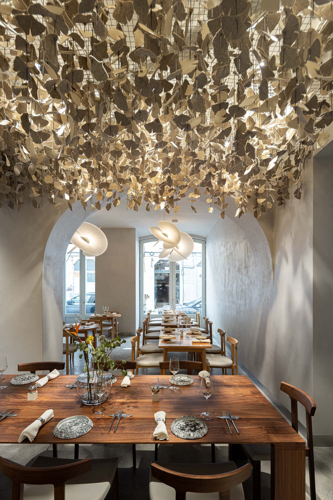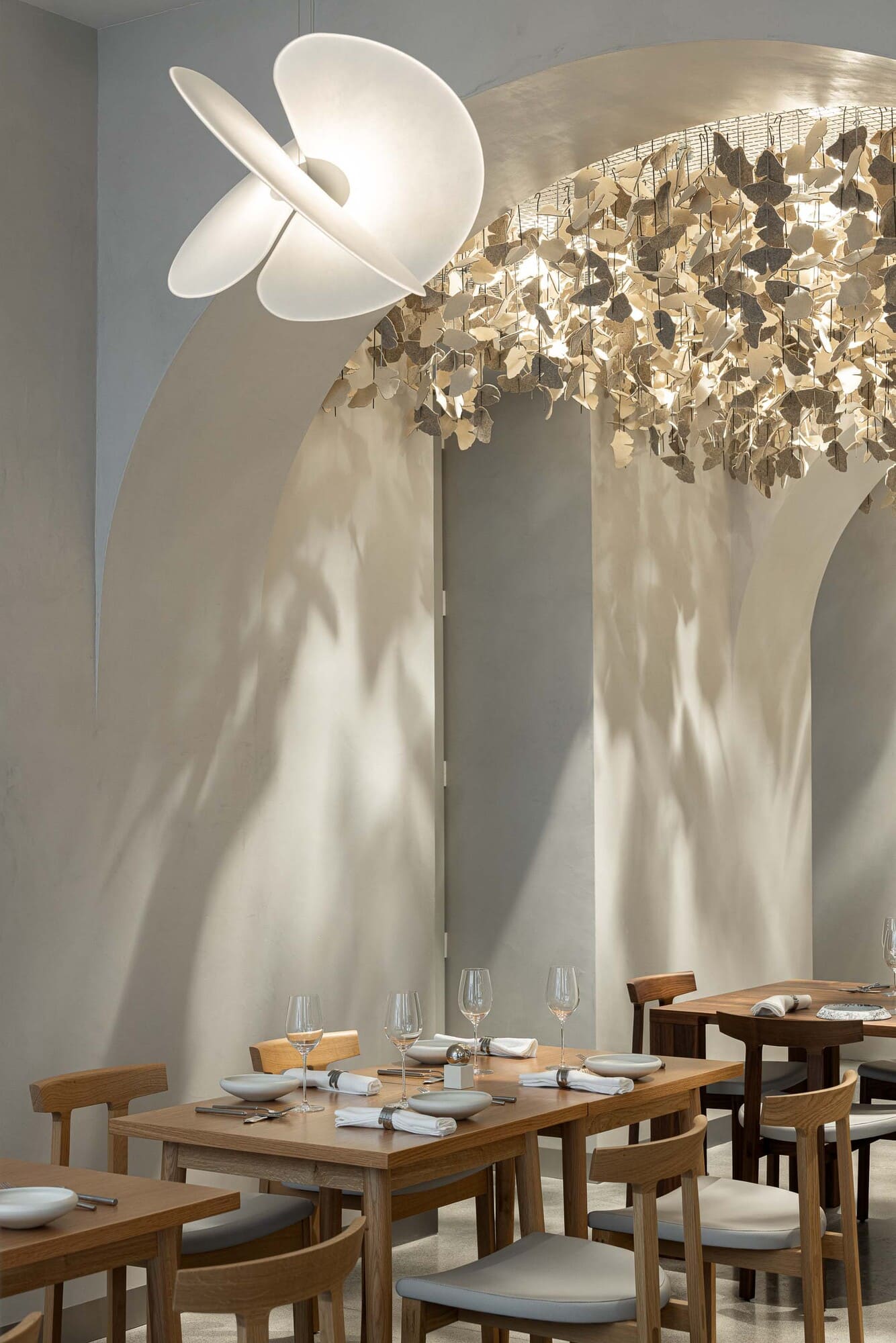 Lighting is both diffuse and striking, articulated through large fan-shaped fixtures that punctuate the first space, and Ginkgo Biloba leaves crafted in burel, creating a welcoming and delicate effect.