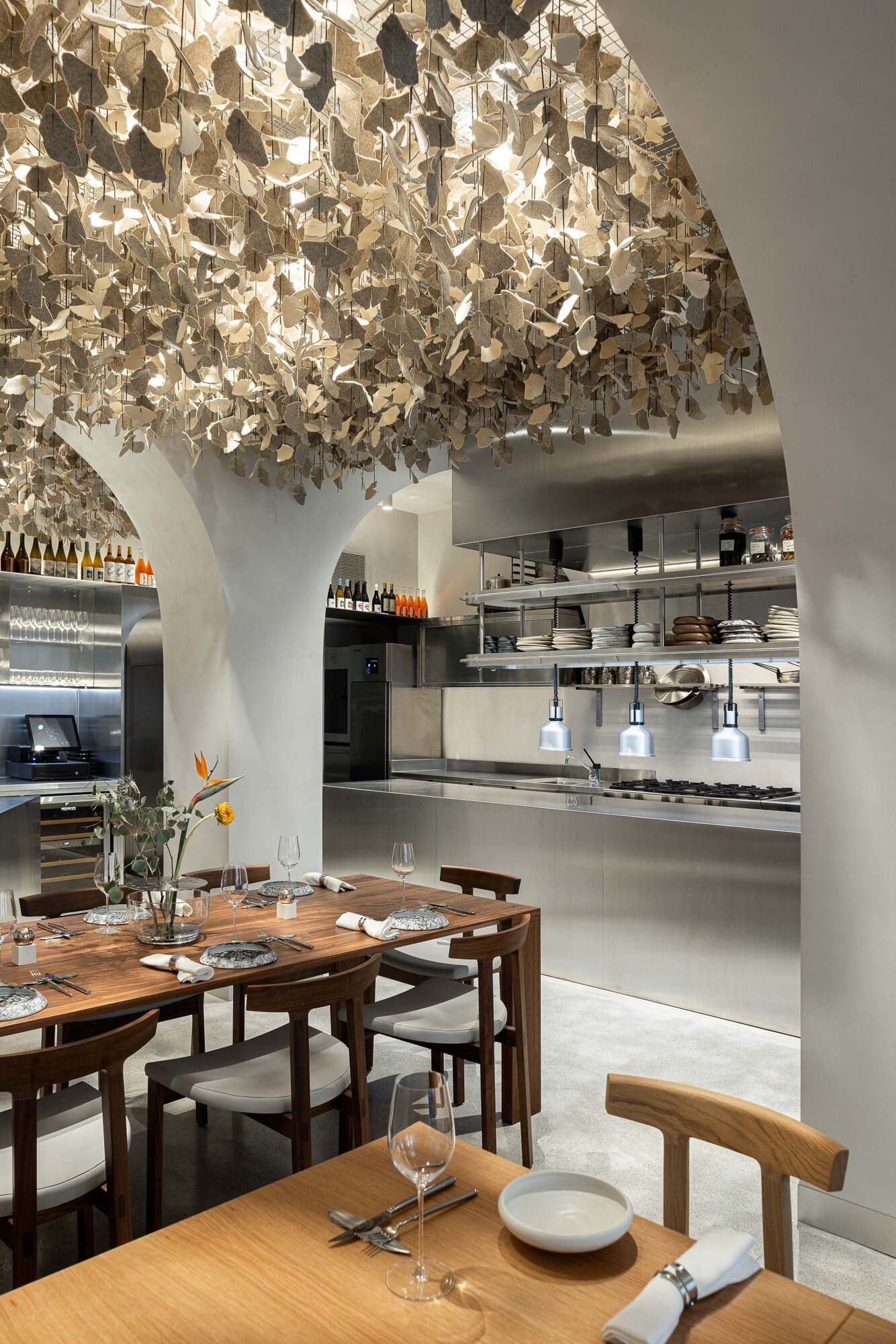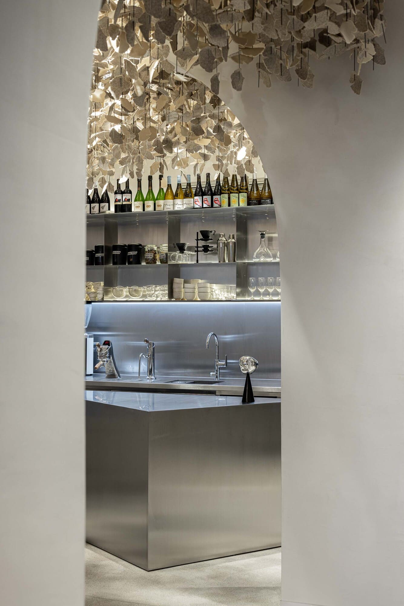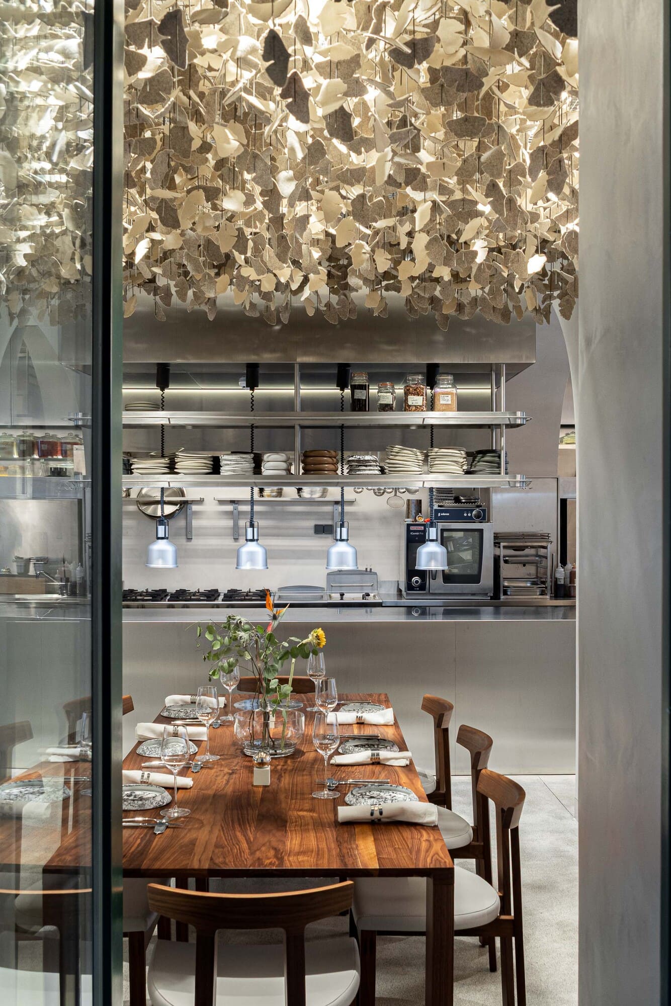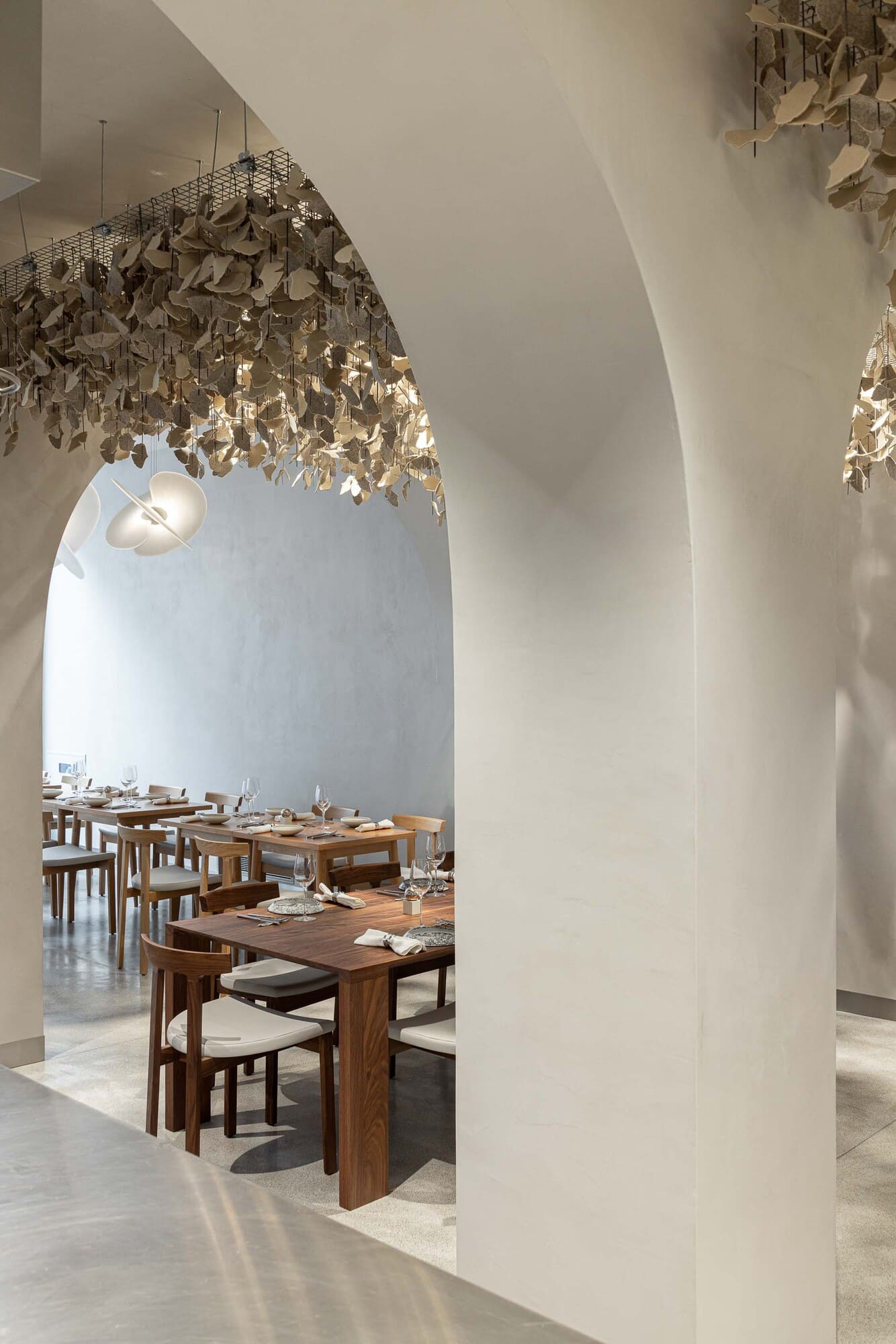 Lighting is both diffuse and striking, articulated through large fan-shaped fixtures that punctuate the first space, and Ginkgo Biloba leaves crafted in burel, creating a welcoming and delicate effect.
