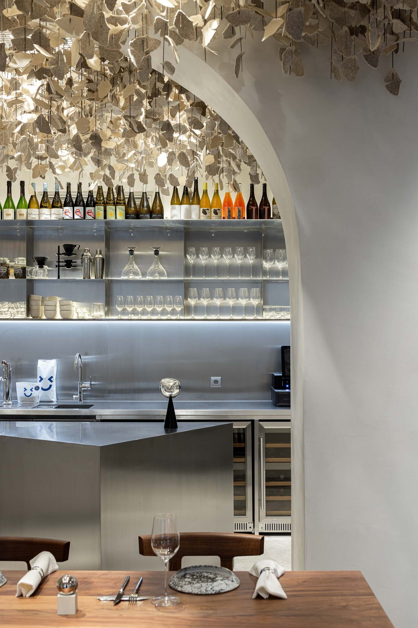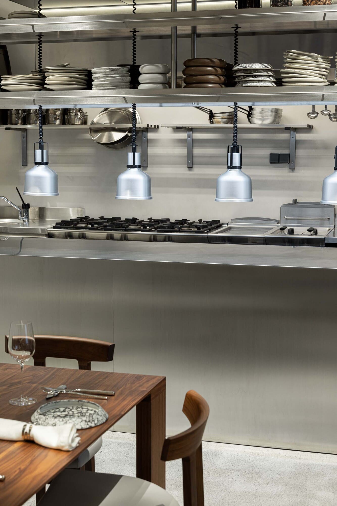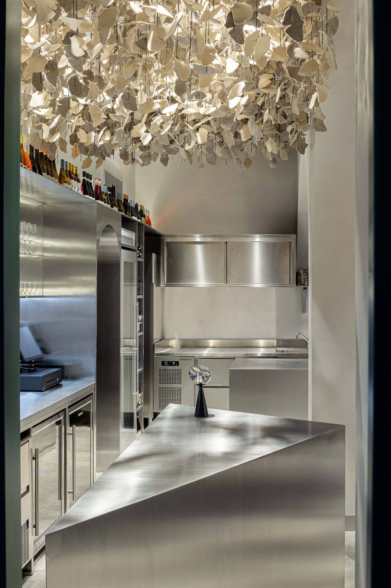 A continuous counter runs along the space, separating the service and kitchen areas from the dining room. Toward the back, a triangular island defines the bar and café area. The restrooms are discreetly hidden beyond a circulation tunnel.