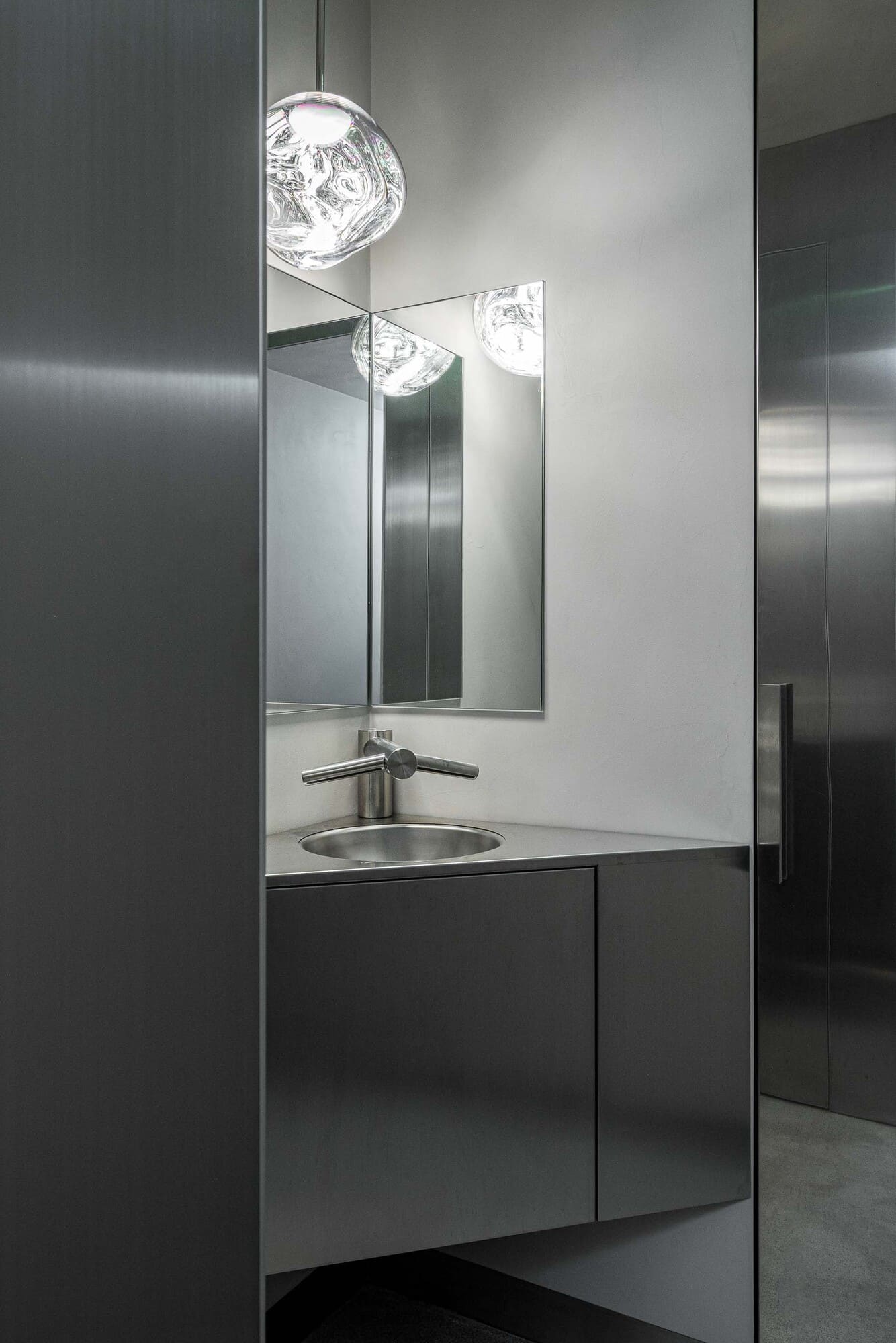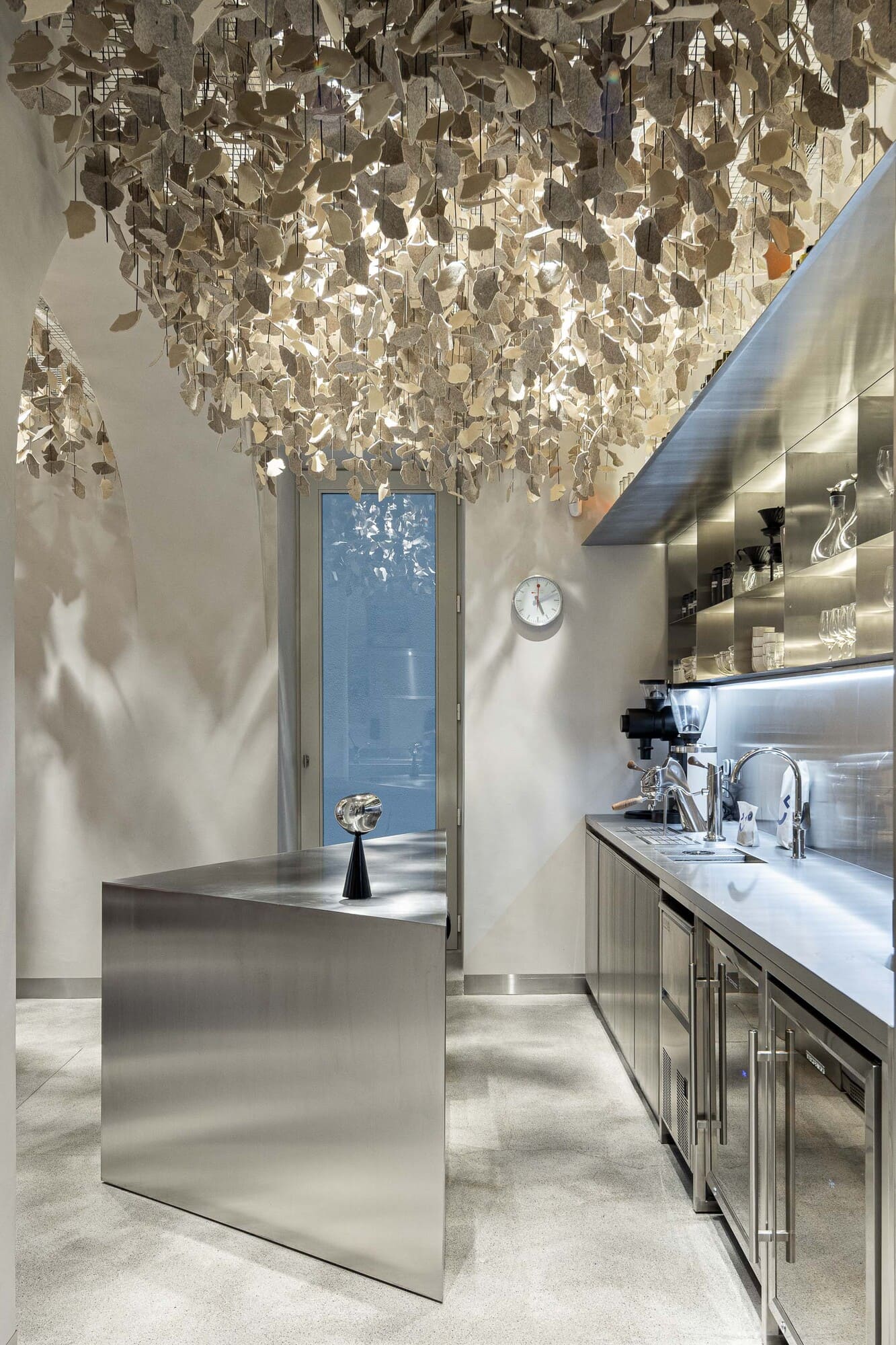 Four arches now assume a sculptural presence, coated in a light gray tone that harmonizes with the walls and ceilings. The continuous terrazo flooring reinforces the neutrality of the space, allowing the new stainless-steel elements and the furniture in oak, walnut, and leather to stand out.
