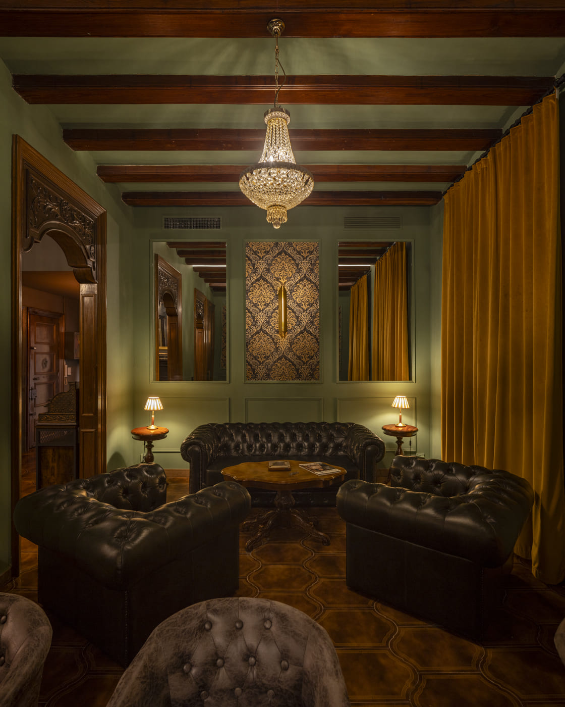 Deep green tones, elegantly textured wallpapers, antique mirrors, classic chandeliers, and indirect lighting integrated into the wooden beams create a warm, sophisticated, and enveloping atmosphere. The main furnishings, such as Chesterfield sofas, Elizabethan pieces, and Victorian touches, reinforce the space’s timeless and stately character.