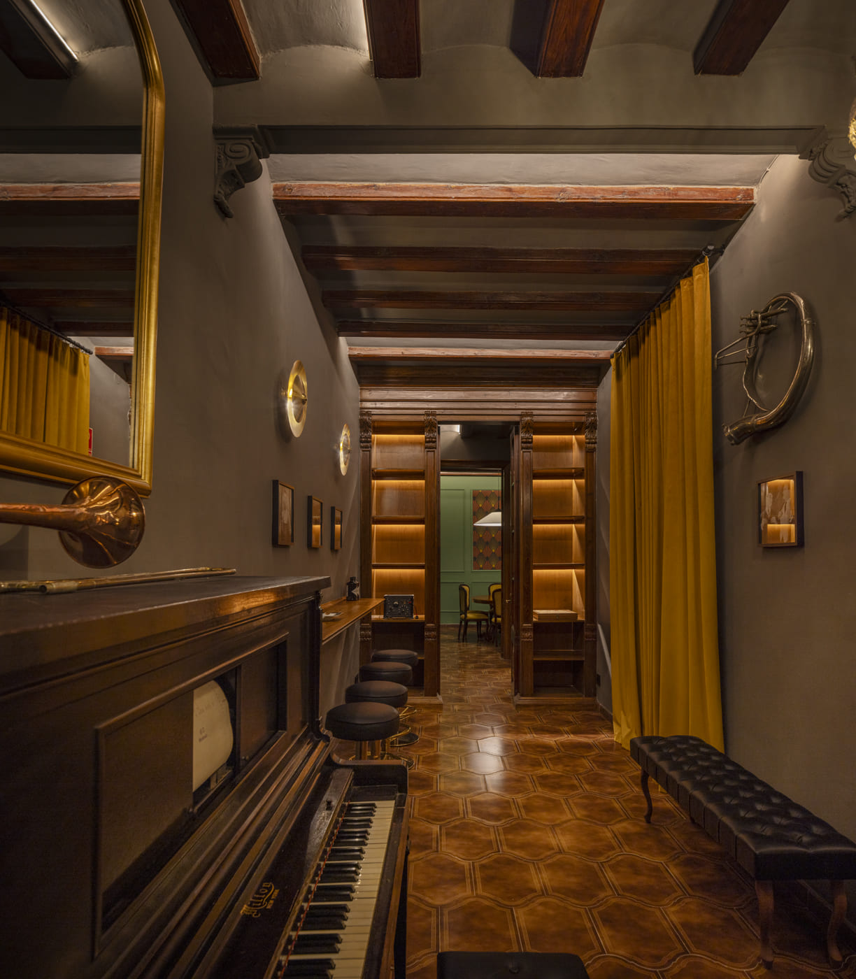 In the hallways and transitional areas, a more subdued atmosphere envelops the visitor: gray tones, dark furniture, and contrasting golden details such as hanging wind instruments, brass sconces, and antique mirrors add shine and depth without disrupting the intimacy of the space.