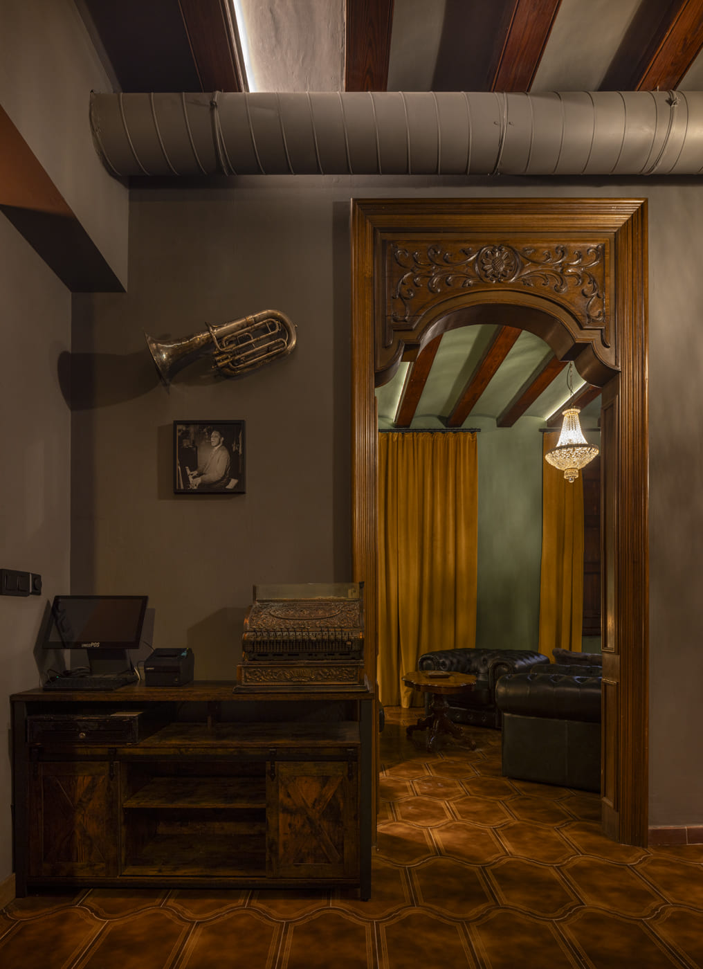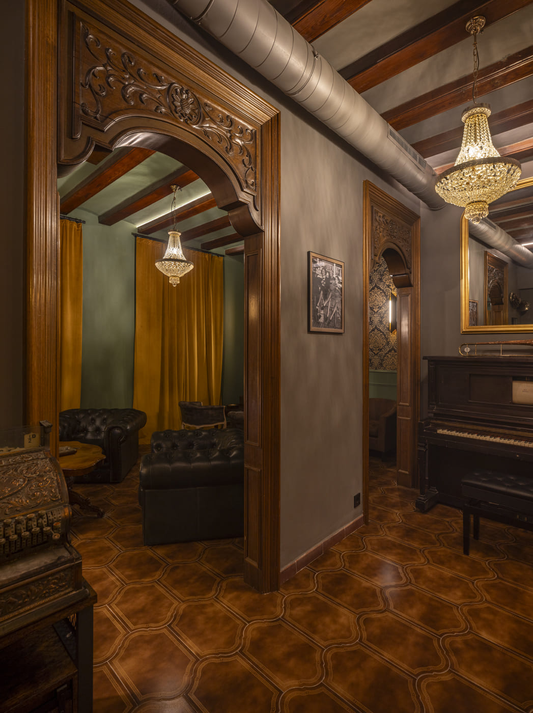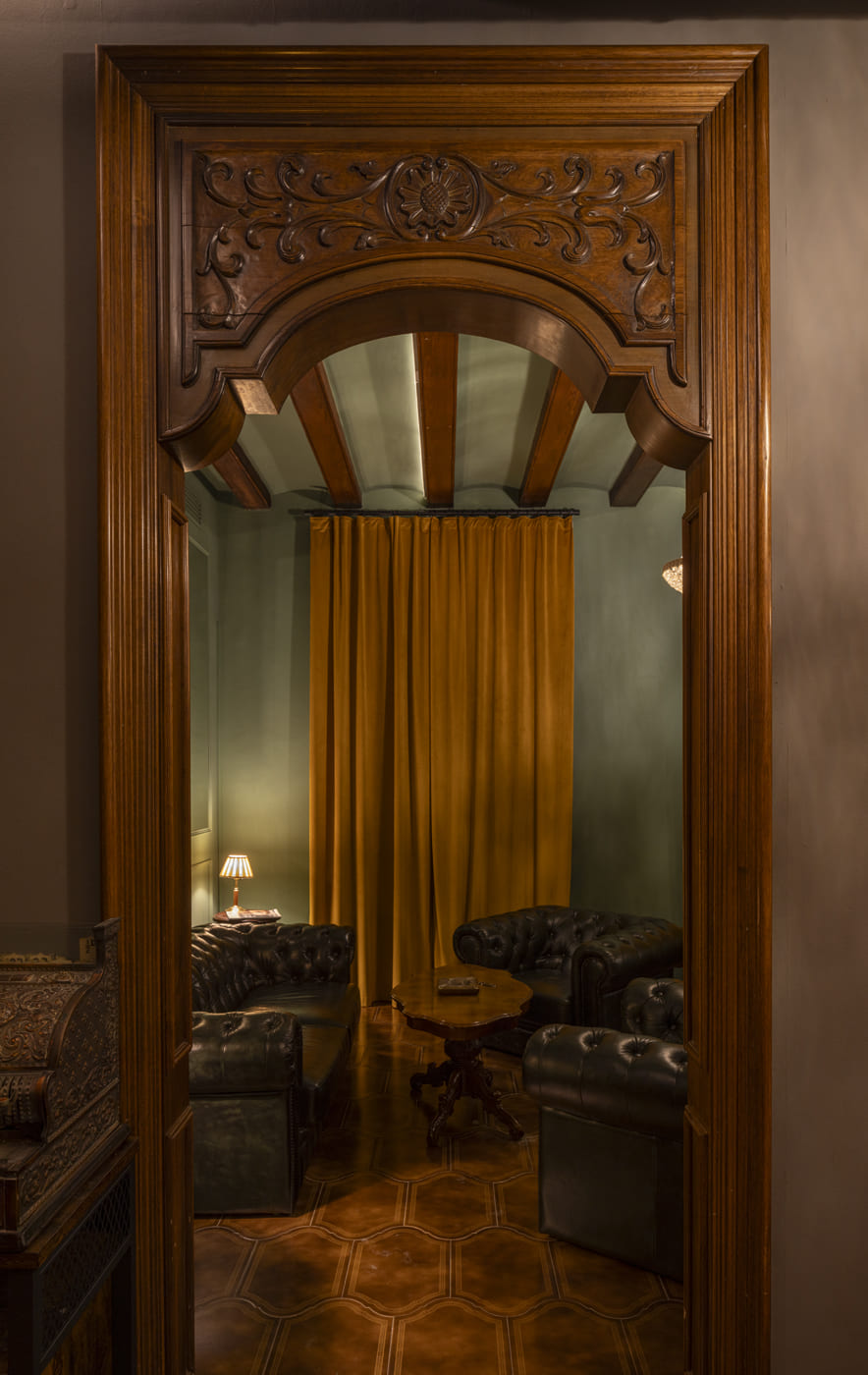 The project respected and enhanced the original architecture, preserving historic elements such as the woodwork, exposed ceiling beams, and tobacco-colored ceramic flooring, which connects directly with the world of the cigar lounge. This architectural foundation has been reinterpreted through an aesthetic language inspired by the American underground clubs of the 1920s and 1930s.