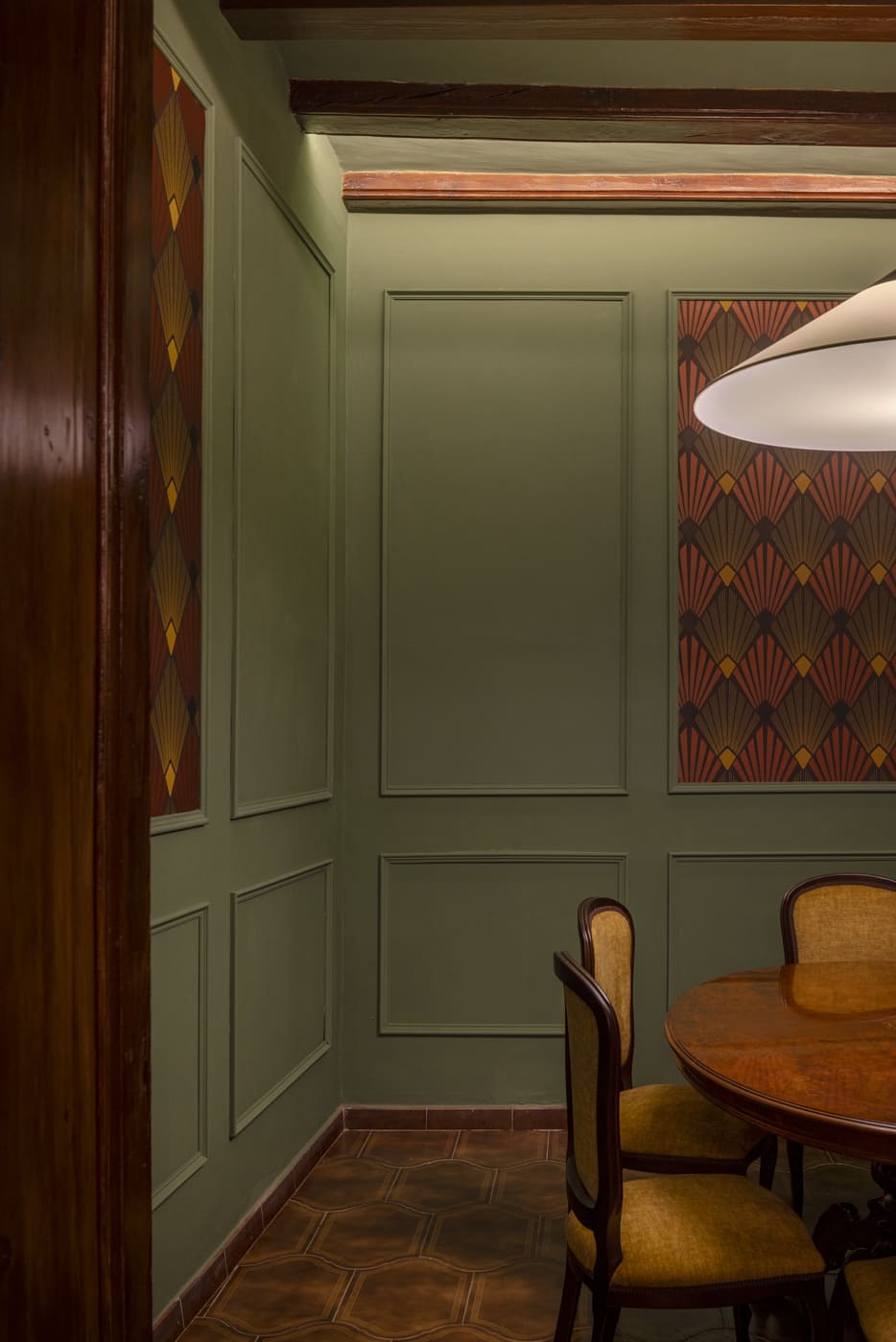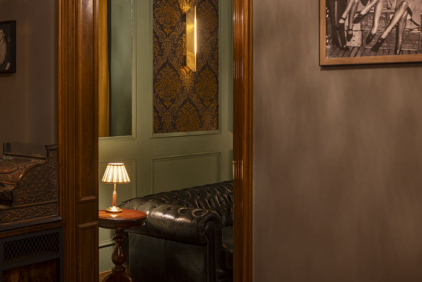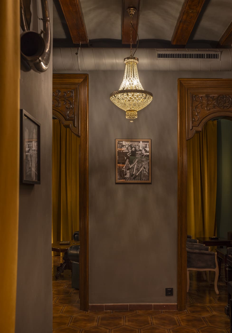 The project respected and enhanced the original architecture, preserving historic elements such as the woodwork, exposed ceiling beams, and tobacco-colored ceramic flooring, which connects directly with the world of the cigar lounge. This architectural foundation has been reinterpreted through an aesthetic language inspired by the American underground clubs of the 1920s and 1930s.