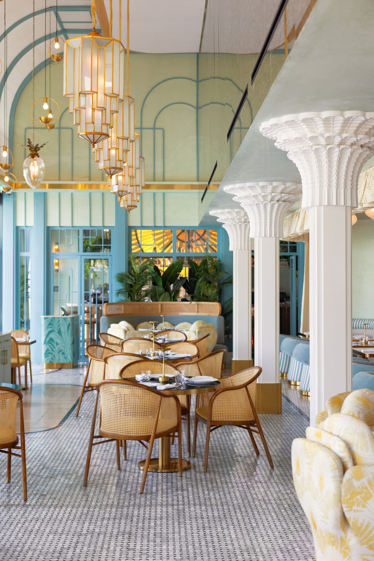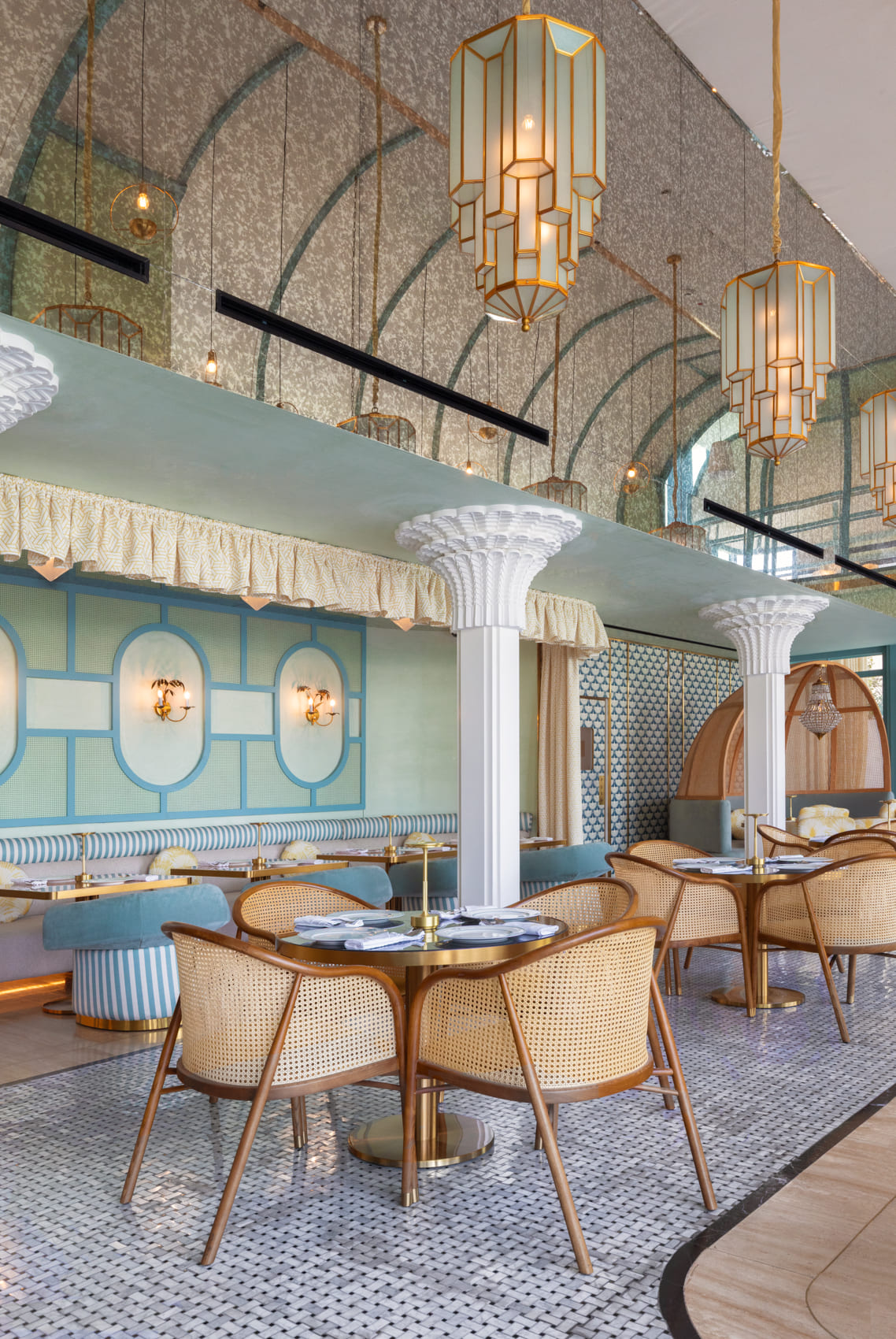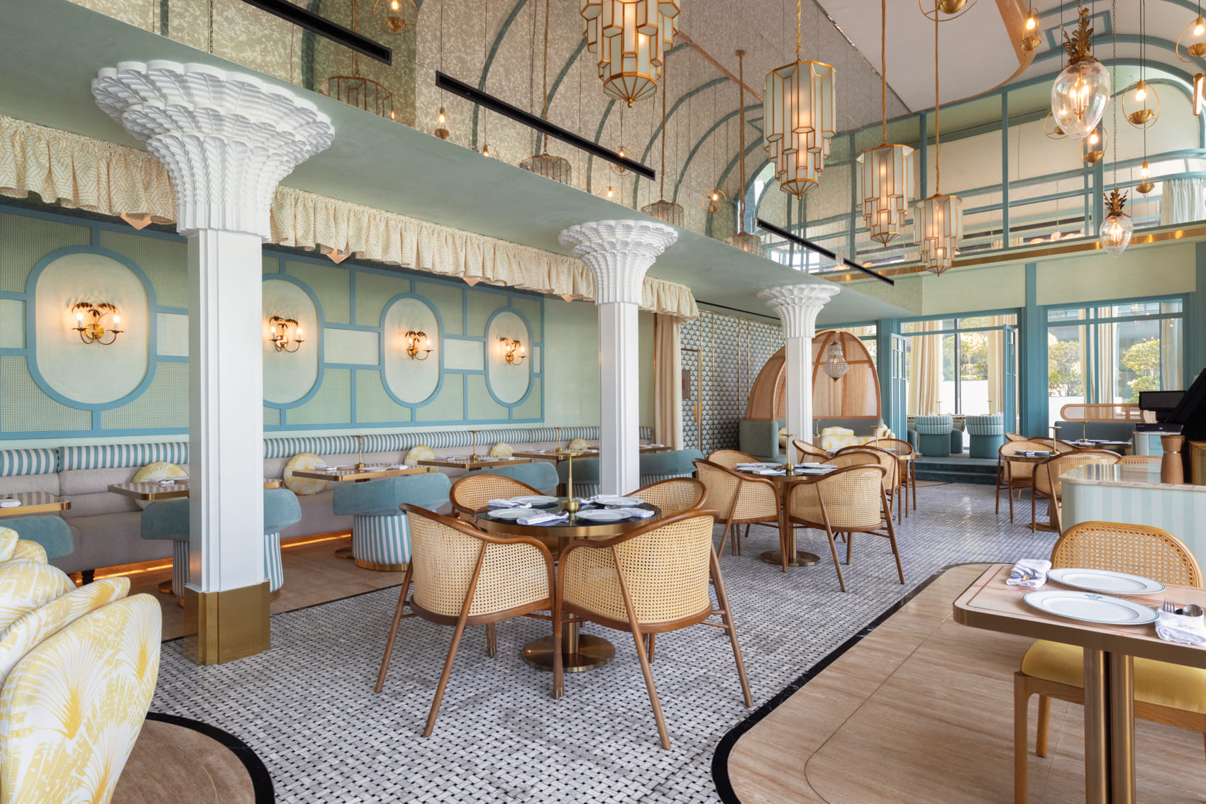 The interiors balance playful art deco geometry with lush tropical planting, reinforcing the “Tropical Sensation” theme at every turn. Striped panelling, bold feathered chandeliers, and patterned flooring sit harmoniously alongside swaying palms and soft velvet banquettes, creating an environment that is both opulent and inviting.