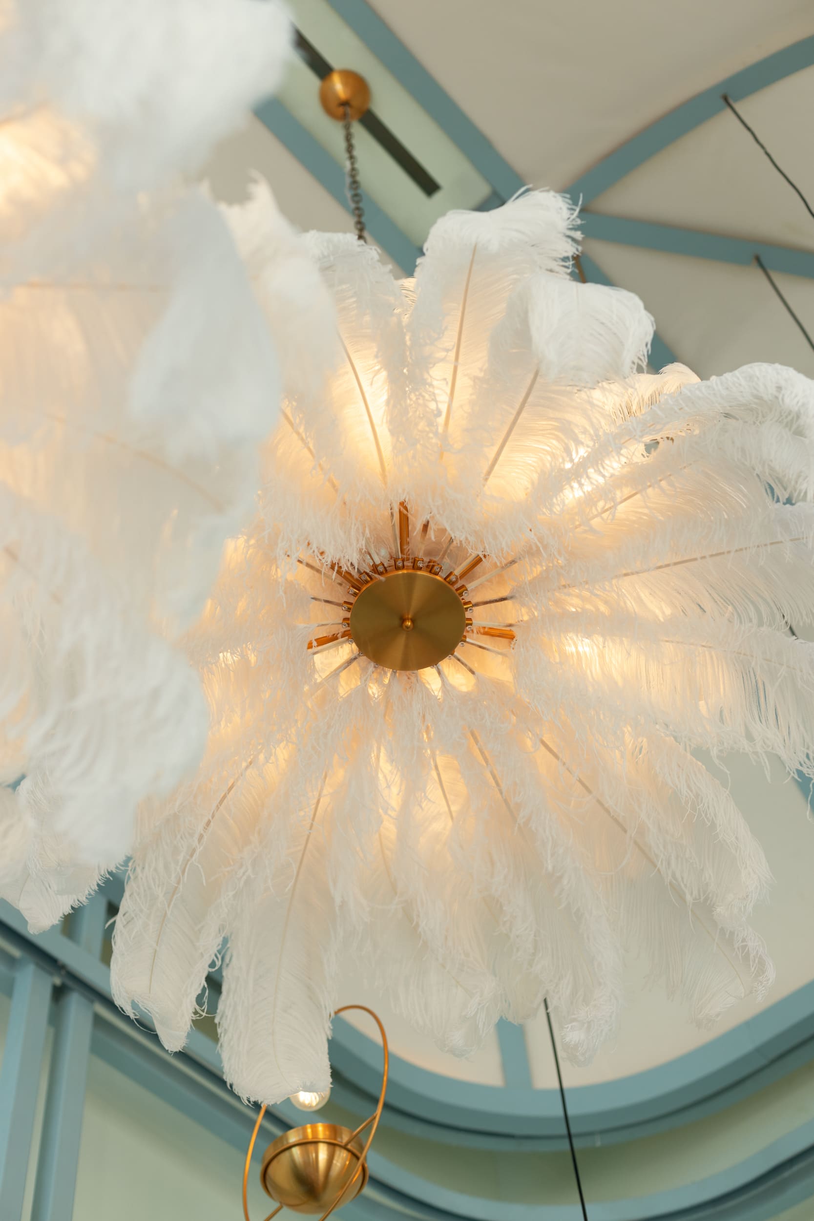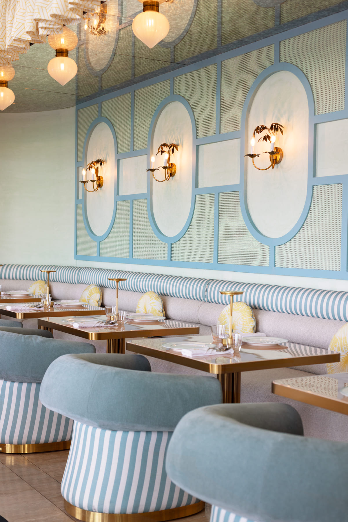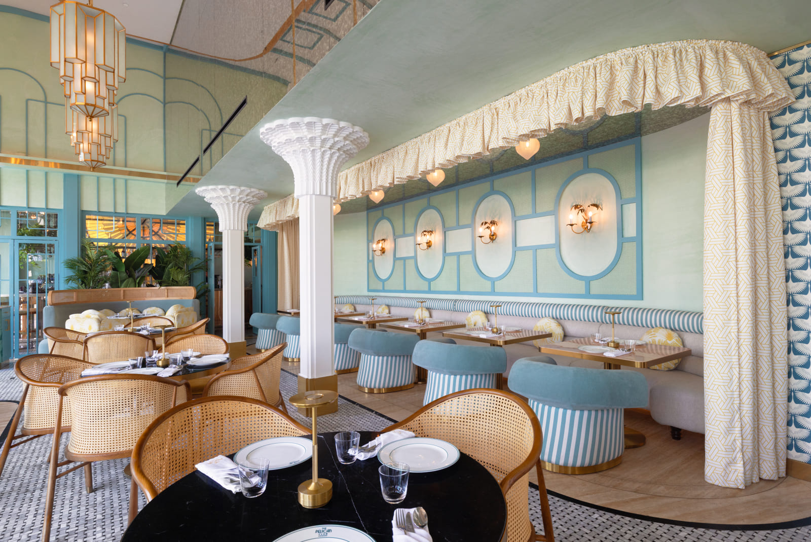 The interiors balance playful art deco geometry with lush tropical planting, reinforcing the “Tropical Sensation” theme at every turn. Striped panelling, bold feathered chandeliers, and patterned flooring sit harmoniously alongside swaying palms and soft velvet banquettes, creating an environment that is both opulent and inviting.