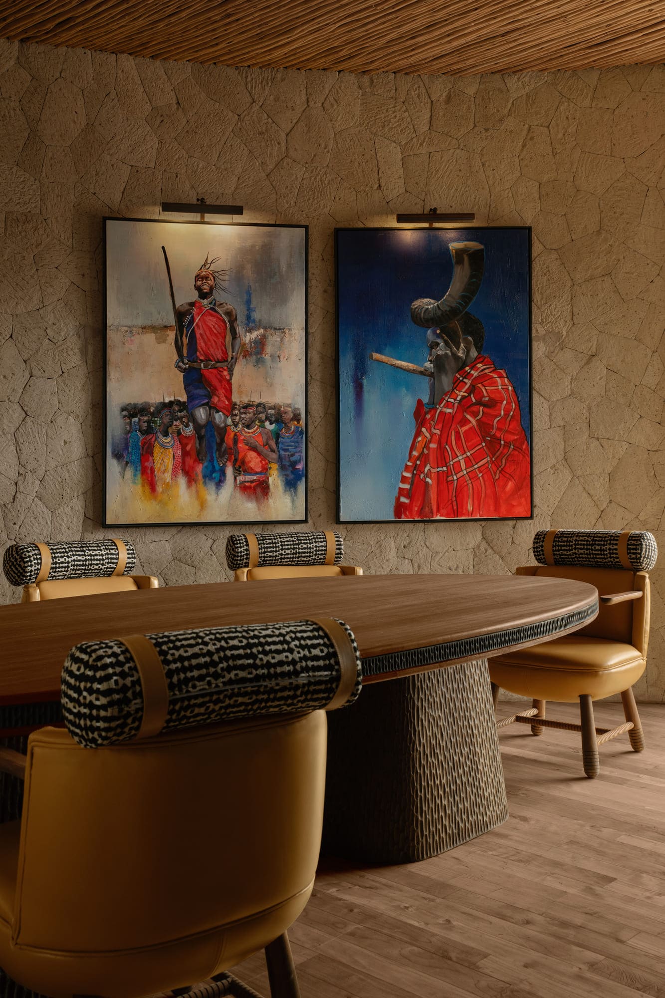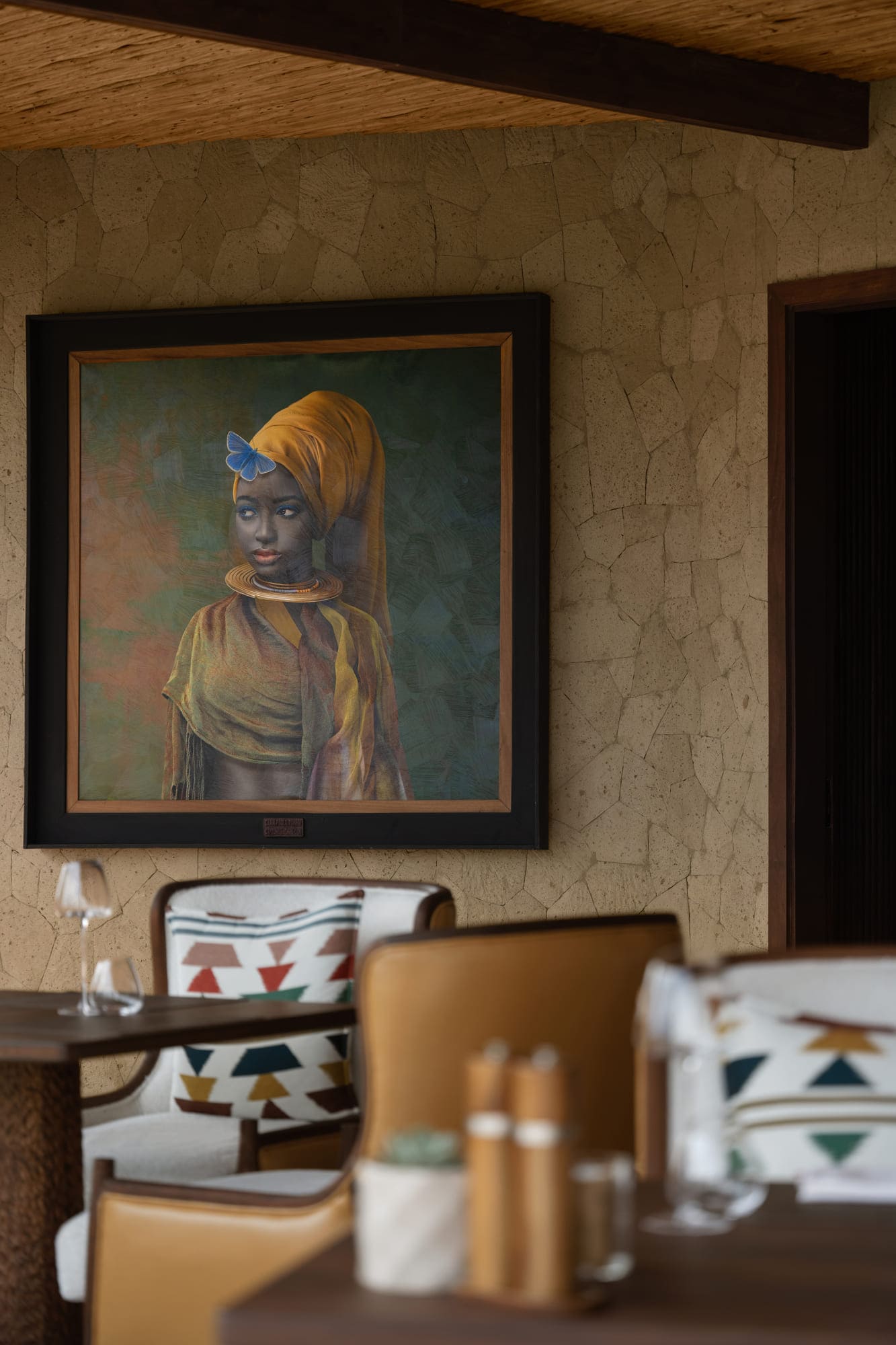 In the restaurant, dramatic portraits of local women by Gian Paolo Tomasi, a Malindi-based artist, guide guests toward two signature dining experiences: the wine cellar and Upeo, the sky deck. His photographs elevate the everyday into timeless art, honoring the grace and strength of the women of Kenya. Complementing these works are a series of striking portraits by Ugandan-born artist Ibrahim Muwanga, whose expressive style brings contemporary warmth and intimacy to the interiors. His work, created especially for the camp, offers a personal, soulful counterpoint to the more documentary-style pieces—adding richness and emotional depth to the guest experience.