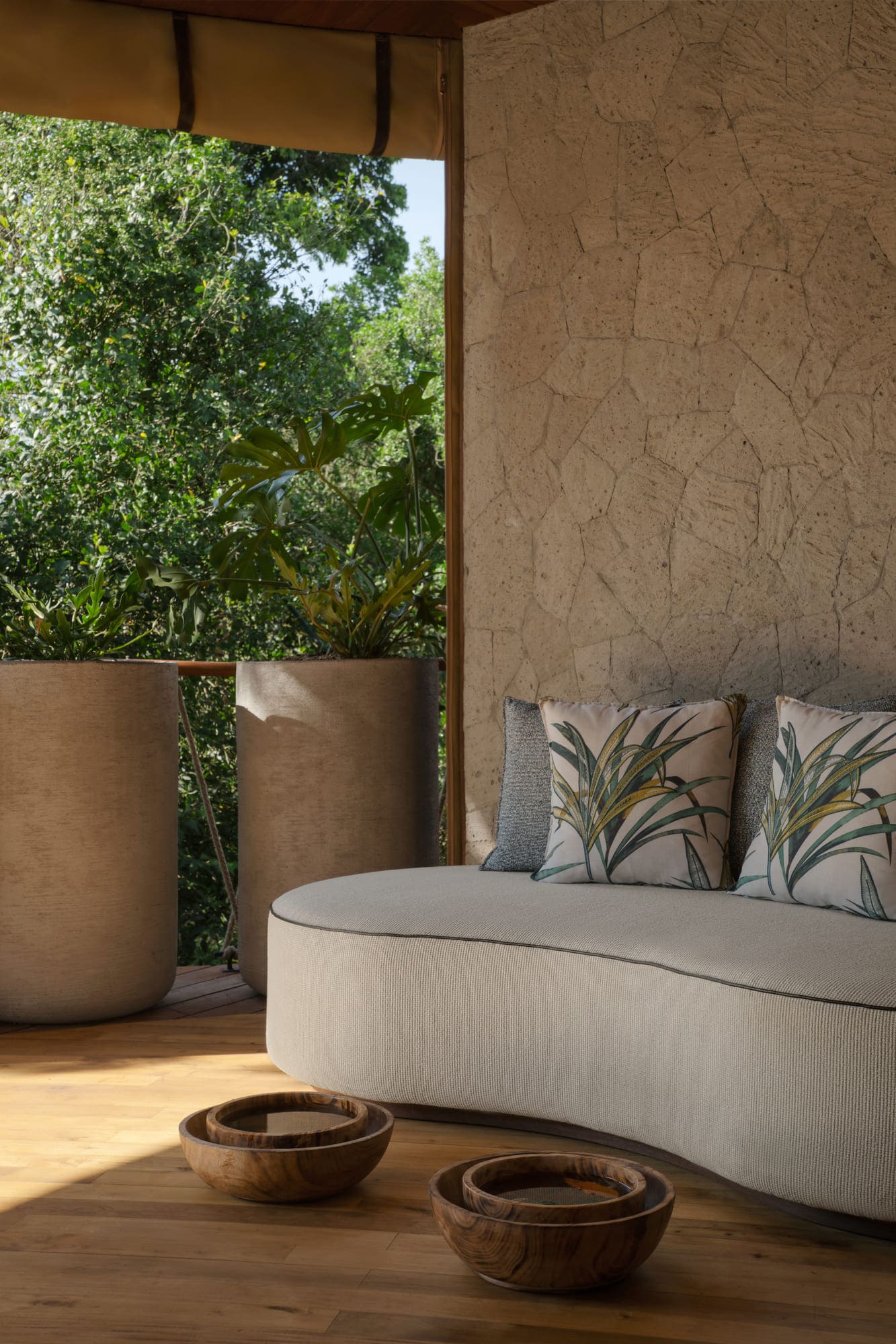 Furnishings and finishes further echo the biophilic intent. Organic forms, earthy textures, and a palette drawn from the land itself—ochres, sage greens, soft greys—create an atmosphere that feels rooted, grounded, and alive. Materials like raw timber, leather, and handwoven textiles reflect the artisanal touch of the region and the lived-in textures of nature.