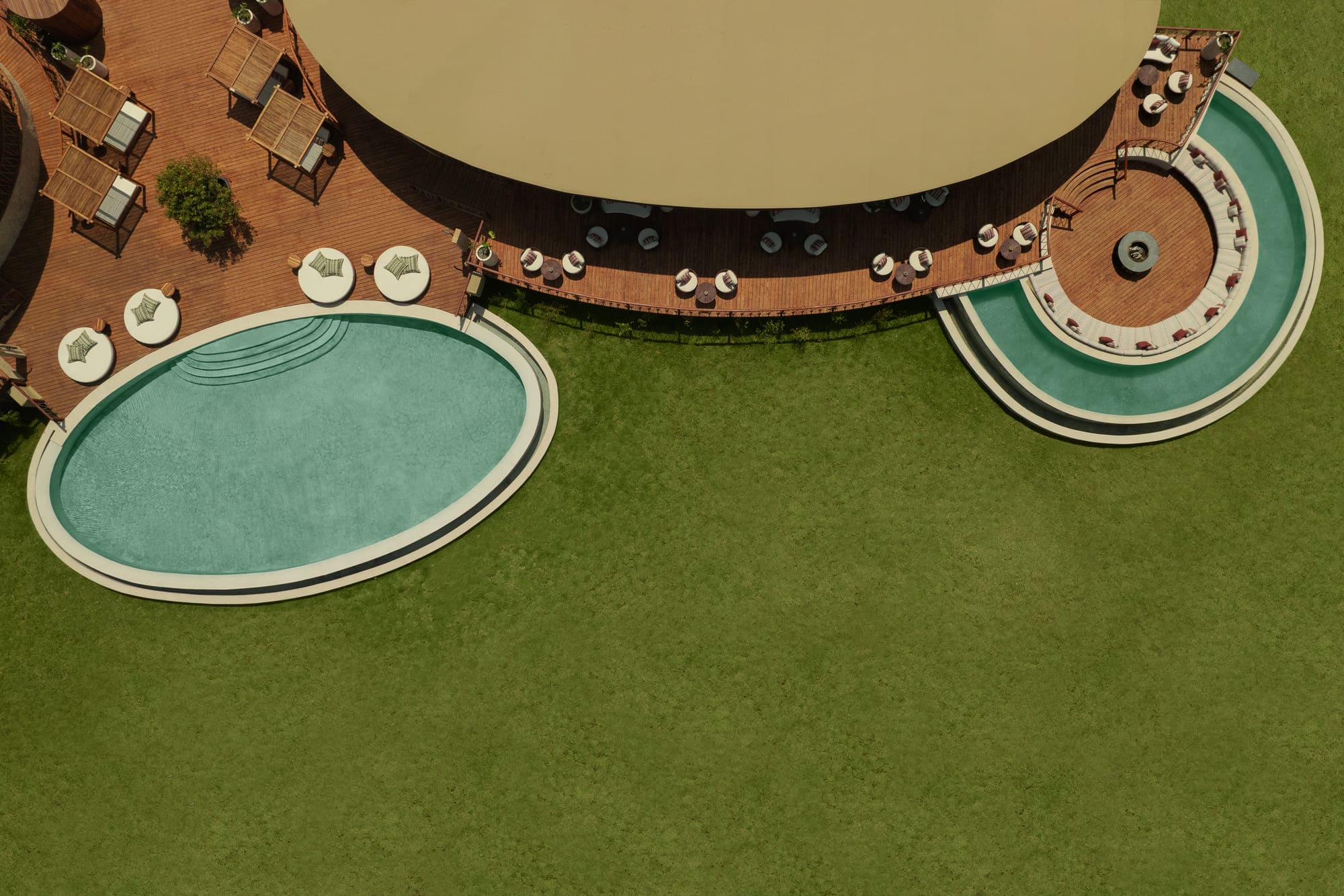 “The public buildings and guest tents follow the same principle of soft, flowing forms inspired by nature’s rhythm. With gentle curves and layered silhouettes, they sit quietly within the landscape, never overpowering. Also, we elevated the structures so they would sit lightly on land, almost floating within.”