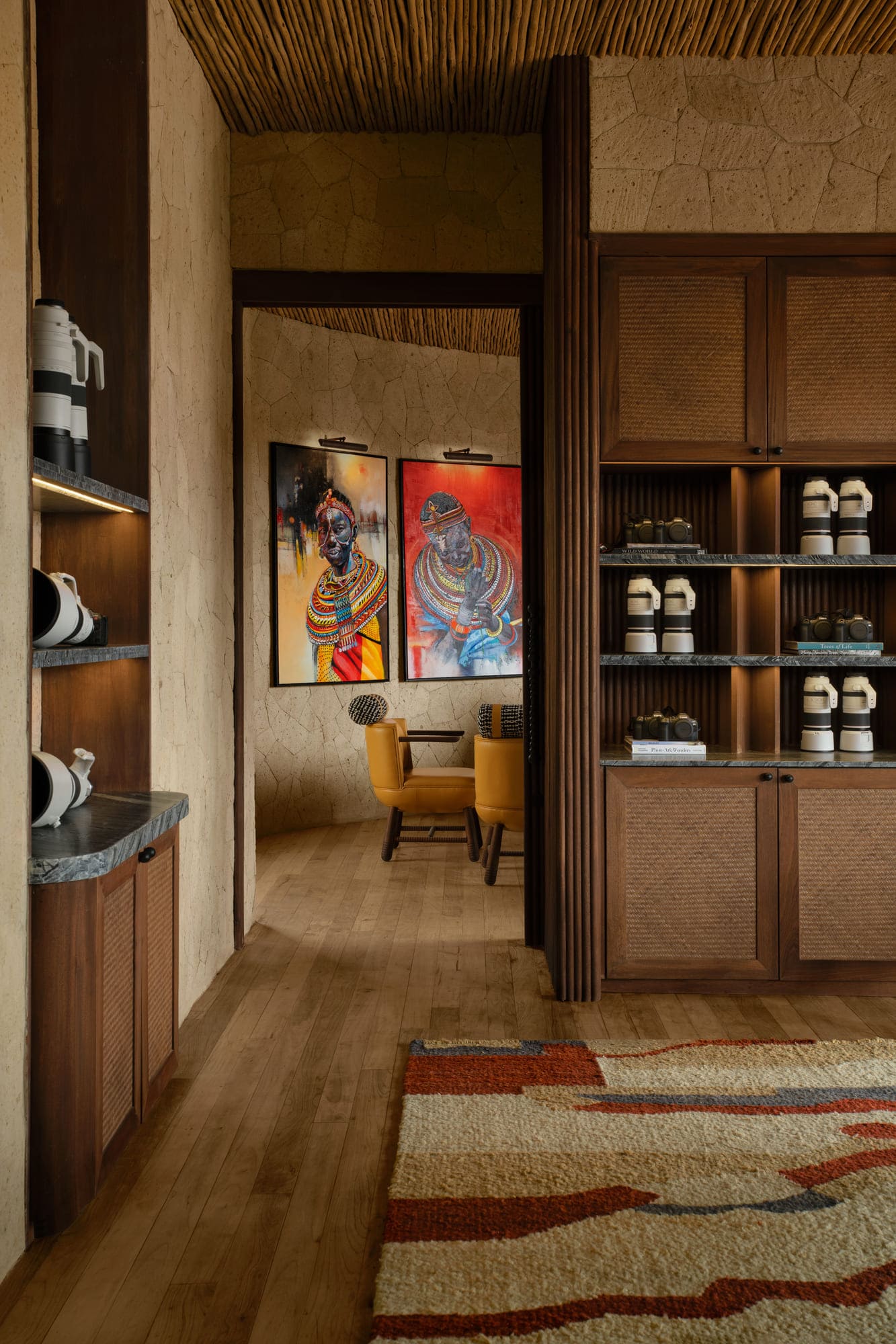 Traditional Maasai beadwork has been integrated into custom joinery and is also featured across operational elements—from minibar accessories to glassware—handmade by artisans from the local community. These details lend symbolic and tactile richness to the guest experience, seamlessly embedding heritage into the rhythm of daily rituals.