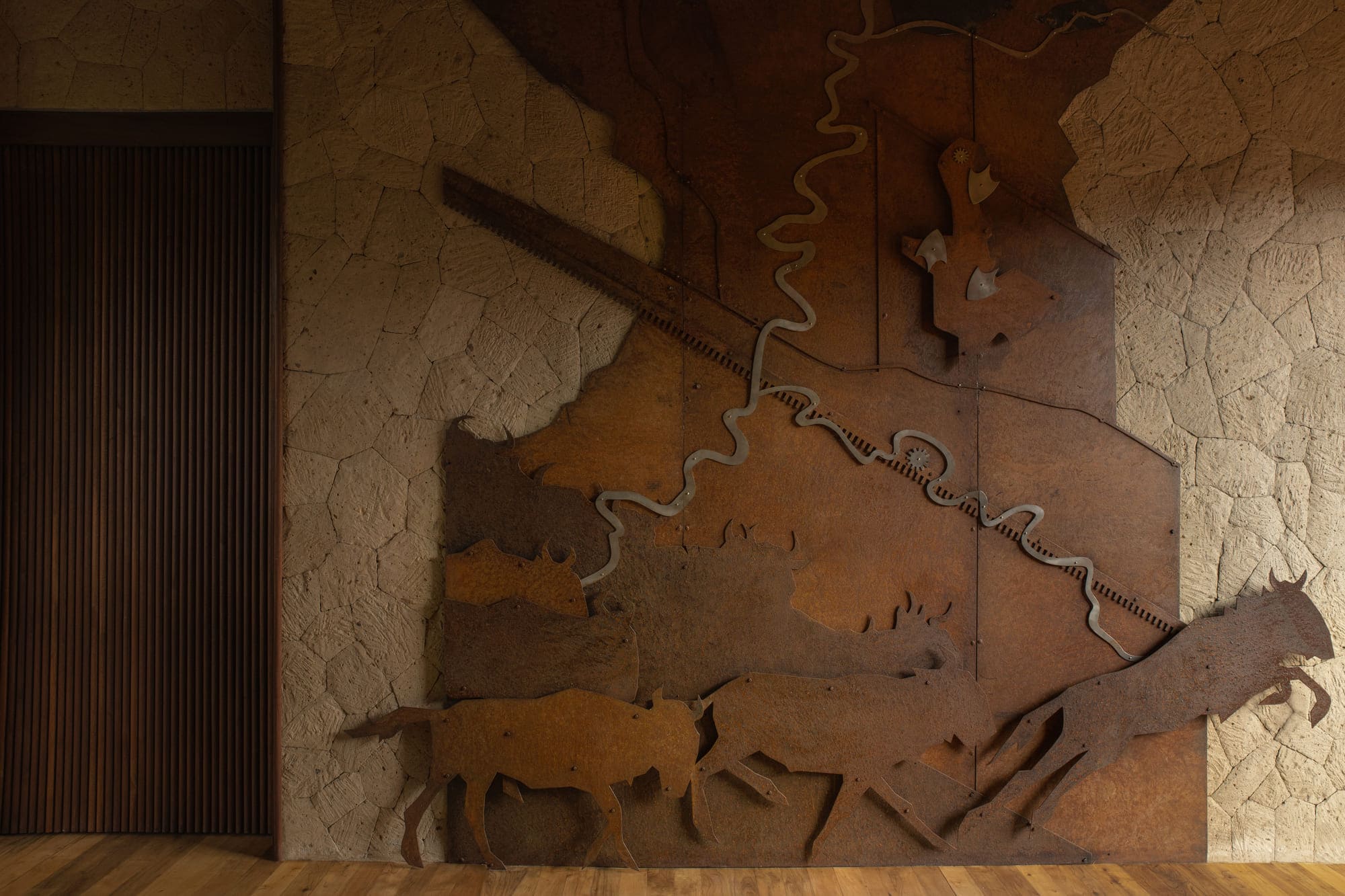 The most iconic and striking piece is the large-scale metal sculpture in the Map Room, illustrating the historic migration in a way that is both authentic and deeply poetic. Created by renowned artist Simon Bannister, the sculpture layers oxidised steel to represent the rugged landforms and uses mirror-polished stainless steel to trace the life-giving rivers.