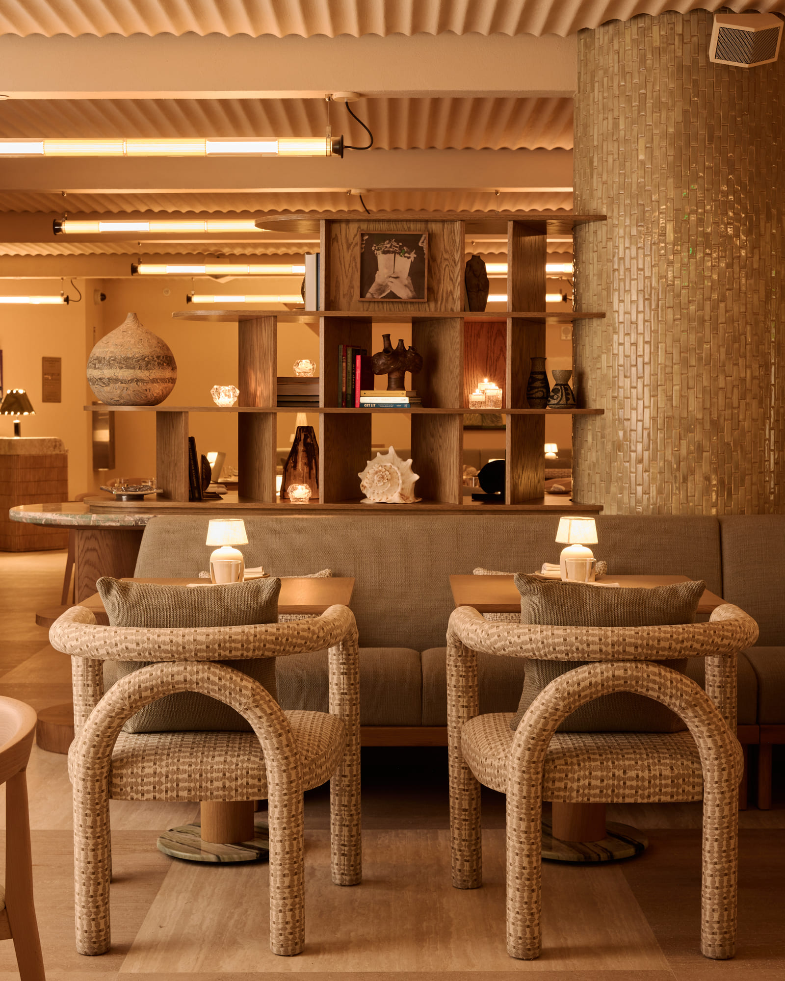 Lighting plays a central role in establishing the lounge’s clubby, soft-retro vibe. Details include the iconic Mantis floor lamp by DCW and sculptural table lamps by Pablo Pardo, chosen to enhance the intimate mood. Every joinery detail, including the DJ booth and bar was designed by ADC & Tuneu, contributing to a holistic and immersive design narrative.