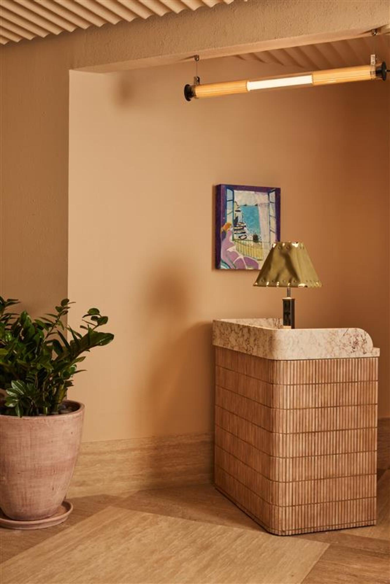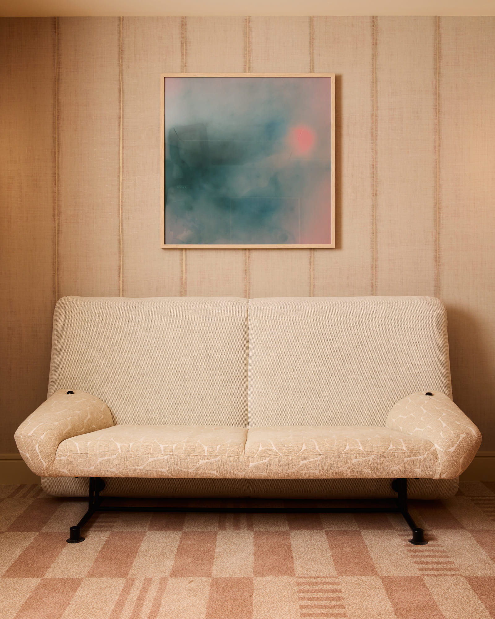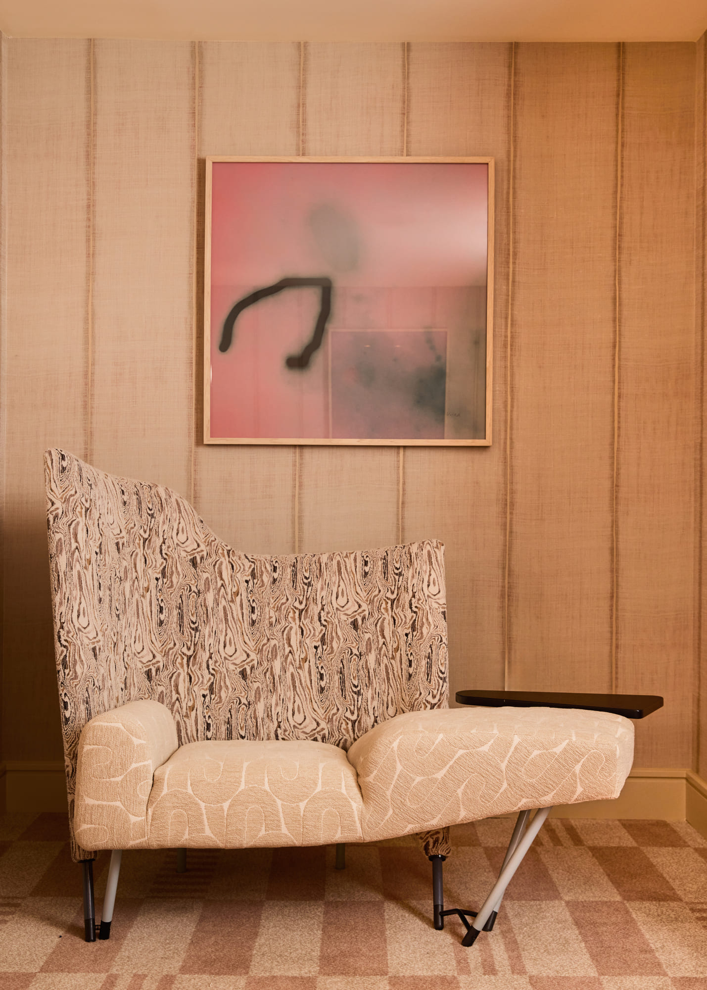 At the end of the space, a striking sculptural screen upholstered in a soft, feminine fabric pays homage to Pauline Baker and brings texture and visual interest to the room. Bar stools designed by ADC & Tuneu draw inspiration from the 1970’s and are upholstered in aqua and tones contrasting the rest in soft peach.