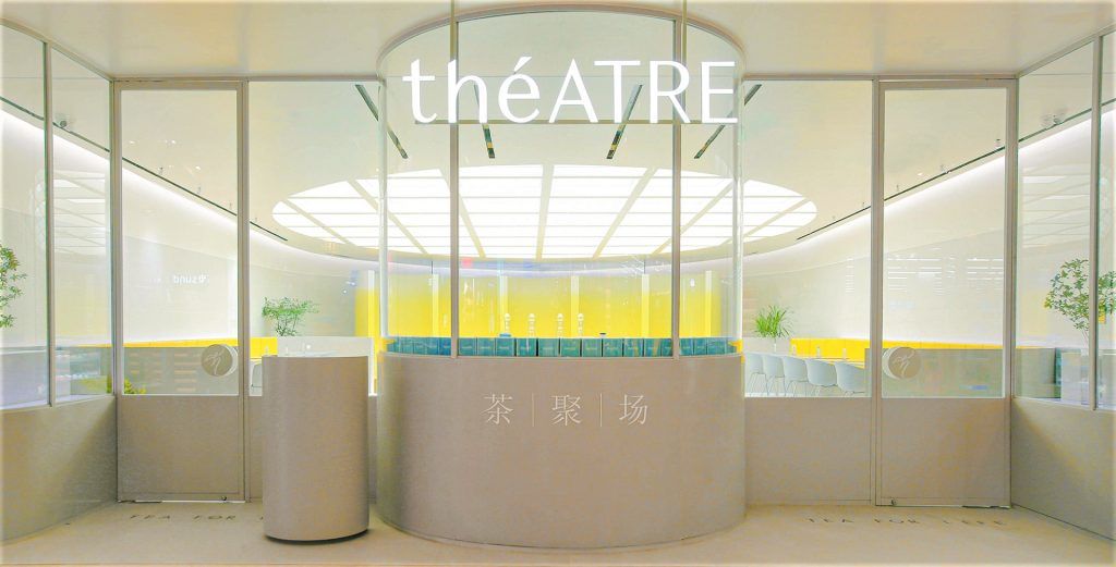 Layout for théATRE project in Sanlitun Taikooli is characterized by a strong architectural approach. The space is organized like an opera theatre, with a central axis of symmetry along which all elements are organized. The main bar is in the center surrounded by platforms where customers can sit. A circular yellow wall in the background is like a curtain, on the sides of which waiters go in and out as if they were actors crossing the theatrical stage. The ceiling has a slight inclination that accentuates the scenographic effects of the perspective, with a large round backlit skylight suggesting the feeling of being under a large glazed vault.