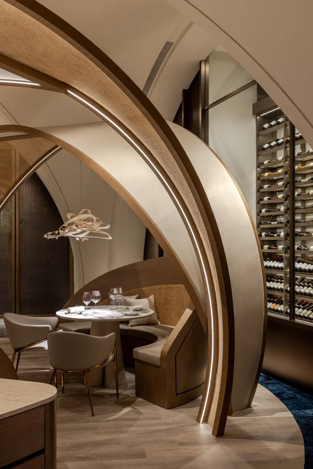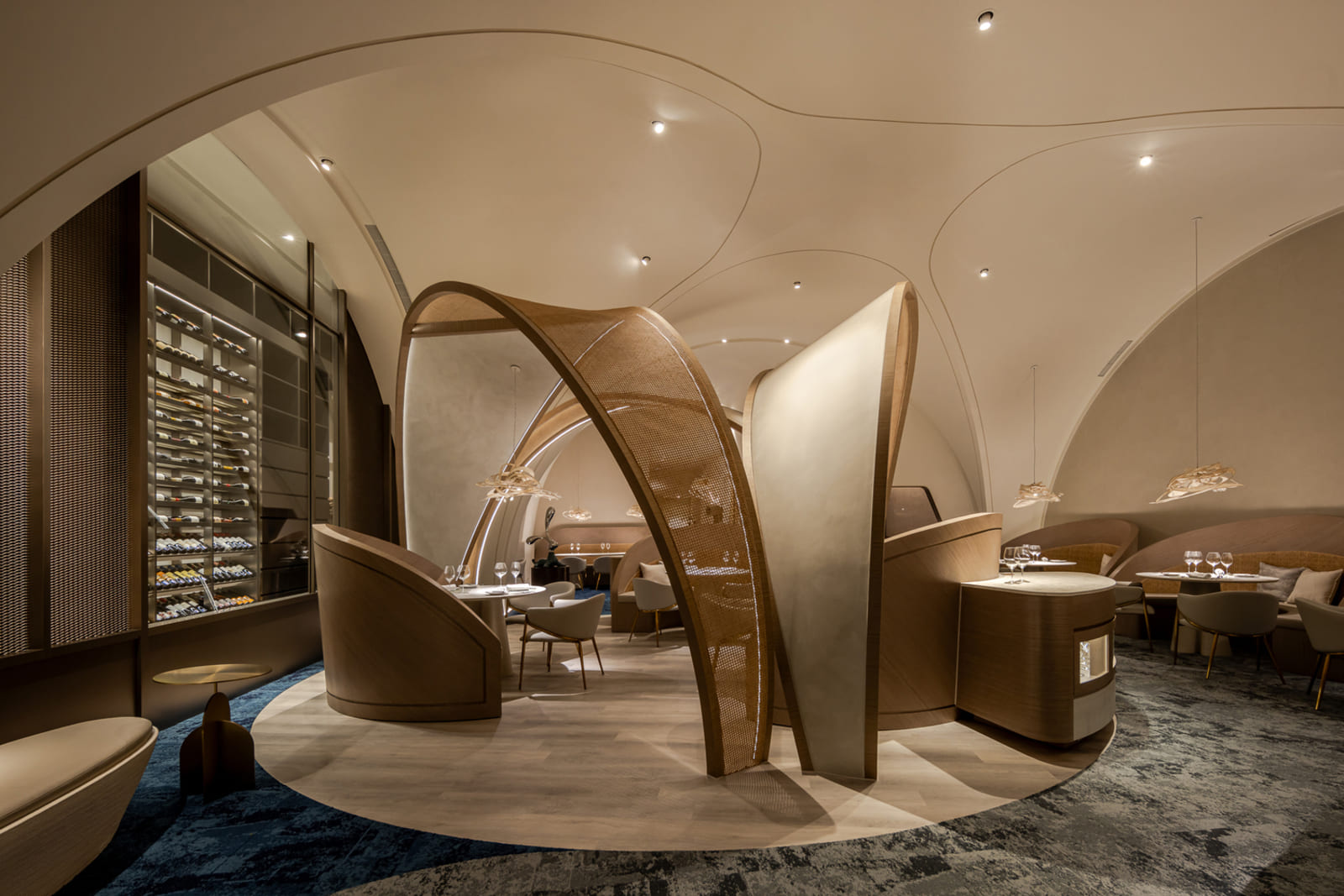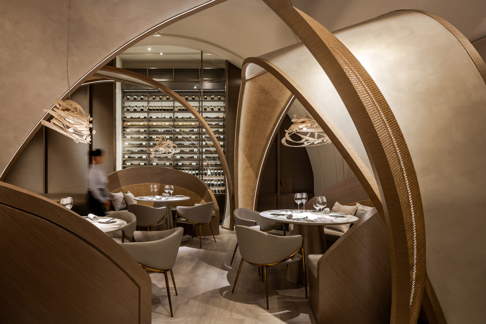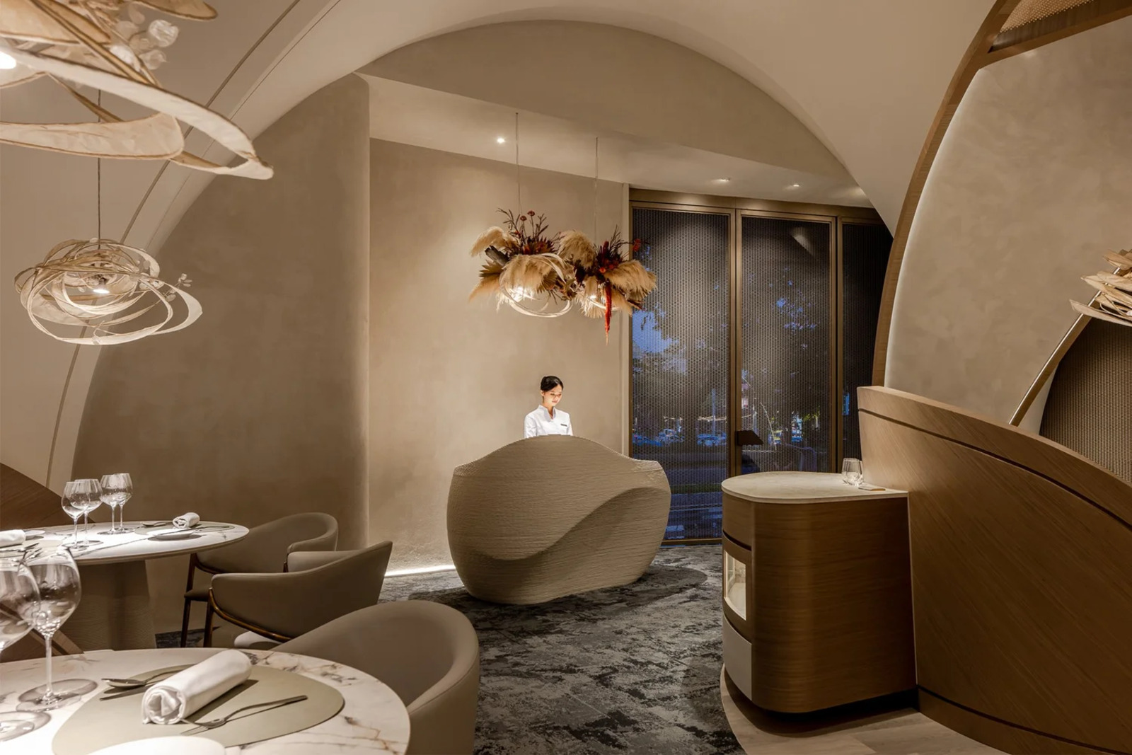 Located at the sea-land border 500 meters away, THOMAS CHIEN Restaurant is deeply rooted in Kaohsiung, it creates its seasonal menu in alignment with changes in the local culture and customs of this city in proximity to the sea and focuses on sustainability. It integrates Taiwanese seafood with French cuisine and connects the local supply chain. Embracing this ecological concept, we transform local wastes into reclaimed materials for the space. Oyster shells, abandoned fishing nets, Taiwan’s biodegradable materials, and local furnace slags have been recycled and transformed into sustainable building materials. In addition, we used traditional rattan to weave the three arc-shaped pergolas located in the center. The pergolas woven give a sense of transparency, with a substantial presence but not oppressive. The forms are inspired by the canopies of Roadside banquets, transforming Taiwanese memories into dual meanings with a local fun of “dining under the canopy” along a circular path. This design creates a sense of ritual and serves as a stage for a cross-cultural experience. Additionally, it also ensures that the seating arrangement takes into account the practical needs for privacy and table distance. Due to sunlight being refracted into the interior through the glass curtain wall across the street, causing prolonged discomfort with high temperatures and glare, we have modified the door panels to have a tilted angle. The door panels, like sheer screens, soften the high temperatures of sunlight during the day and allow interior lighting to highlight the elegant curves of the space at night. In this space, curves are heavily used to replace right angles, resembling the gentle forward movements of water. The ceiling made by CNC technology is crafted into French-style arches, not only to address issues such as low ceilings and complex piping but also to evoke the imagery of French elements.