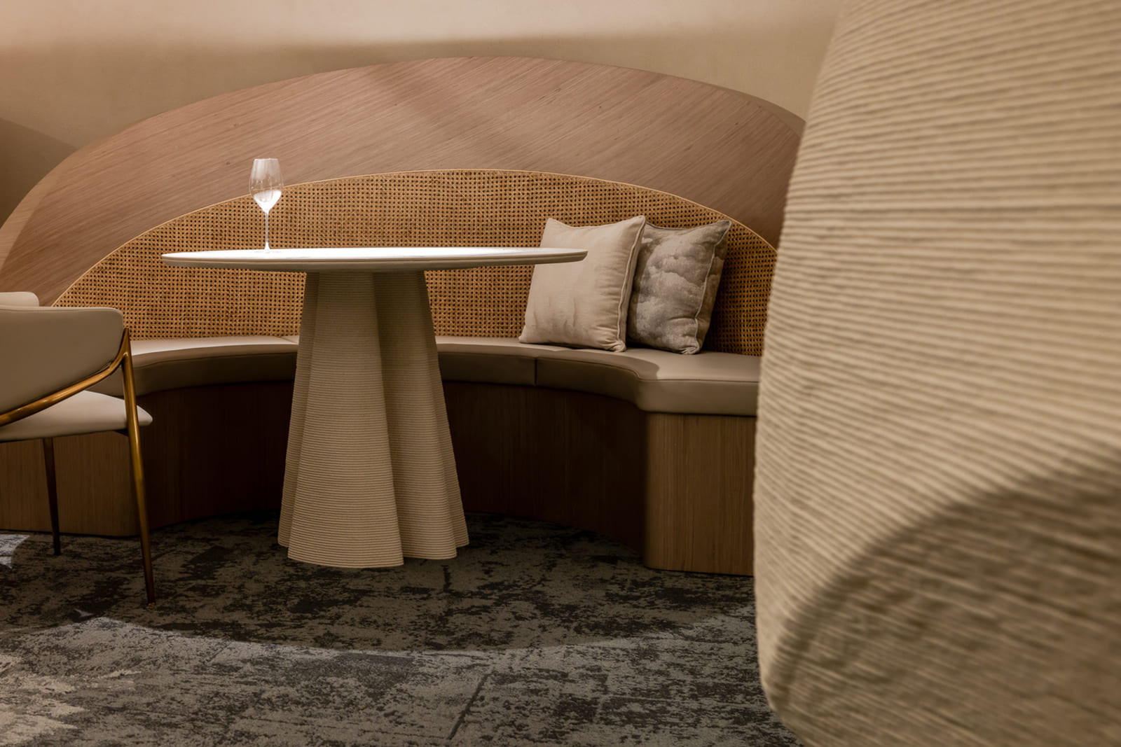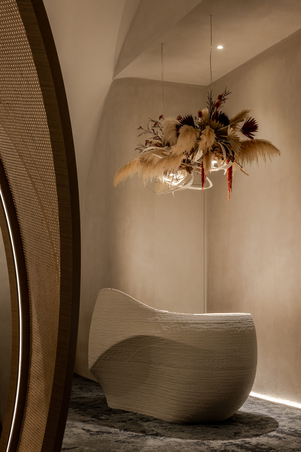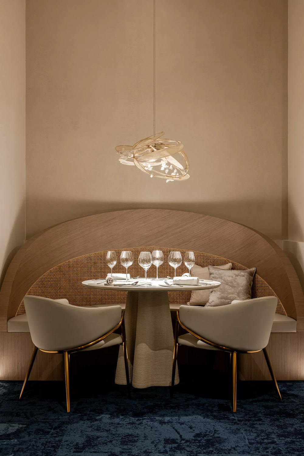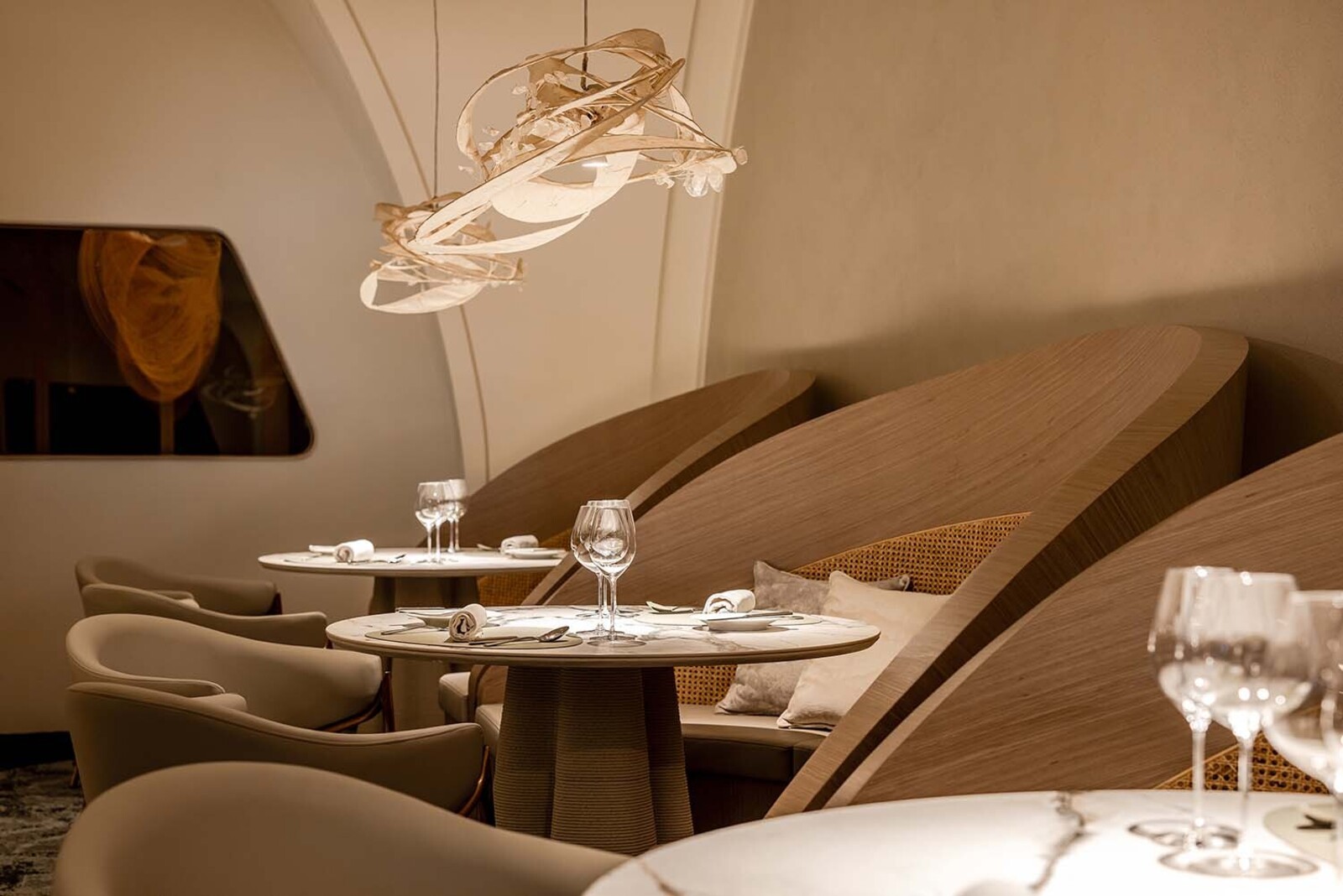 Located at the sea-land border 500 meters away, THOMAS CHIEN Restaurant is deeply rooted in Kaohsiung, it creates its seasonal menu in alignment with changes in the local culture and customs of this city in proximity to the sea and focuses on sustainability. It integrates Taiwanese seafood with French cuisine and connects the local supply chain. Embracing this ecological concept, we transform local wastes into reclaimed materials for the space. Oyster shells, abandoned fishing nets, Taiwan’s biodegradable materials, and local furnace slags have been recycled and transformed into sustainable building materials. In addition, we used traditional rattan to weave the three arc-shaped pergolas located in the center. The pergolas woven give a sense of transparency, with a substantial presence but not oppressive. The forms are inspired by the canopies of Roadside banquets, transforming Taiwanese memories into dual meanings with a local fun of “dining under the canopy” along a circular path. This design creates a sense of ritual and serves as a stage for a cross-cultural experience. Additionally, it also ensures that the seating arrangement takes into account the practical needs for privacy and table distance. Due to sunlight being refracted into the interior through the glass curtain wall across the street, causing prolonged discomfort with high temperatures and glare, we have modified the door panels to have a tilted angle. The door panels, like sheer screens, soften the high temperatures of sunlight during the day and allow interior lighting to highlight the elegant curves of the space at night. In this space, curves are heavily used to replace right angles, resembling the gentle forward movements of water. The ceiling made by CNC technology is crafted into French-style arches, not only to address issues such as low ceilings and complex piping but also to evoke the imagery of French elements.