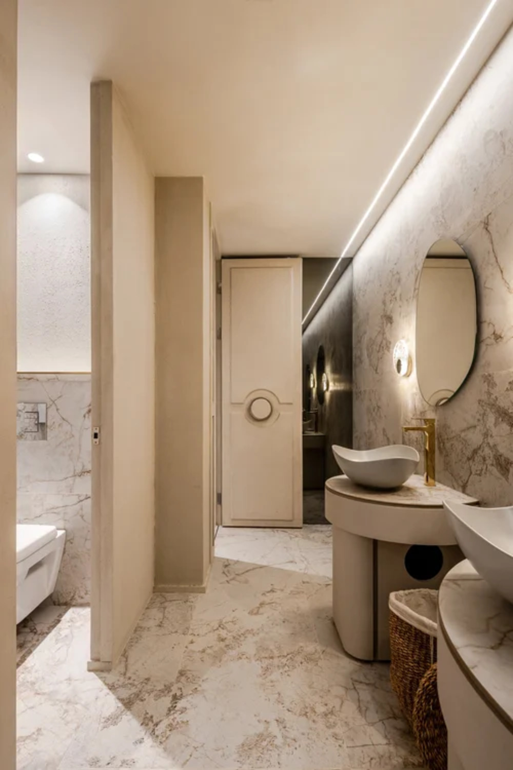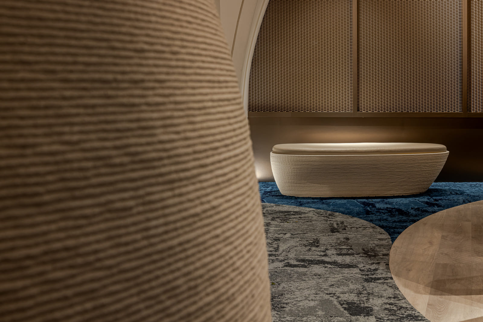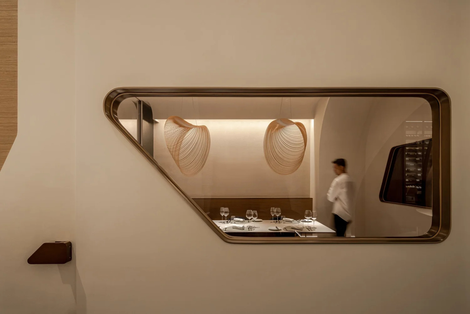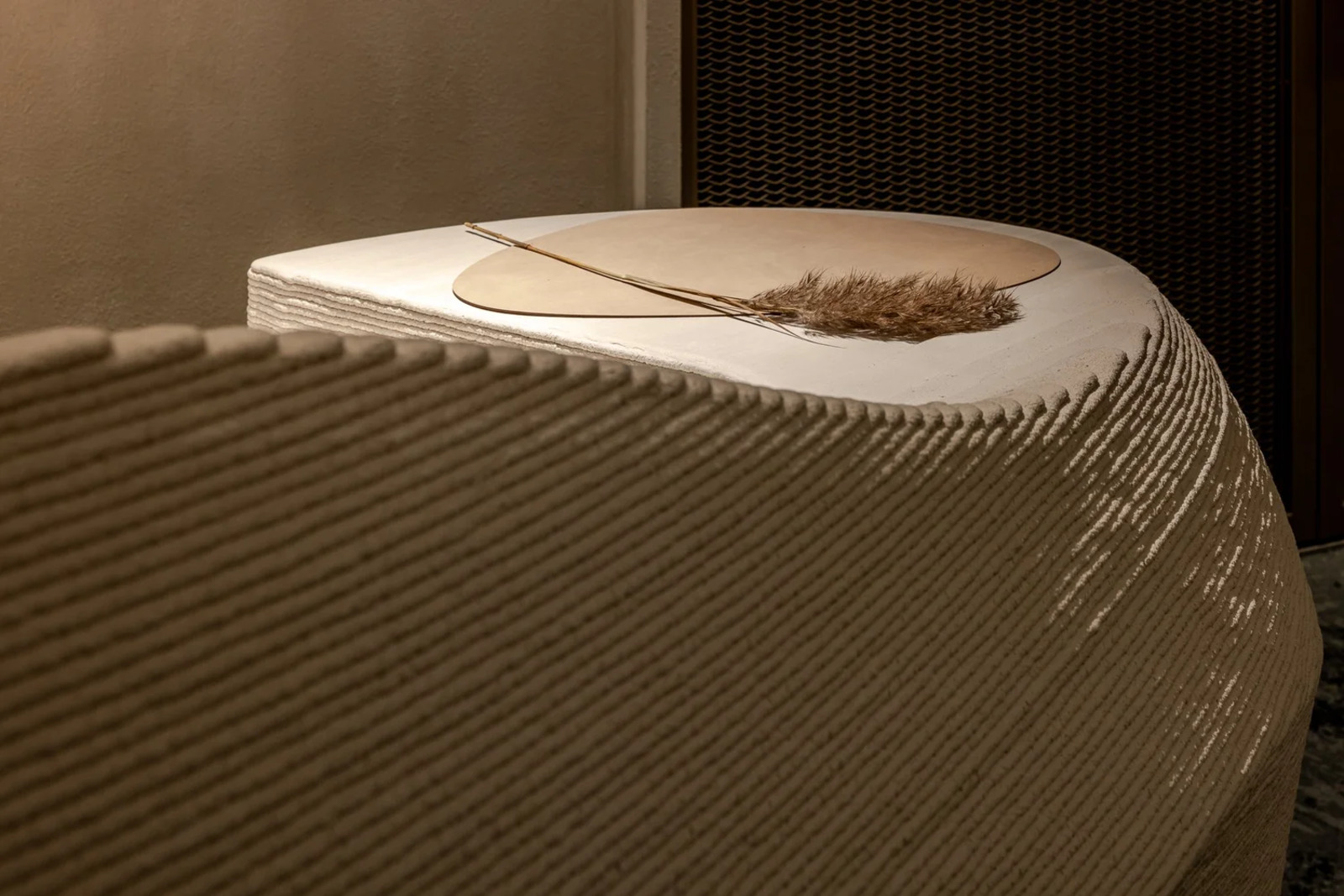 Located at the sea-land border 500 meters away, THOMAS CHIEN Restaurant is deeply rooted in Kaohsiung, it creates its seasonal menu in alignment with changes in the local culture and customs of this city in proximity to the sea and focuses on sustainability. It integrates Taiwanese seafood with French cuisine and connects the local supply chain. Embracing this ecological concept, we transform local wastes into reclaimed materials for the space. Oyster shells, abandoned fishing nets, Taiwan’s biodegradable materials, and local furnace slags have been recycled and transformed into sustainable building materials. In addition, we used traditional rattan to weave the three arc-shaped pergolas located in the center. The pergolas woven give a sense of transparency, with a substantial presence but not oppressive. The forms are inspired by the canopies of Roadside banquets, transforming Taiwanese memories into dual meanings with a local fun of “dining under the canopy” along a circular path. This design creates a sense of ritual and serves as a stage for a cross-cultural experience. Additionally, it also ensures that the seating arrangement takes into account the practical needs for privacy and table distance. Due to sunlight being refracted into the interior through the glass curtain wall across the street, causing prolonged discomfort with high temperatures and glare, we have modified the door panels to have a tilted angle. The door panels, like sheer screens, soften the high temperatures of sunlight during the day and allow interior lighting to highlight the elegant curves of the space at night. In this space, curves are heavily used to replace right angles, resembling the gentle forward movements of water. The ceiling made by CNC technology is crafted into French-style arches, not only to address issues such as low ceilings and complex piping but also to evoke the imagery of French elements.