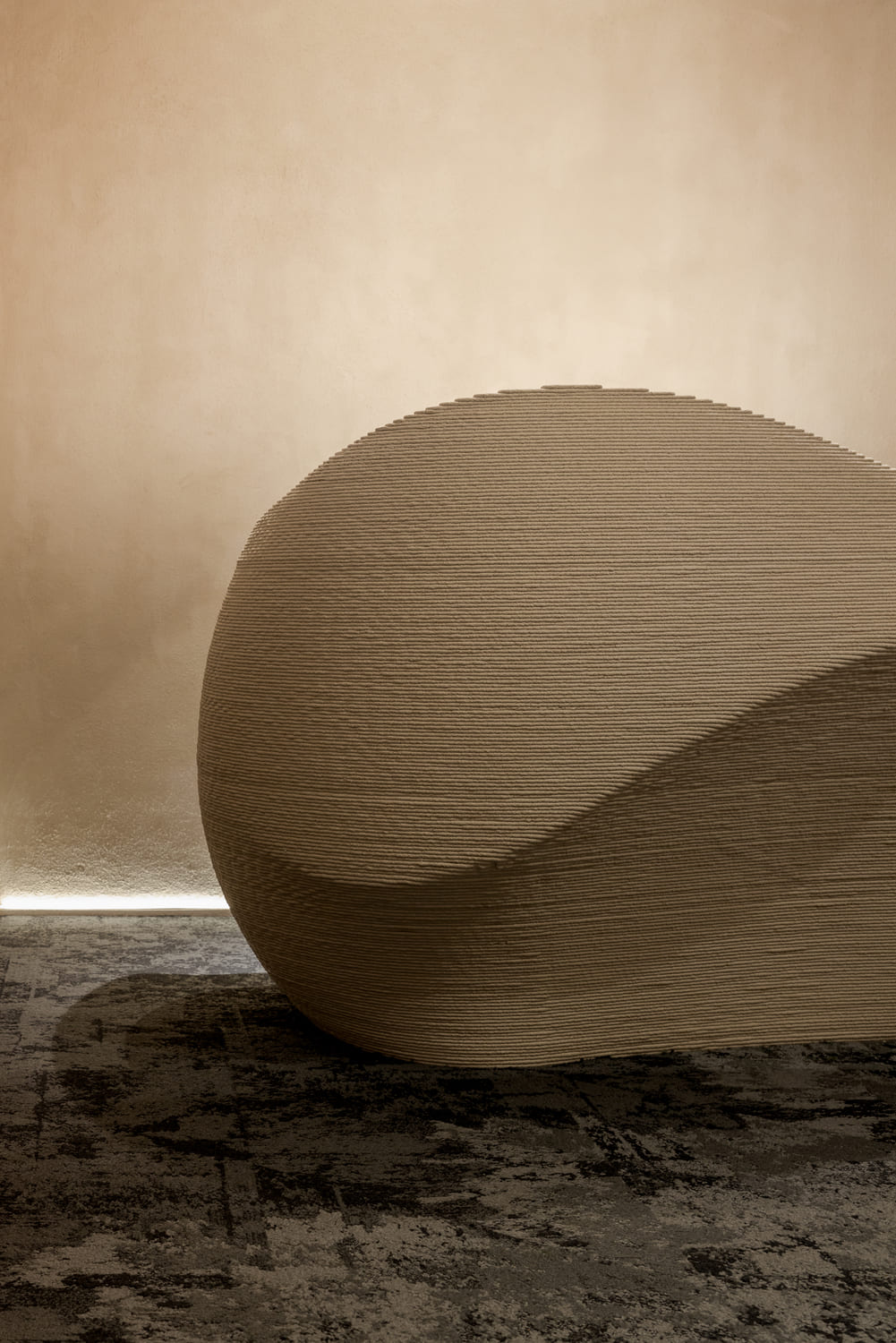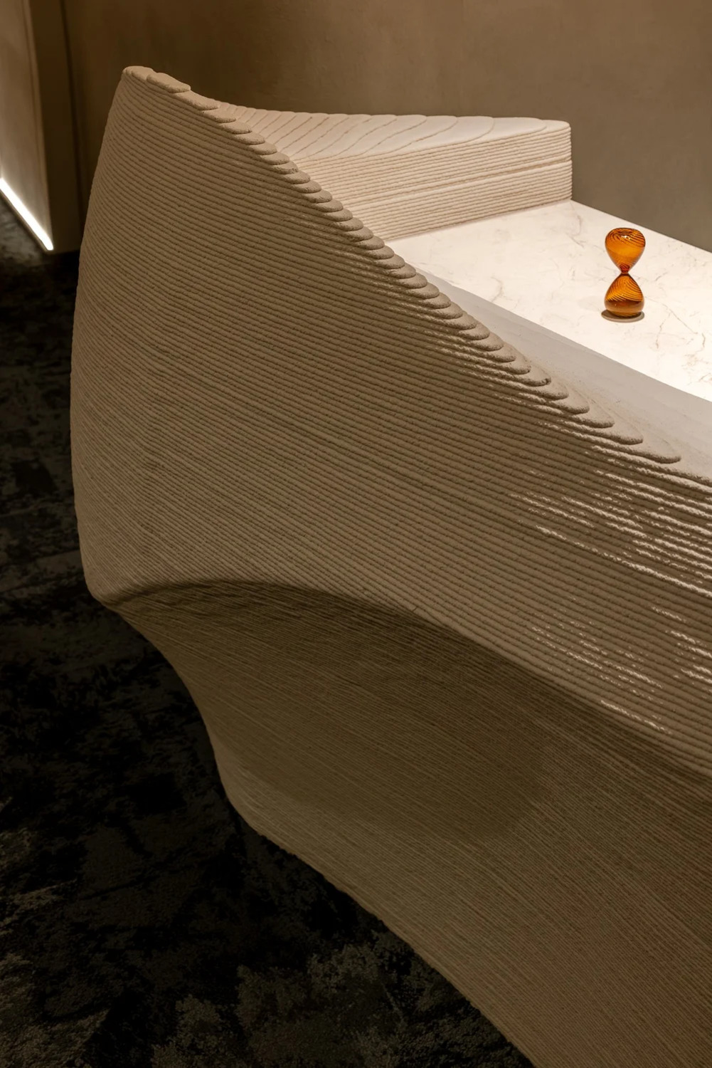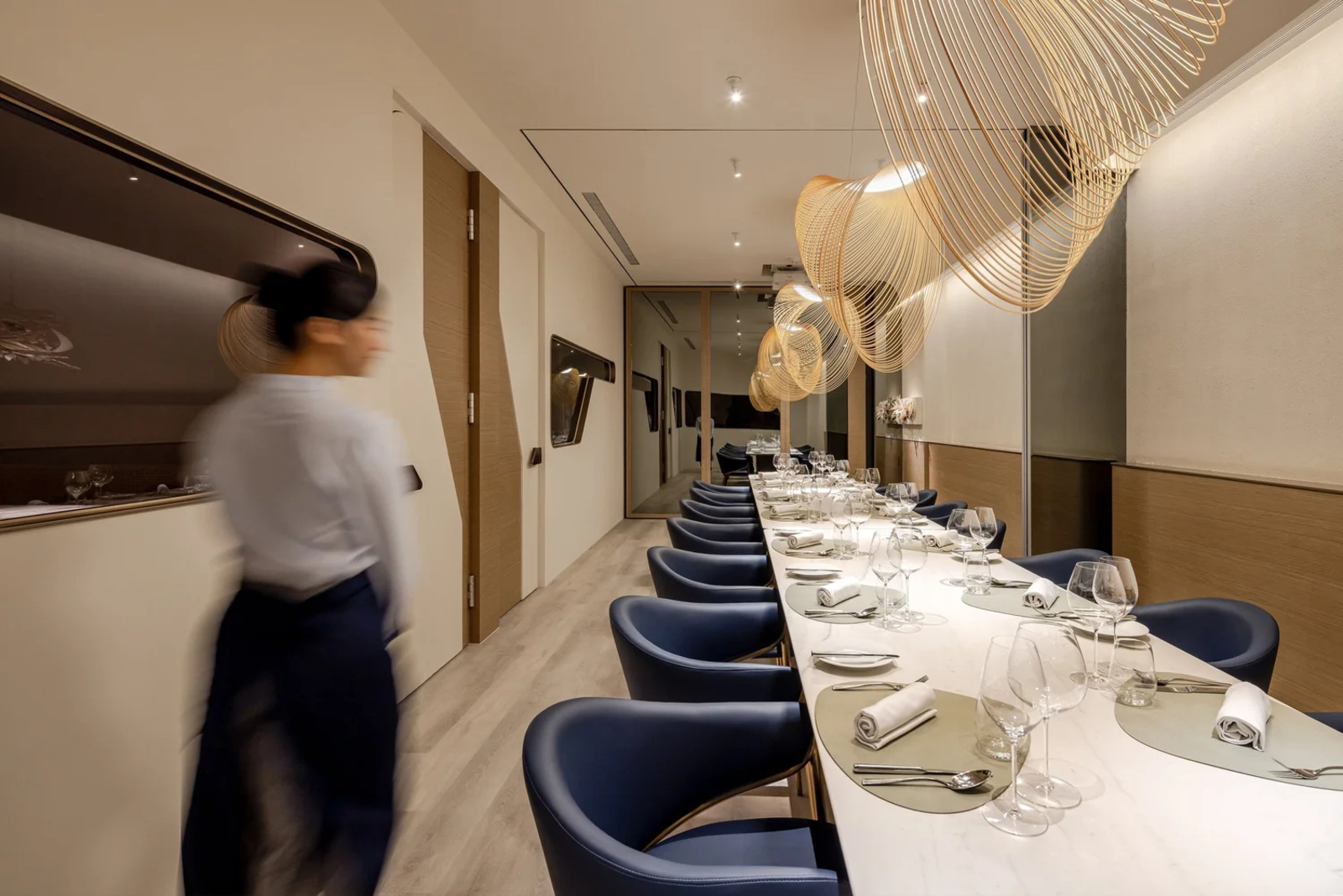The space develops under the sustainability. We used different kinds of local wastes, for instance, oyster shells after dining, often considered a difficult waste for incinerators or landfills due to high calcium content, are processed into natural concrete-free paints through roasting and grinding. With the use of trowel techniques, they are shaped into textured surfaces on walls and pergolas. The finely-sculpted patterns become different layers within the space. However, to more meaningfully combine with local wastes, and considering the possible insufficient supply of oyster shells, we cooperate with a recycling materials Ph.D. in research and development. We collected from China Steel Corporation in Kaohsiung the furnace slags of the smelting process, combined these with oyster shells, and developed a series of counter, table legs, and boat-shaped chair through 3D printing and structural design. A detail is hidden in the table’s legs, inspired by the traditional French napkin fold. Soft napkins are turned into sturdy pillars, symbolizing the contrast between tradition and innovation. Another case of material recycling involves abandoned fishing nets. Through reprocessing techniques, they are fabricated into organic recycled carpets. The color tones of the carpet, inspired by the gray sand and blue tides of the local harbor, serve as an imagination and guide the flow of space. The past and present lives of waste redefine their original value. In addition, we also worked with florists by using coarse hemp as frameworks and drawing inspiration from the waves washing over the harbor to deconstruct and reconstruct the imagery of islands, oceans, and sail canvases. Taiwan’s biodegradable materials, such as coral stones, red quinoas, Azalea roots, and Salix argyracea skeleton leaves, are pieced together to create pendant lights, generating a sense of depth while preserving the natural, organic, and flowing rhythms, in response to sustainability on the land.