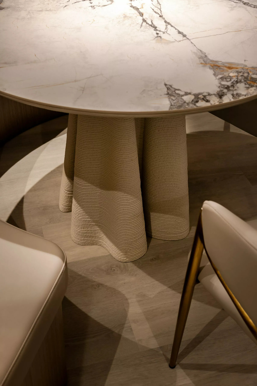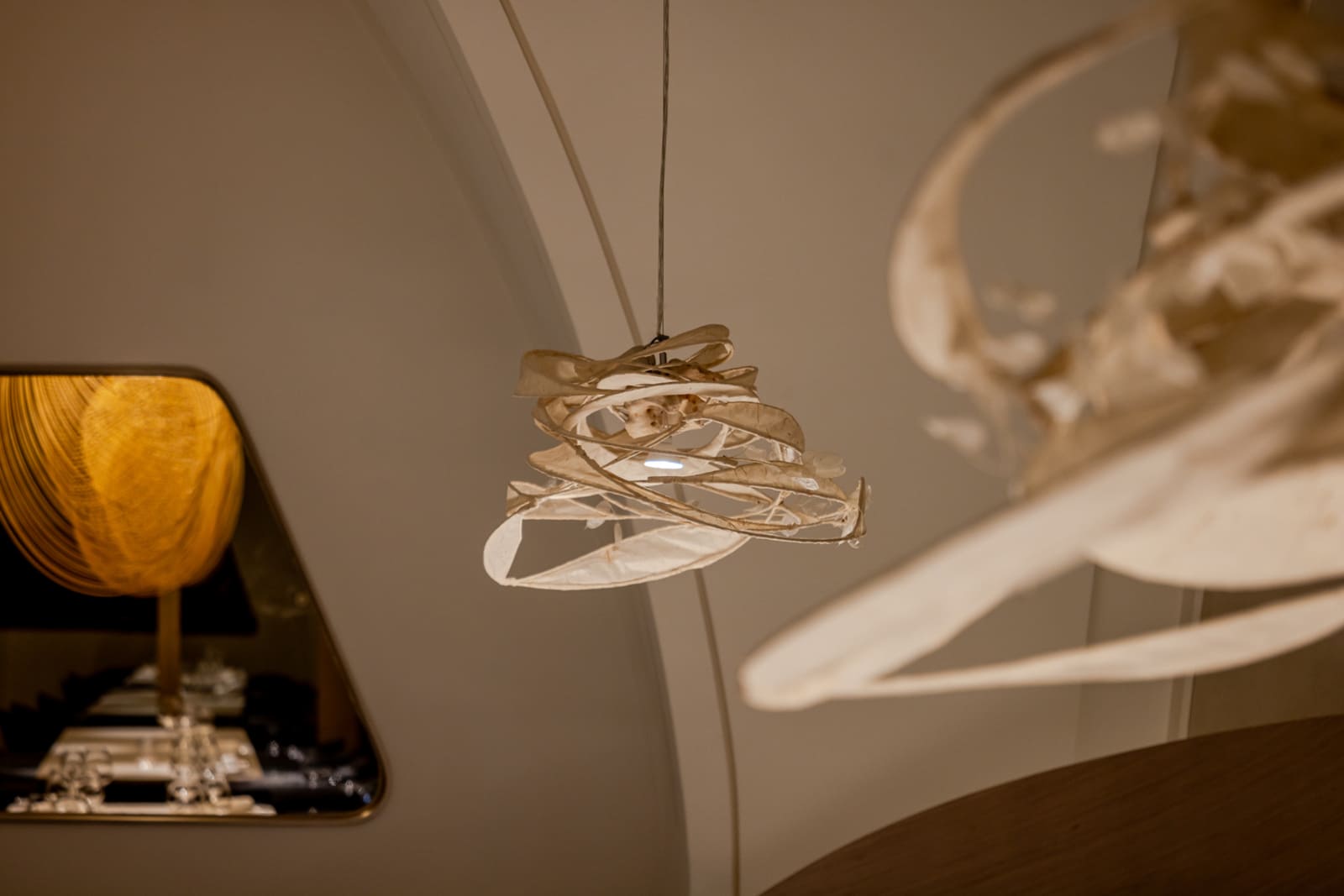 Technology, 3D printing, industrial design, Wickerwork, and floral design are integrated to transform overlooked wastes in daily life into novel and original regenerated resources. Taiwan has a deep connection with the ocean, especially for Kaohsiung, there is a port once the third-largest one in the world. This geographical location surrounded by the sea, cultural traditions of seafood consumption, and the influence of maritime climate were pivotal factors guiding our design approach for this project. When creating the materials for this project, our aim was not only to extract from the earth but also to give back to the environment. For example, we collected discarded oyster shells after consumption to prevent their difficulty in decomposing in the environment. Additionally, through beach clean-ups, we gathered discarded fishing nets from local harbors to reduce their threat to marine ecosystems, thus fostering a more sustainable marine environment and establishing a supply chain cycle between ecology and the restaurant. In the space crafted with silky cream-colored and elegant curves, the usage ratio of sustainable materials approaches 80%.