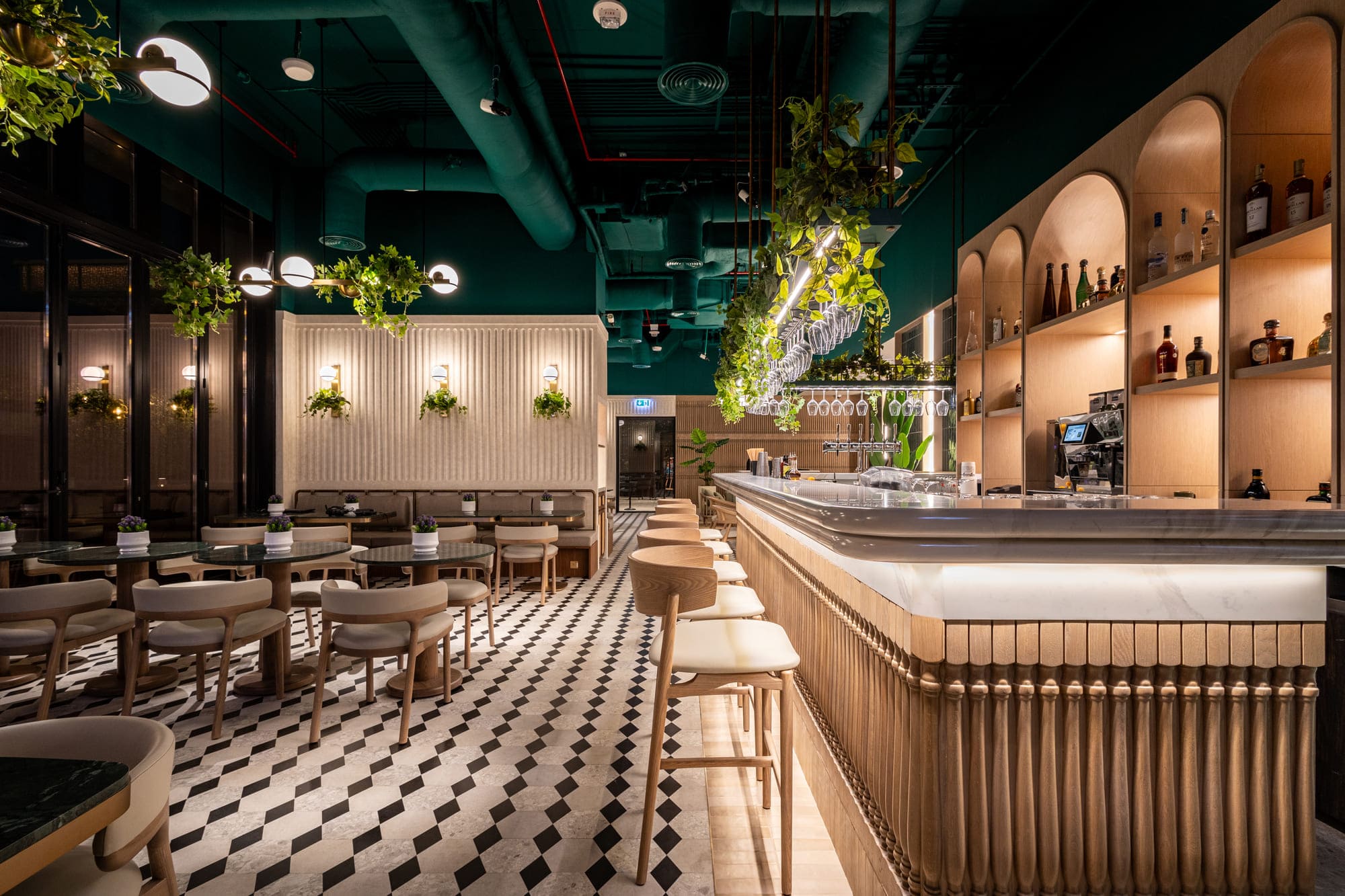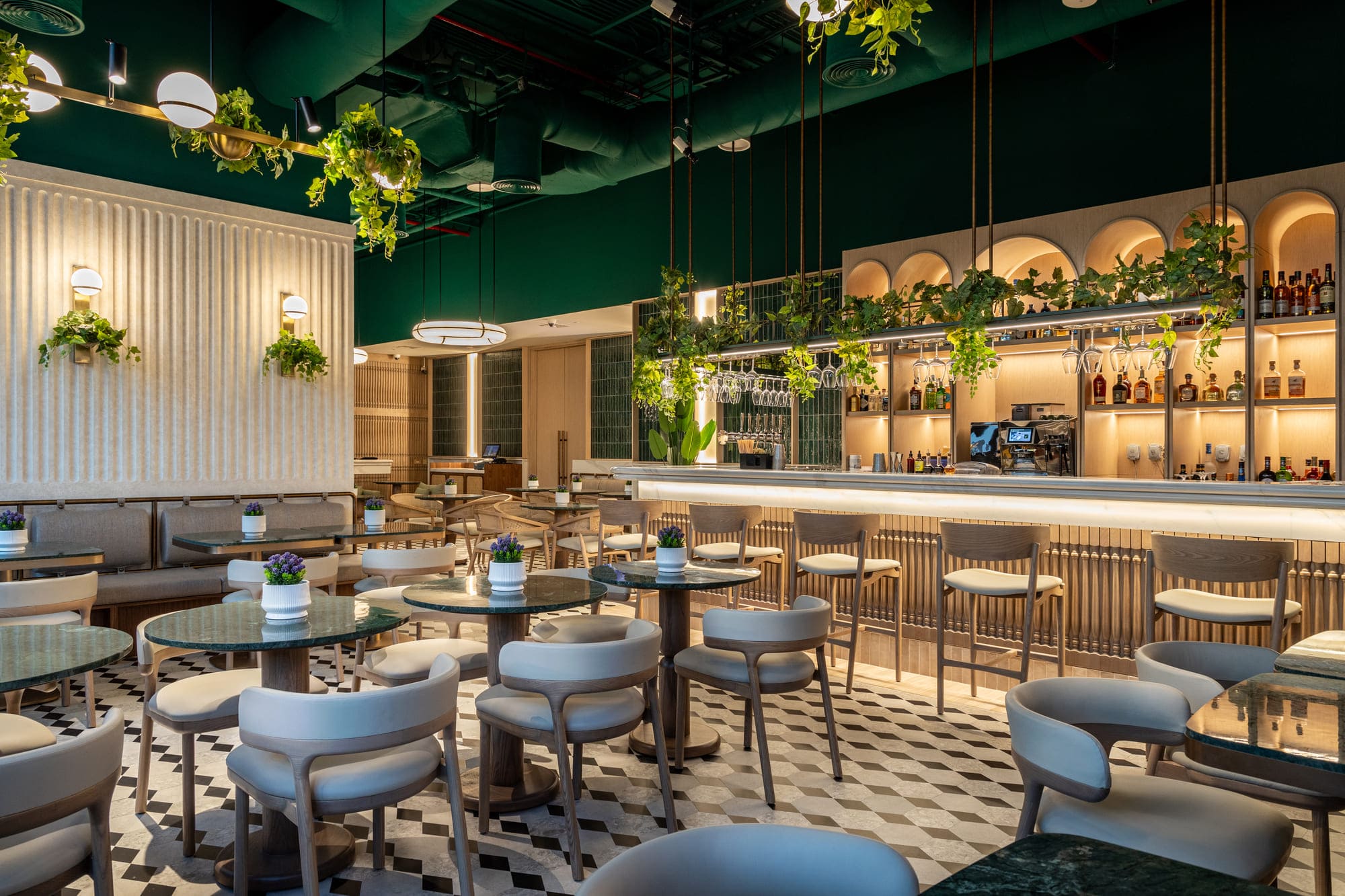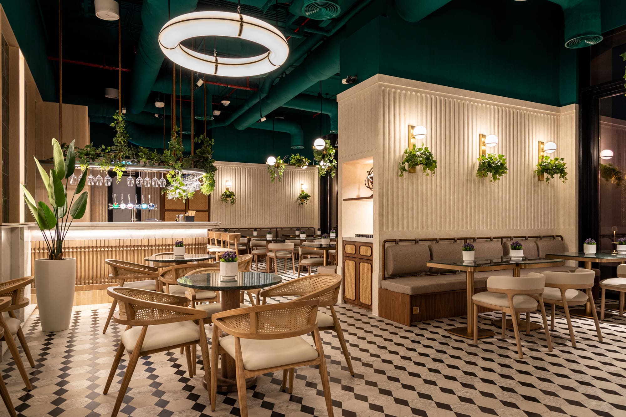 Lighting plays a central role in defining the space’s shifting moods. Track-mounted spotlights, ambient wall sconces, and pendant fixtures ensure the atmosphere evolves seamlessly from day to night, while exposed MEP elements—also painted emerald—are carefully integrated to preserve the aesthetic harmony.