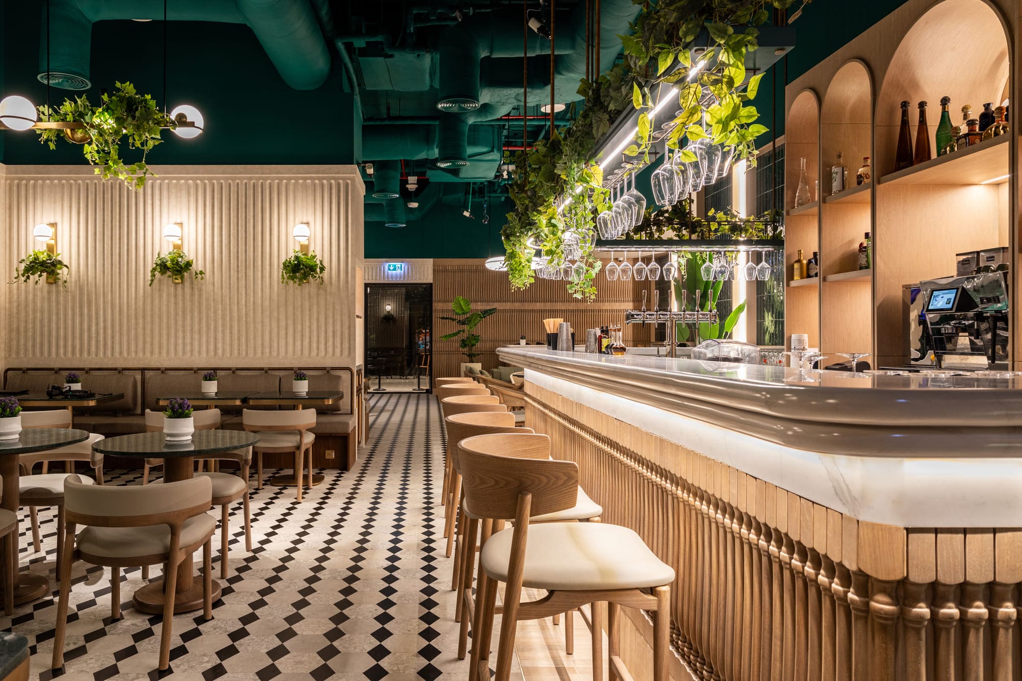 At TJ’s, 4SPACE discards the dark and heavy materials often associated with pub interiors and replaces them with warmth, tactility, and clarity. Natural light pours across softly fluted wall panels in hand-finished gypsum, painted in a soft beige tone, while custom joinery in oak veneer adds depth and texture. Hovering above it all, the ceiling—painted in a rich emerald green (RAL 6005)—anchors the space with a moody elegance that gives the interior both structure and personality.