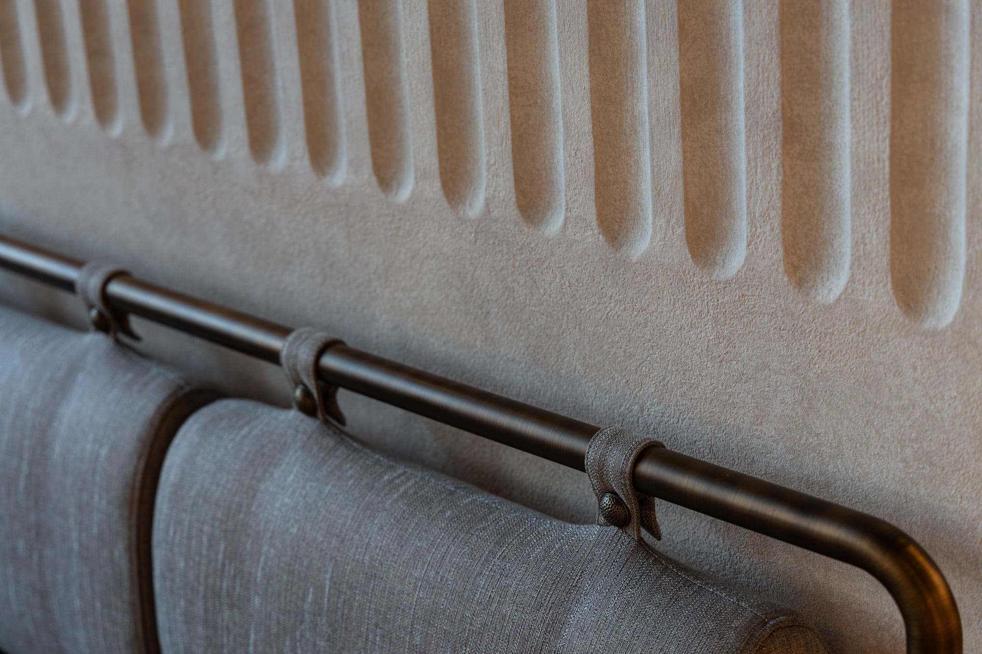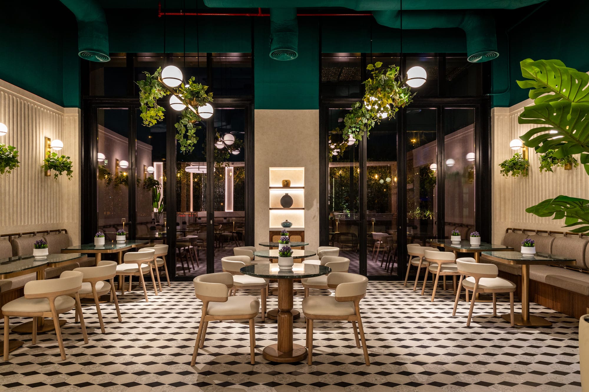 The furniture selection eschews uniformity in favor of tactile variety. Café-style tables with polished Verde Guatemala marble tops sit alongside powder-coated rattan-backed armchairs and plush upholstered banquettes in beige woven fabric. Each detail, from the brass accents to the soft curves of the banquette backrests, speaks to an understated sense of luxury—one that values comfort as much as craft.