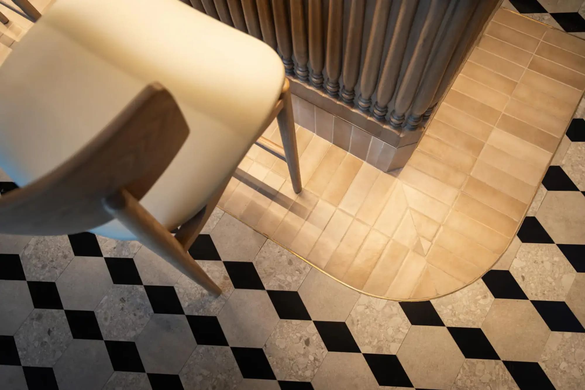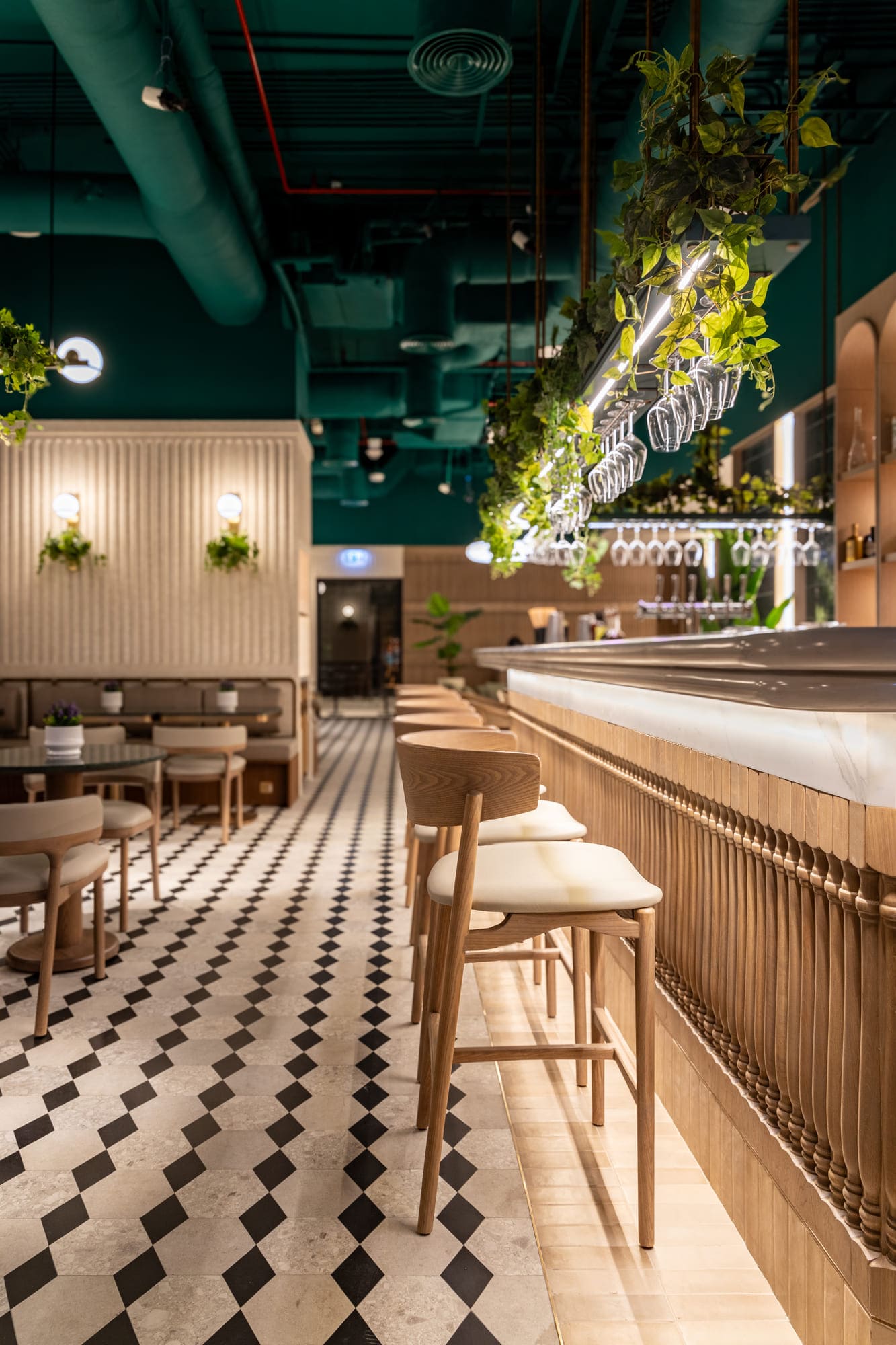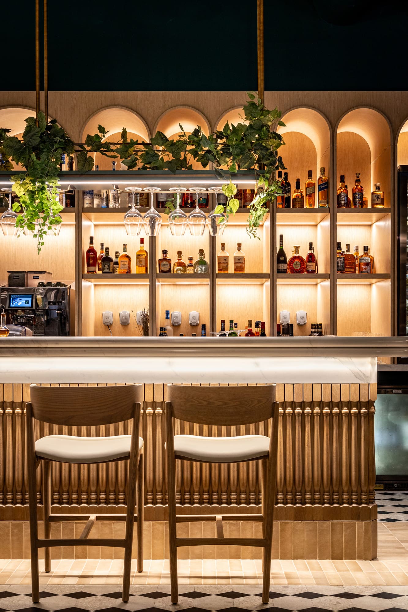 A diamond-patterned floor in black, off-white, and grey porcelain tile provides a bold graphic base, subtly referencing heritage motifs with a modern rhythm. At the center of the space, the bar becomes the heart of the experience. Its carved wooden front features vertical fluting that recalls classical column detailing, while arched niches at the back are softly lit with warm LED strips. Suspended above, a brushed brass shelving framework displays hanging glassware and built-in greenery—equal parts functionality and flourish.