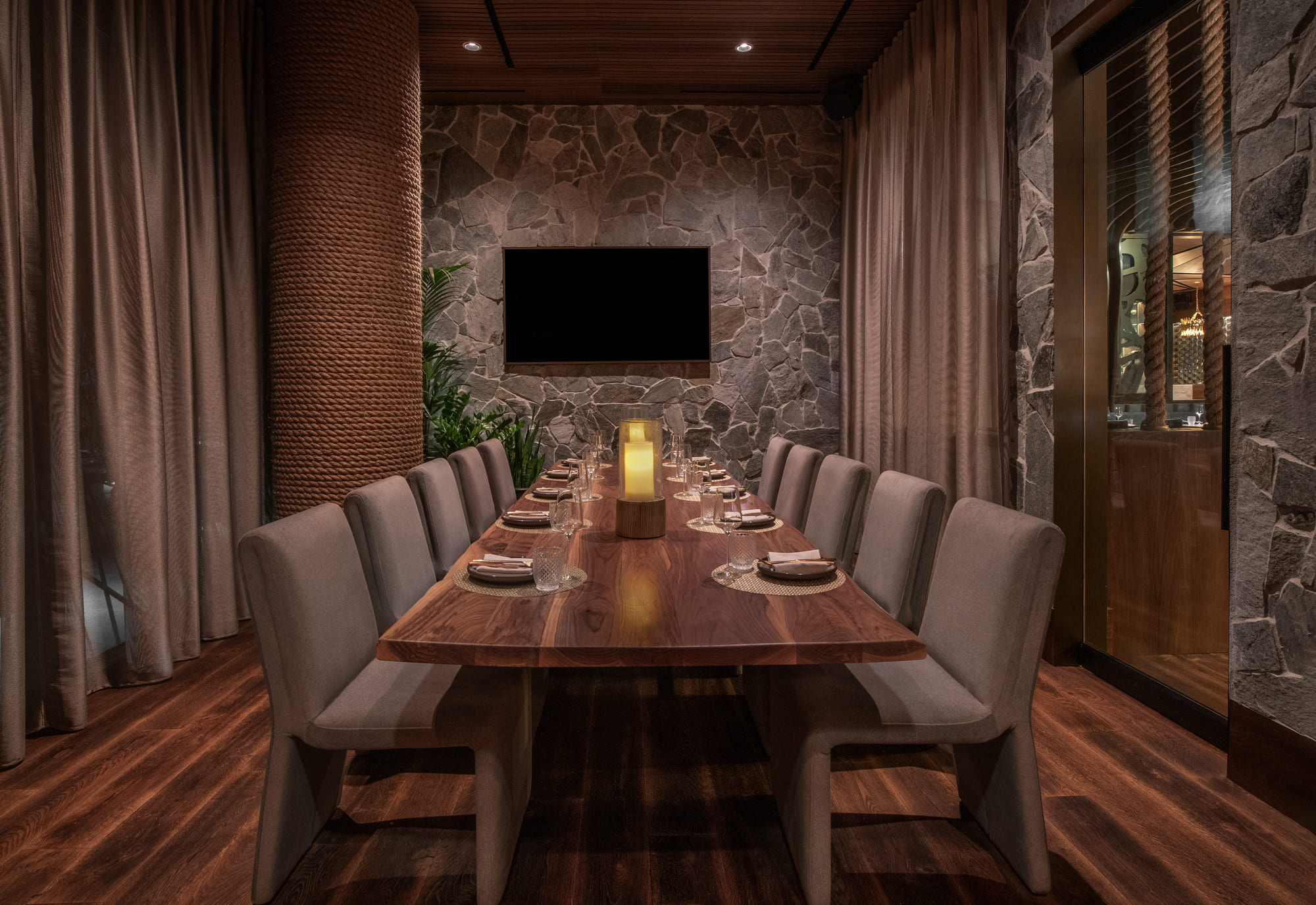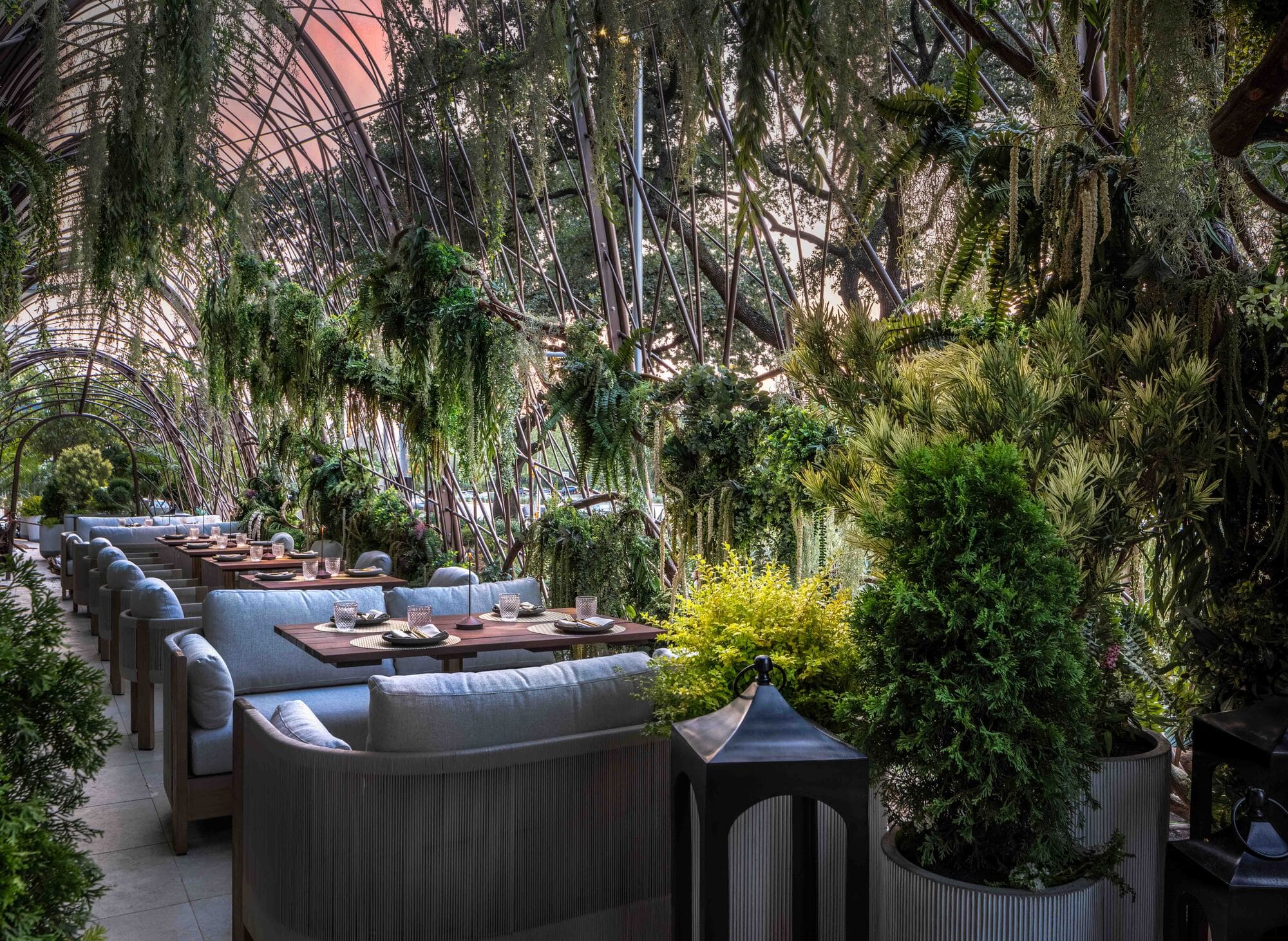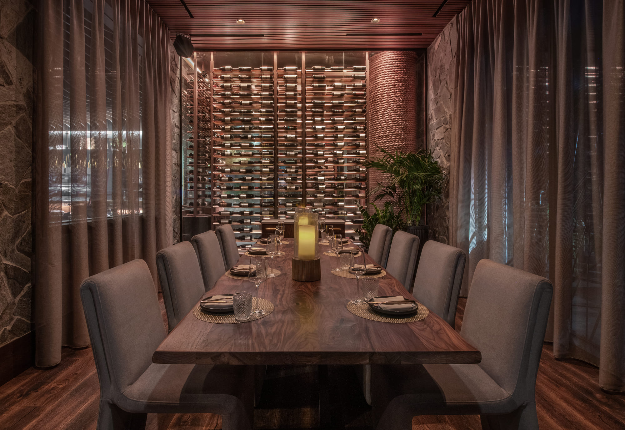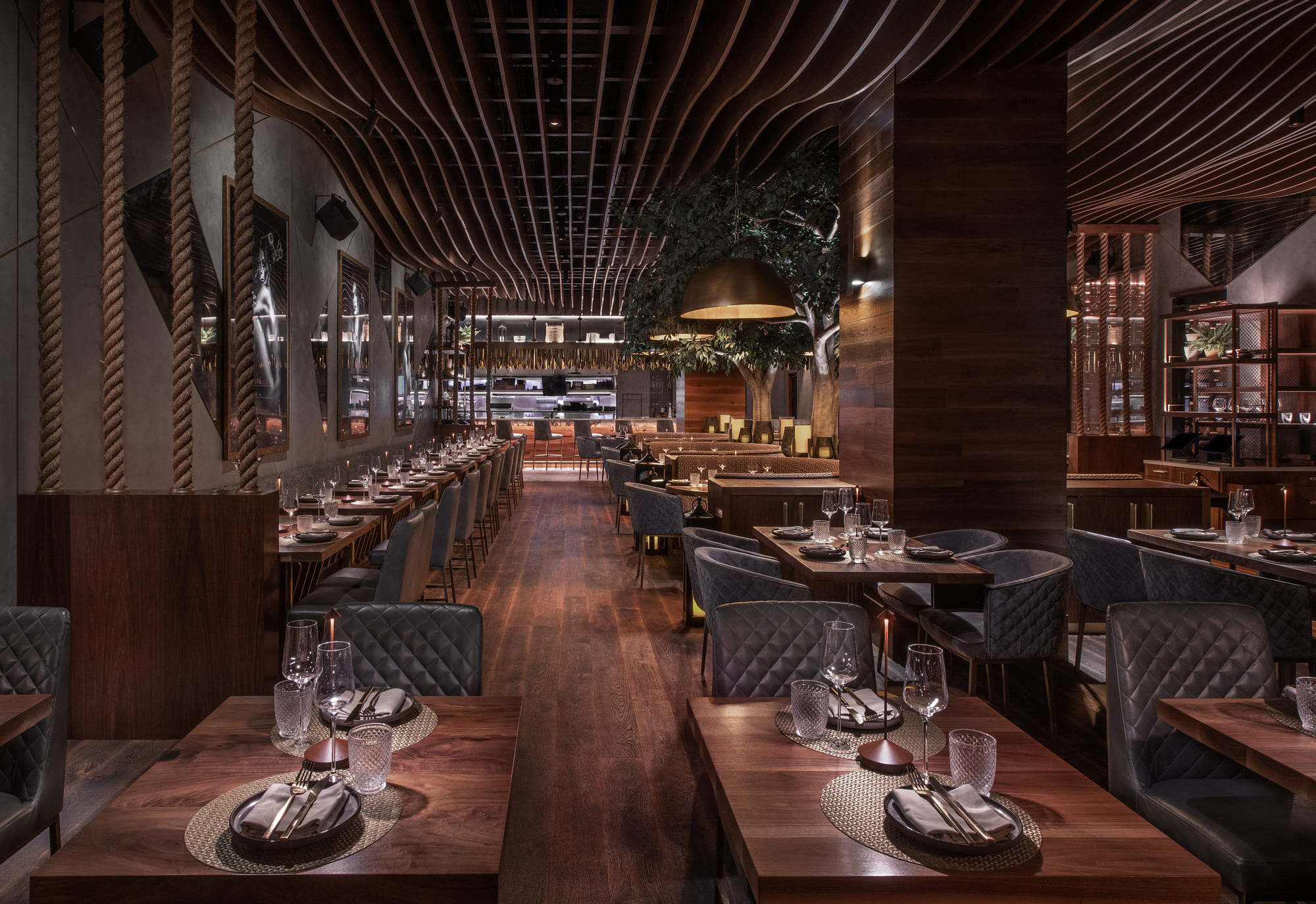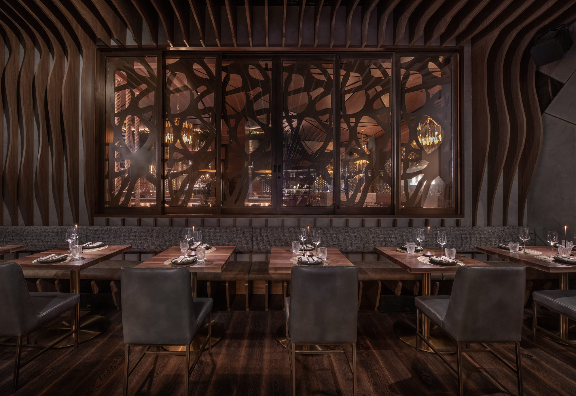 A wood tunnel ushers guests into the main dining room anchored by an undulating wood slat ceiling, adding a sense of movement and fluidity to the space. Bold architectural elements combined with warm luxurious finishes of handcrafted custom woodwork, plush velvet upholsteries, intimate lighting, and biophilic design create a transcending multi-sensory dining experience.