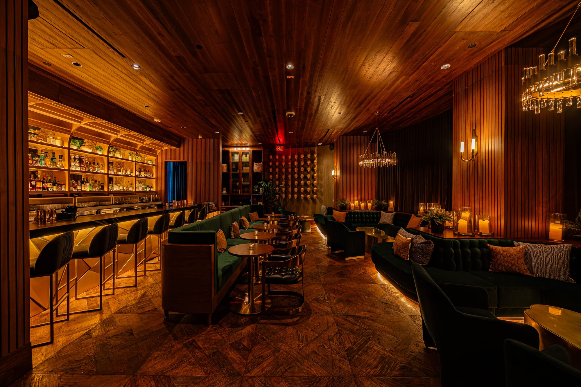 Beyond the dining room, a clandestine members-only speakeasy is hidden behind art pieces. The design inside exudes an air of exclusivity and sophistication. The upscale finishes, including luxe stone and fabrics, create a luxurious ambiance. Gold accents add a touch of opulence and glamor to the space. And wood walls, floors, and ceilings add warmth and richness to the design, creating a cozy atmosphere.