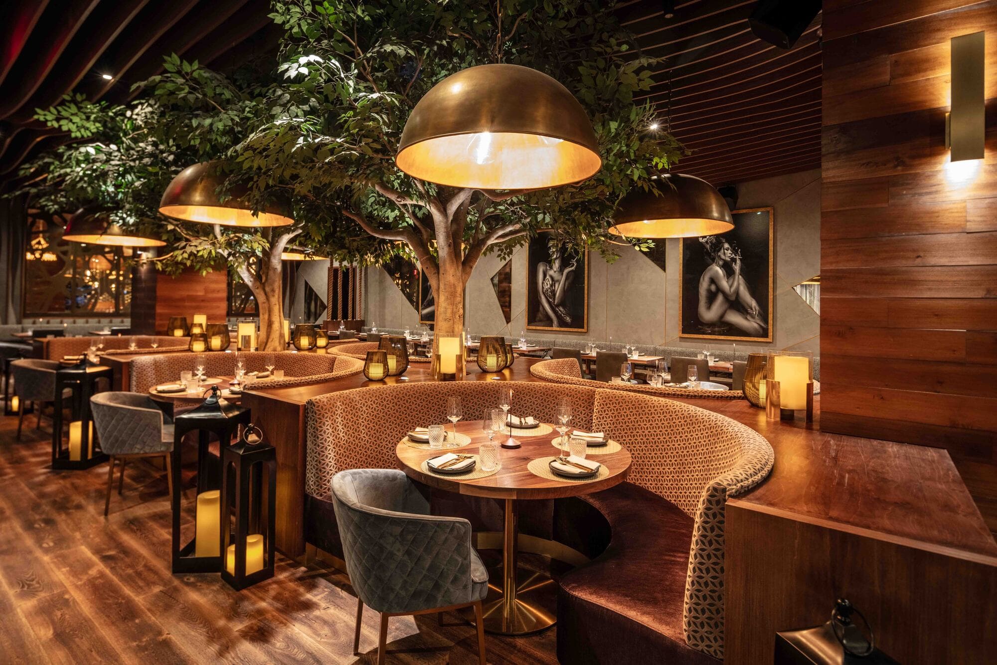 The restaurant space features curated photography art, with a design forward and edgy aesthetic. Bold design elements, such as statement ceiling details and upscale lighting and furniture further enhance the visual appeal of the restaurant. The combination of all these elements results in a visually stunning environment that captivates guests and sets the stage for a high-end dining experience.