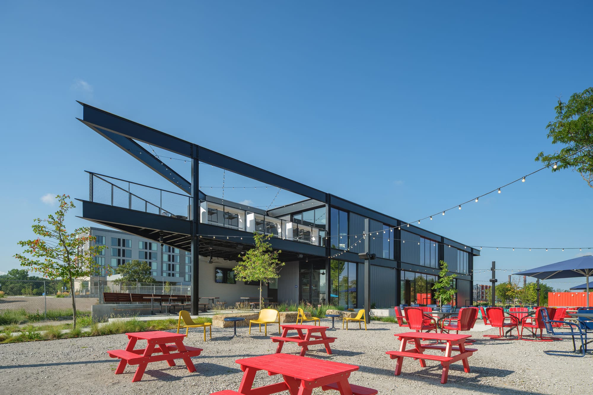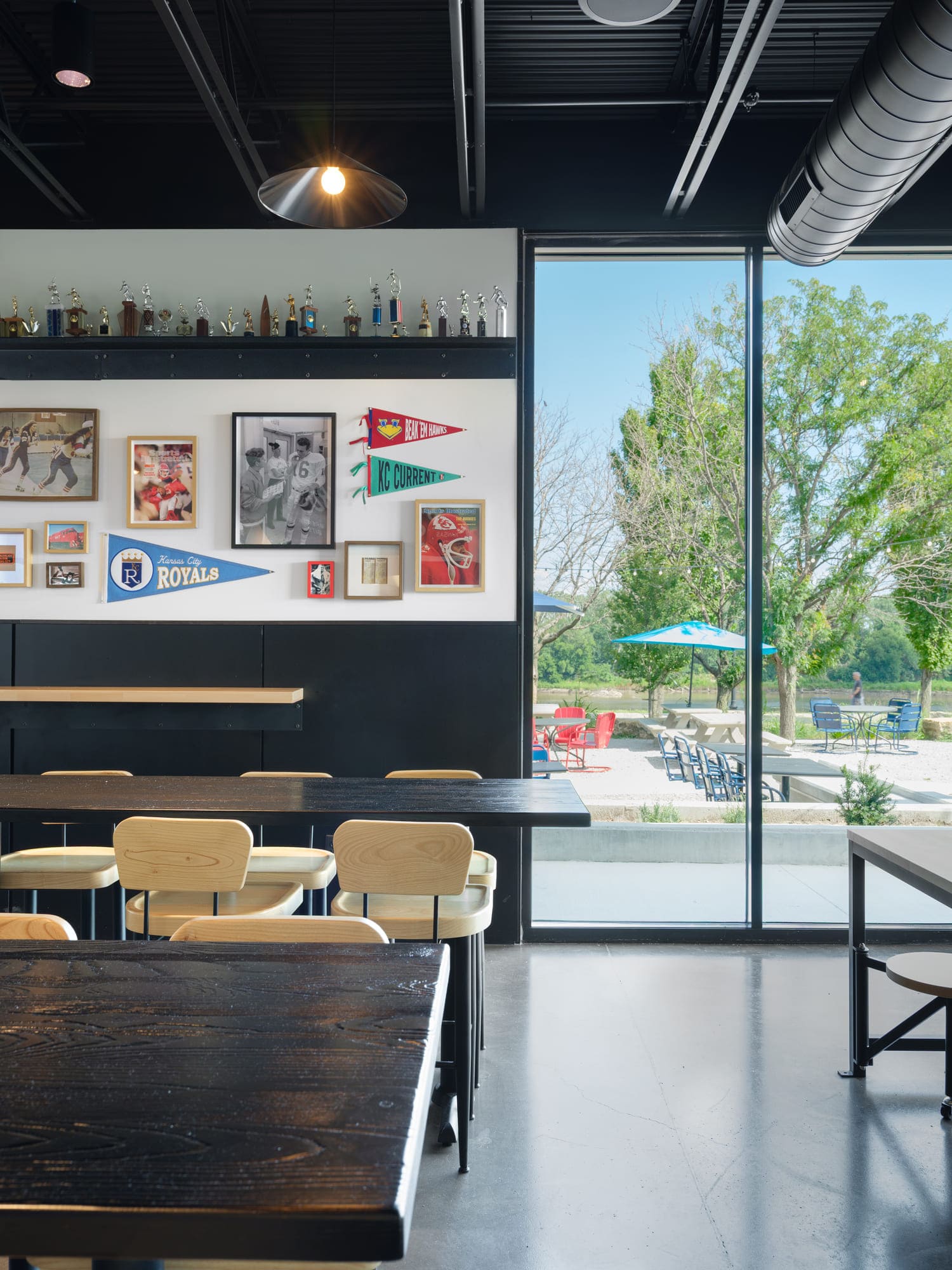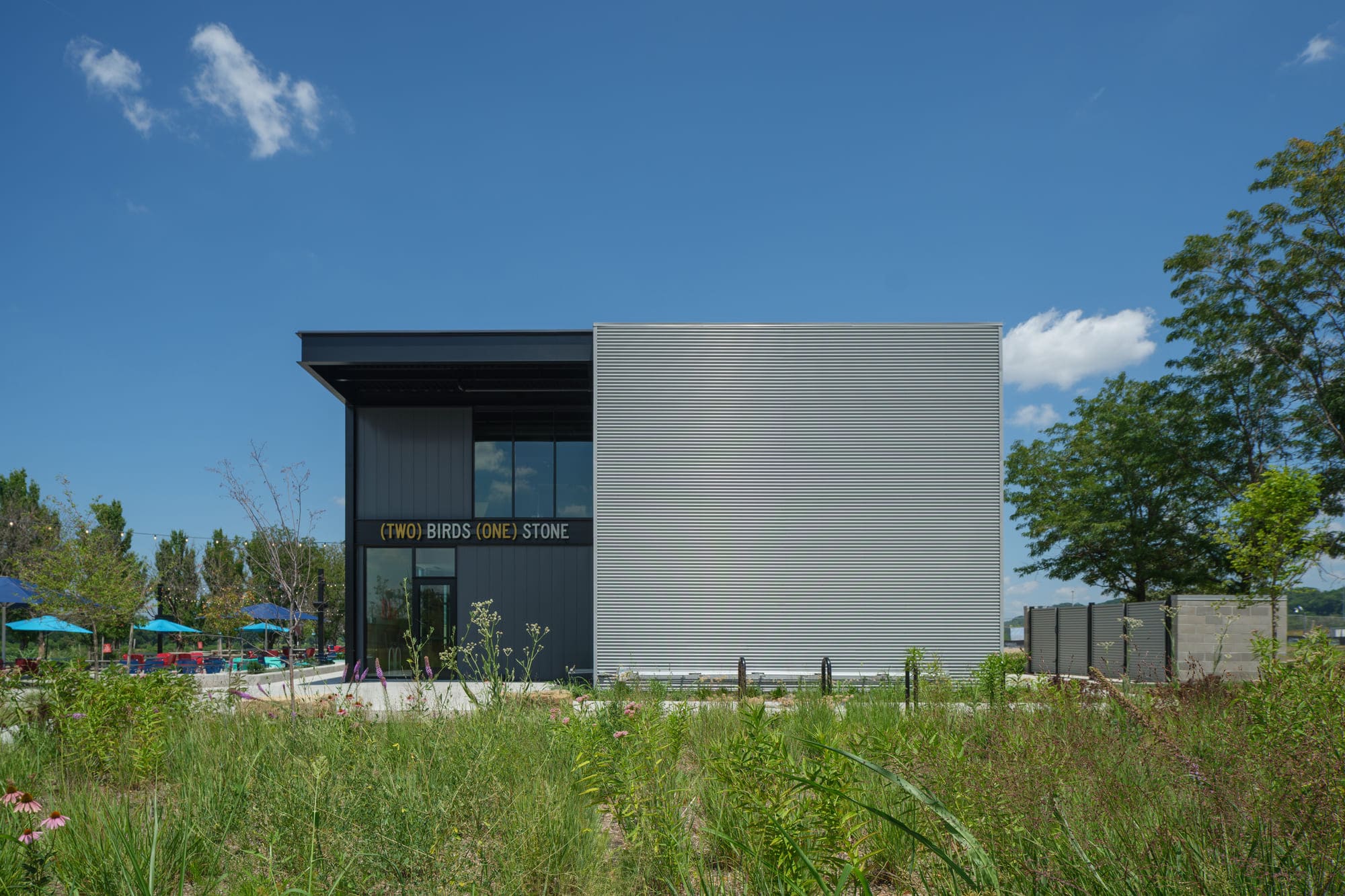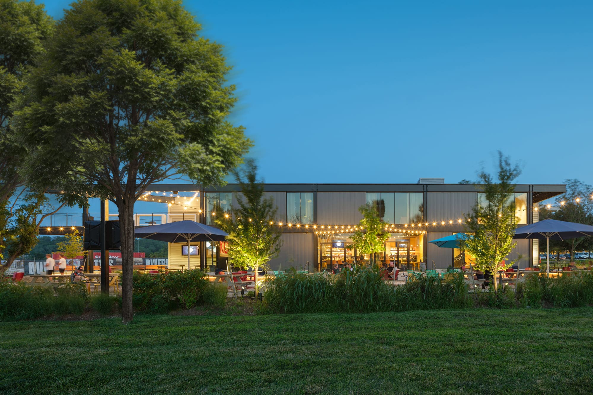 Two Birds One Stone is a dynamic food and beverage destination designed to activate Kansas City’s Berkley Riverfront Park through integration with its natural surroundings. Nestled within an existing grove of trees, the project emphasizes connection to the tree canopy, river, and adjacent park activity.