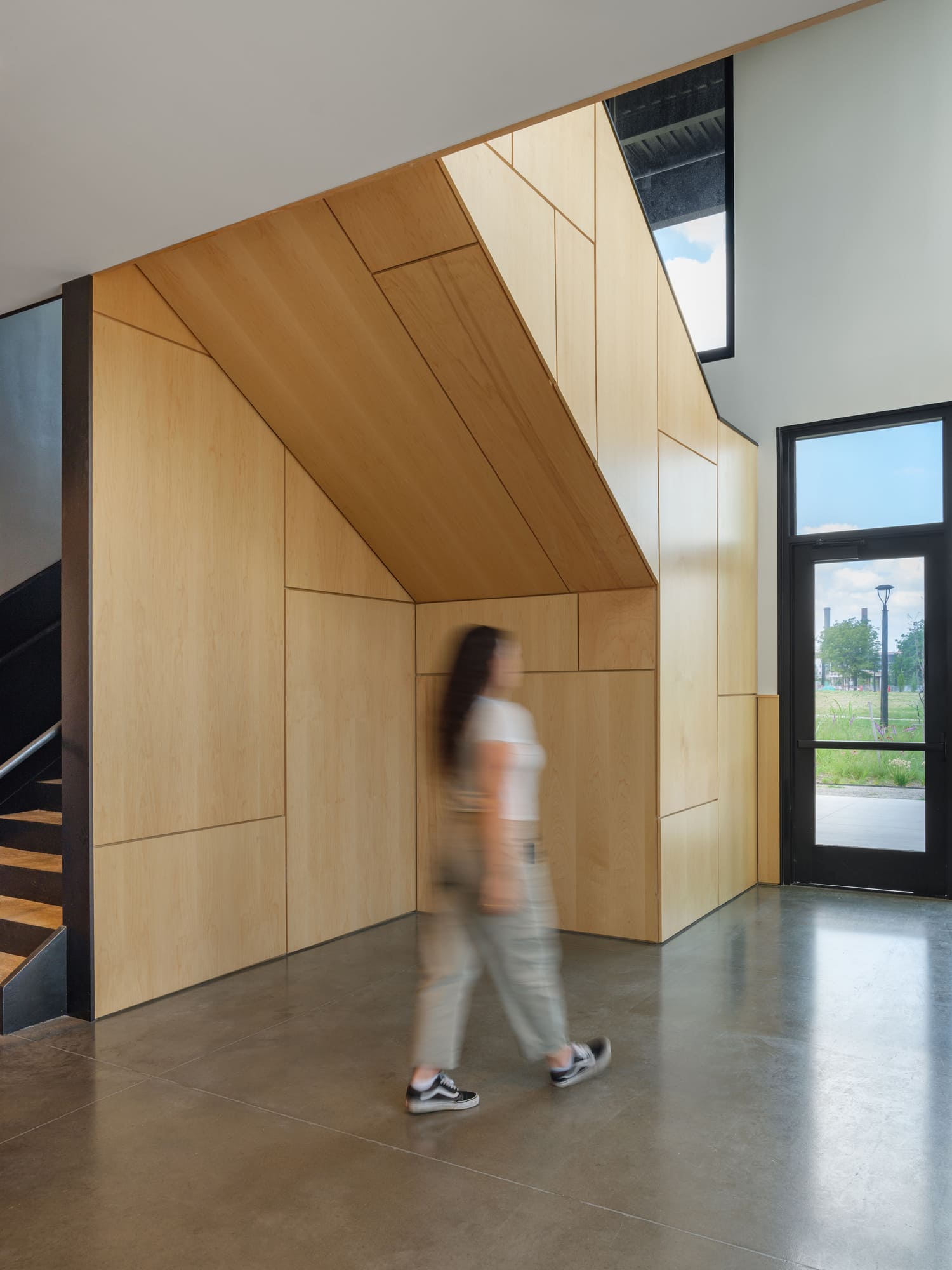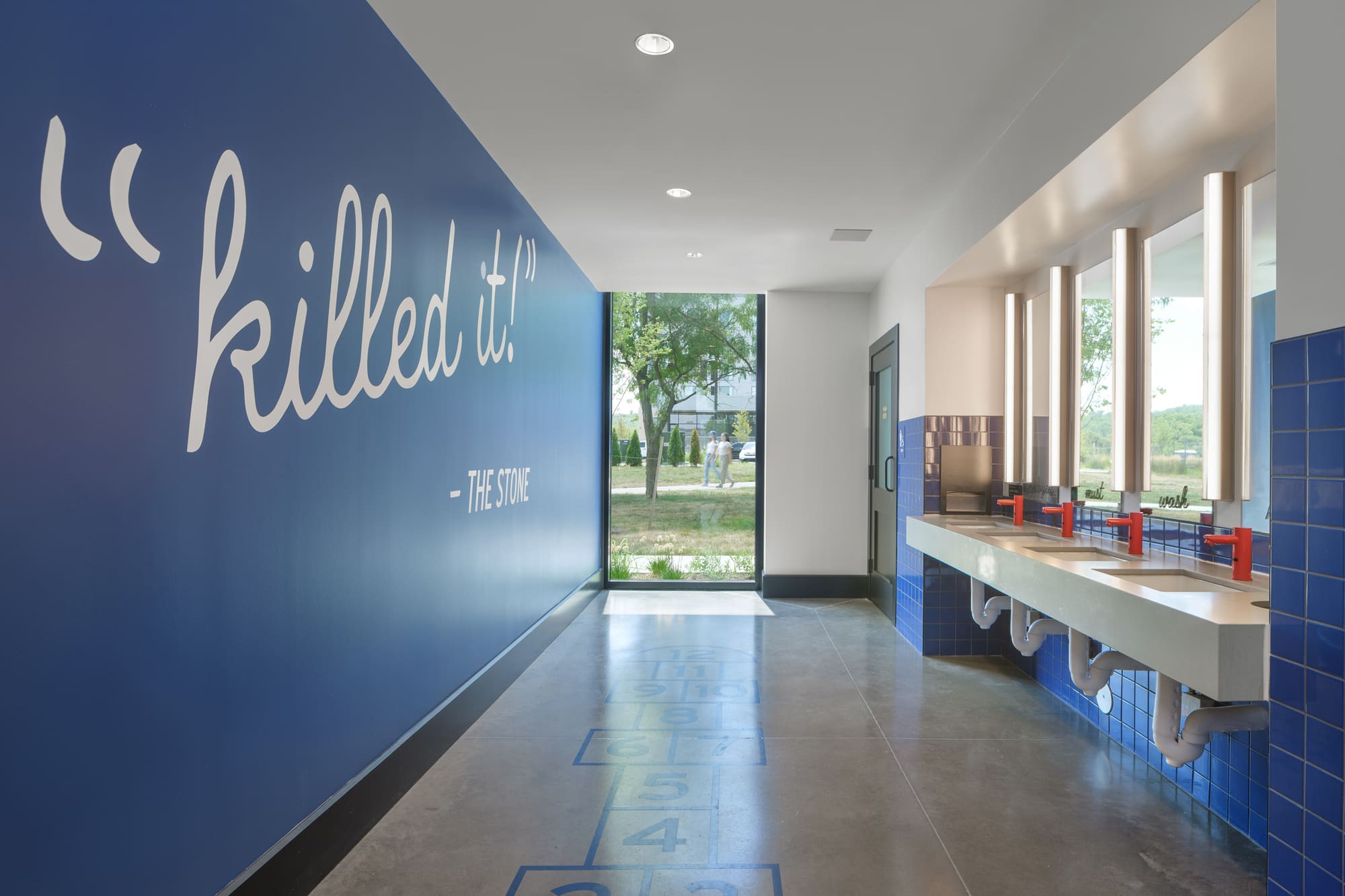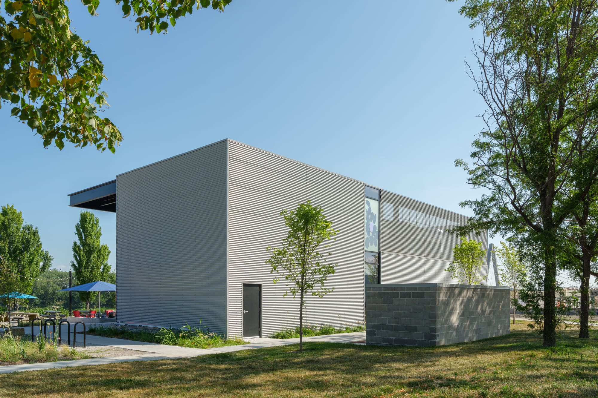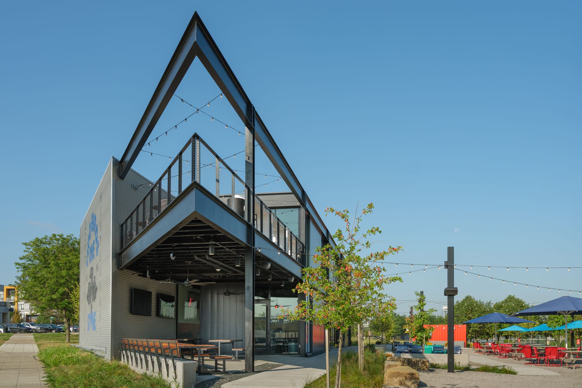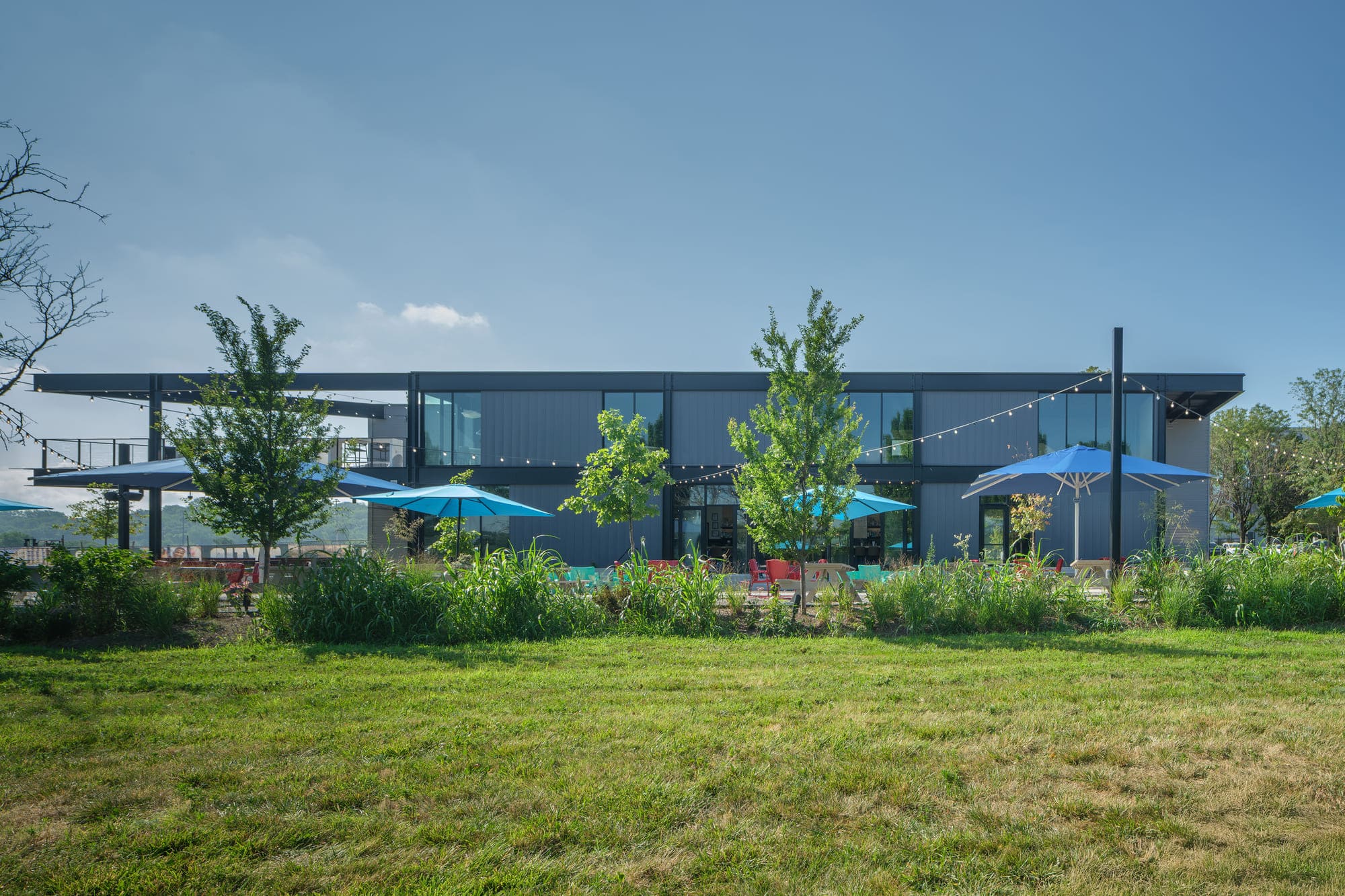 Nestled within an existing grove of trees, the project emphasizes connection to the tree canopy, river, and adjacent park activity. The two-story building accommodates a beer hall, kitchen, cocktail bar, and rooftop deck, bringing a new amenity to the riverfront.