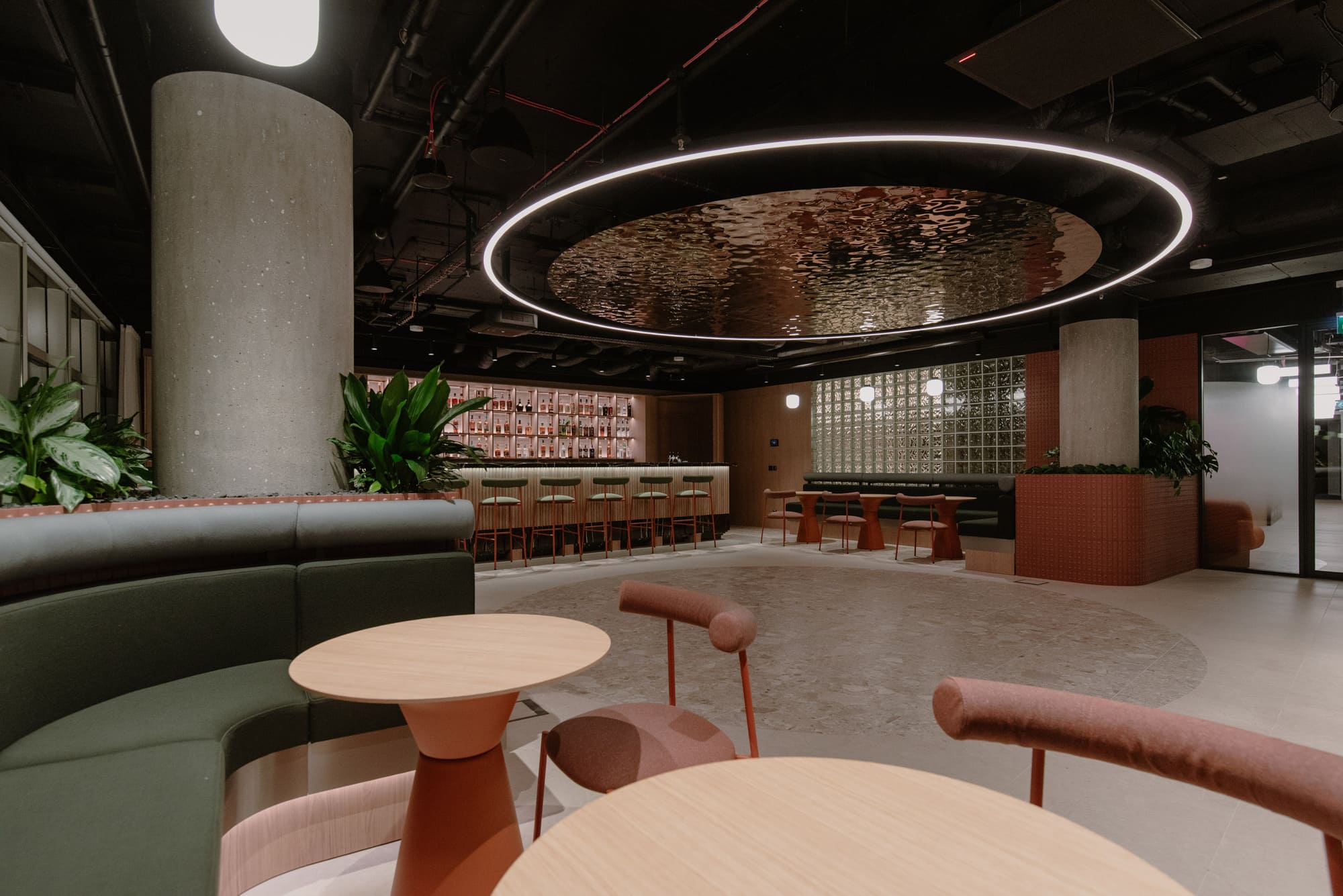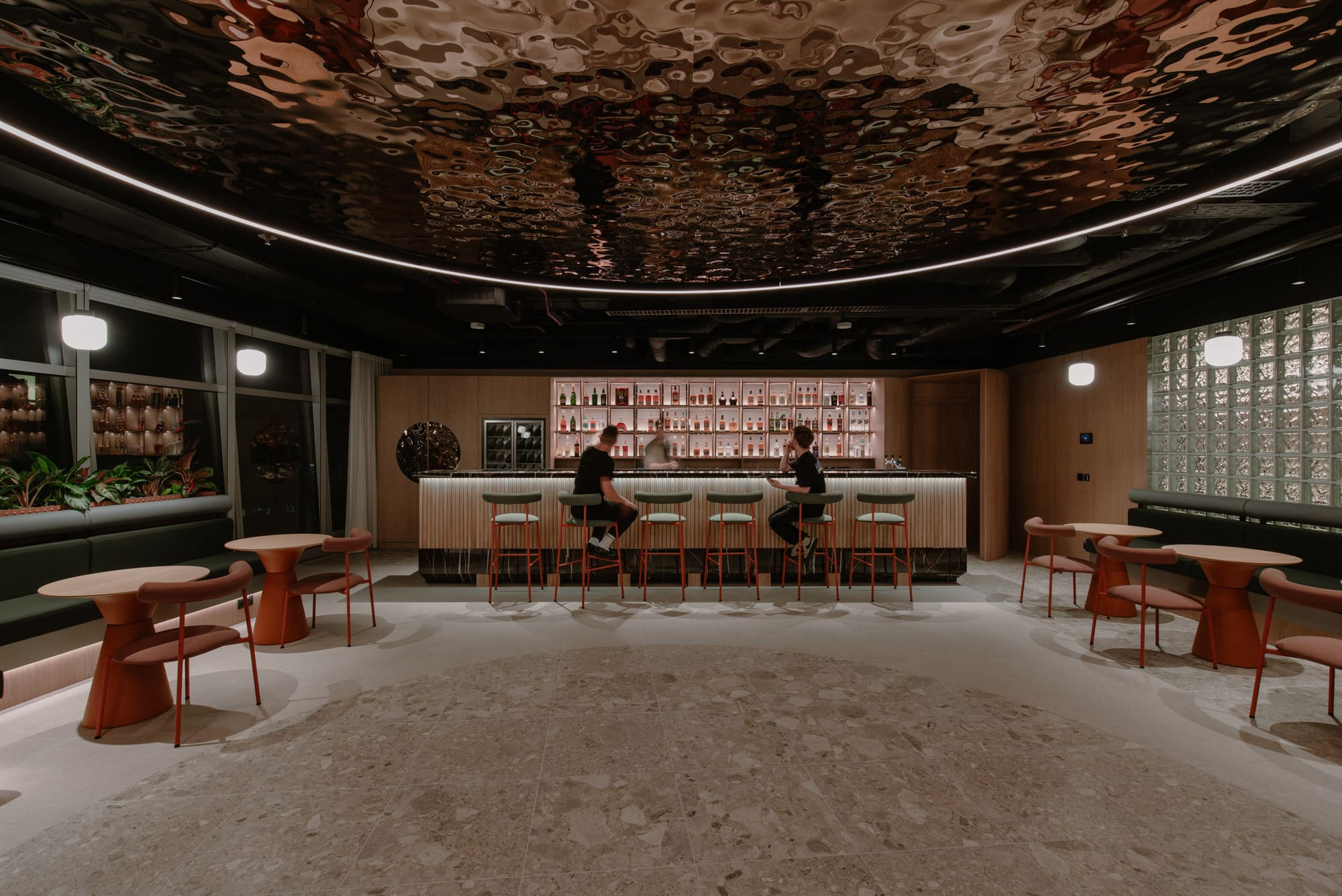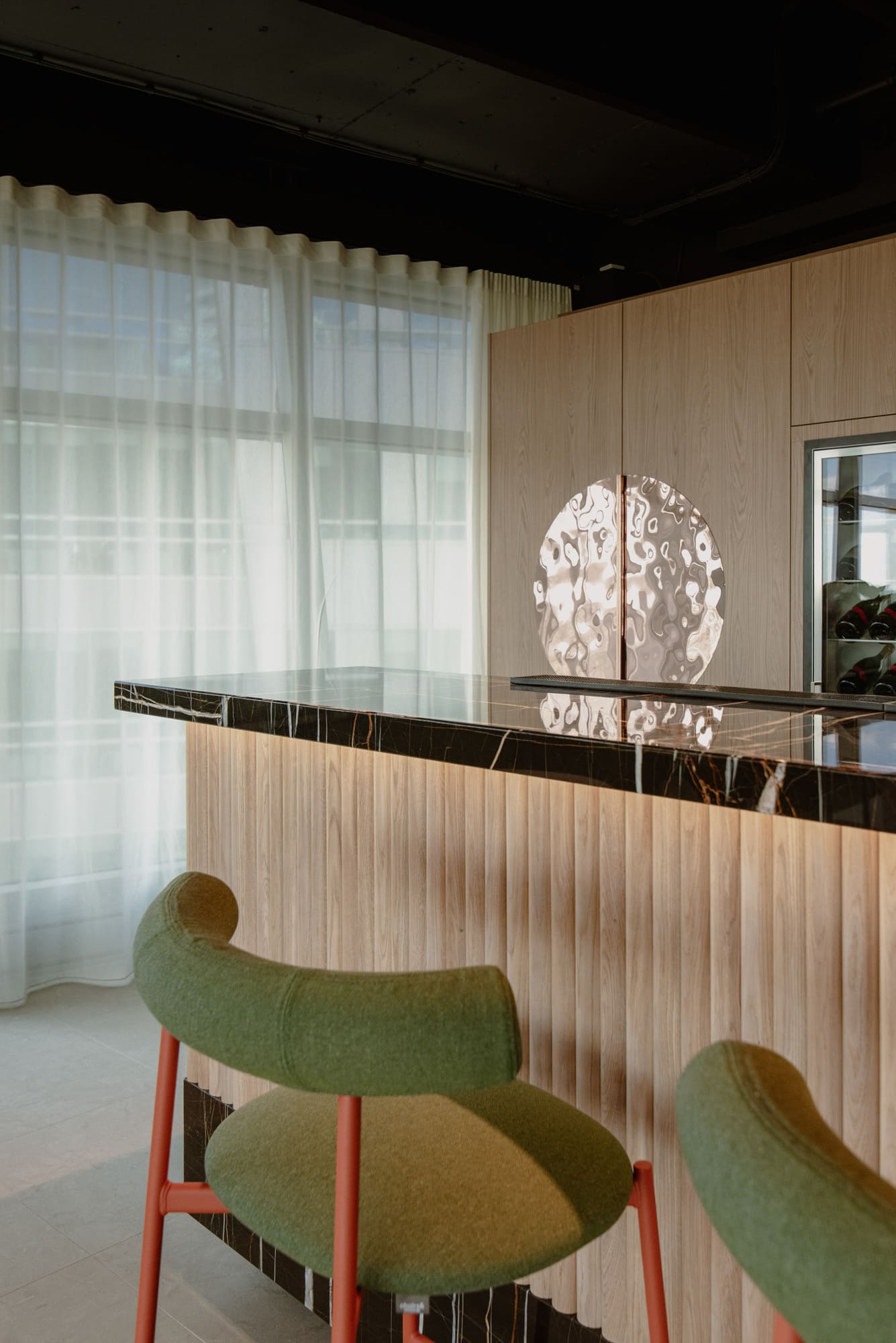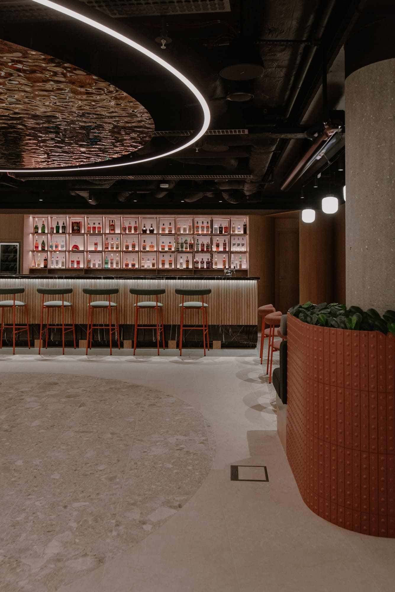 The bar is the most spectacular part of the office, symbolizing openness and hospitality. Its centerpiece is a large, suspended circular ceiling made of decorative copper-colored wavy metal, inspired by traditional distillation vats. A central, four-meter black marble bar with golden-white veins, complemented by wooden half-rounds and oak cubes with reinforced glass showcasing bottles from the group’s portfolio, defines the space. Comfortable upholstered seating areas enclosed by sculptural planters contrast with brick-red tiles, while the terrazzo flooring in two grey shades emphasizes the circular ceiling feature.