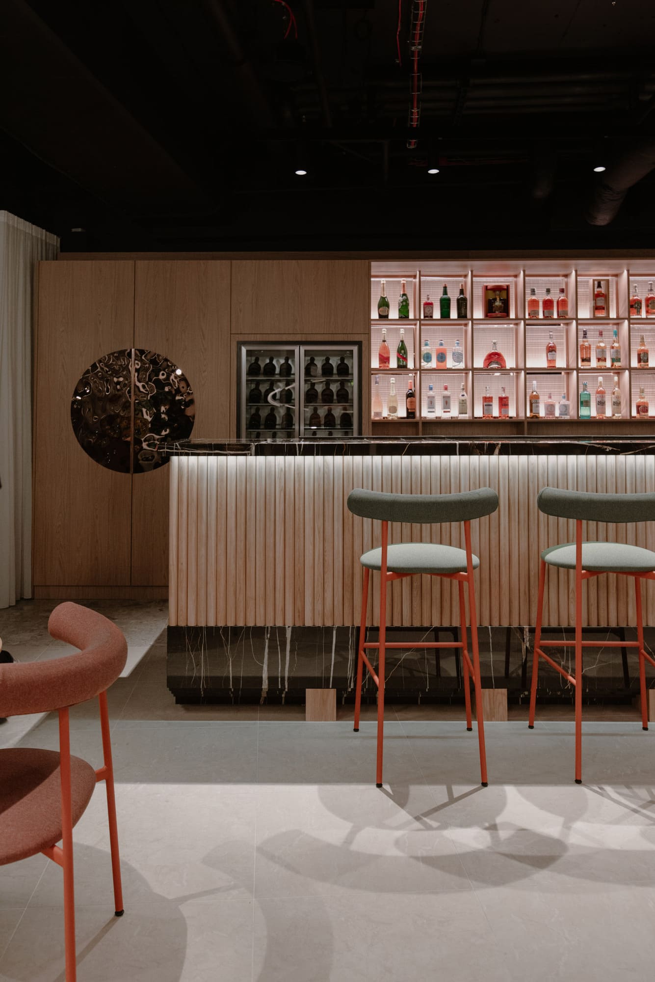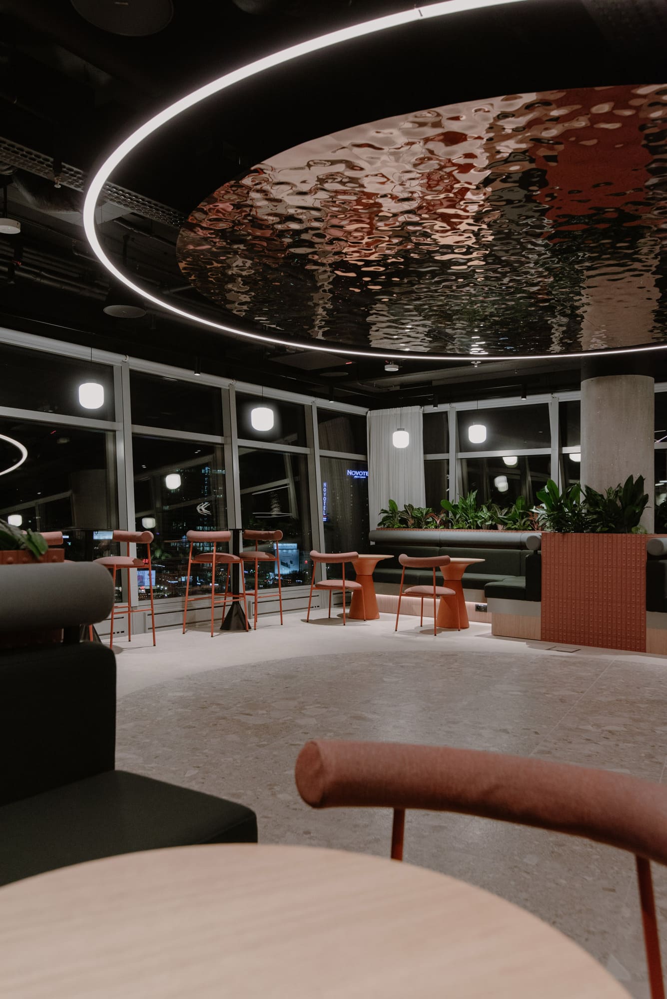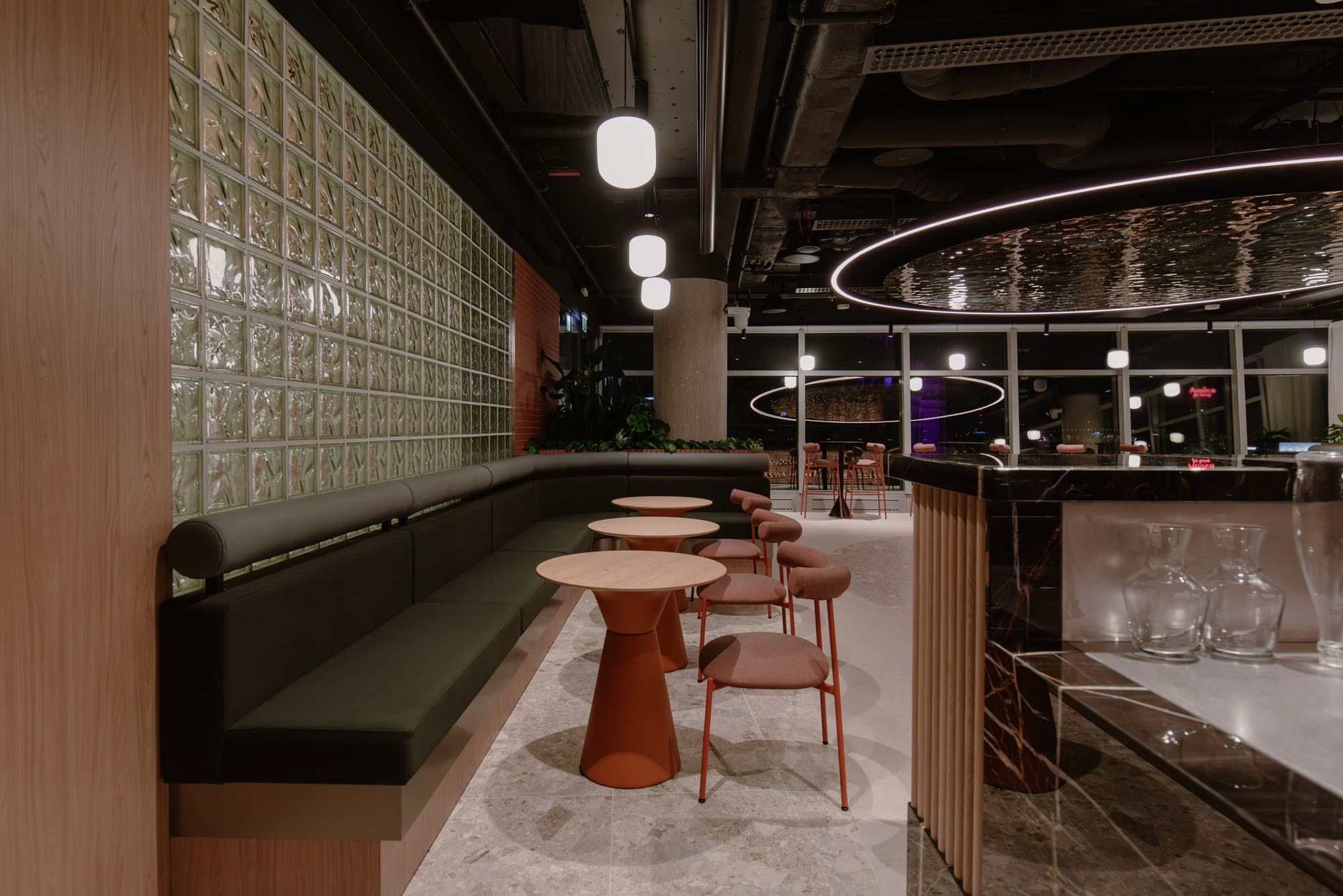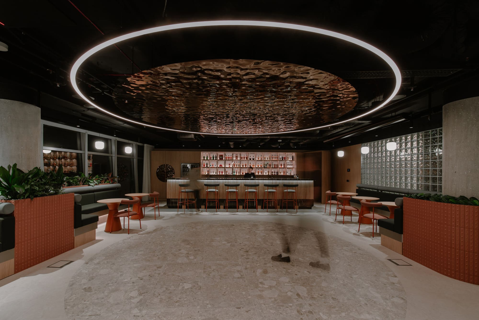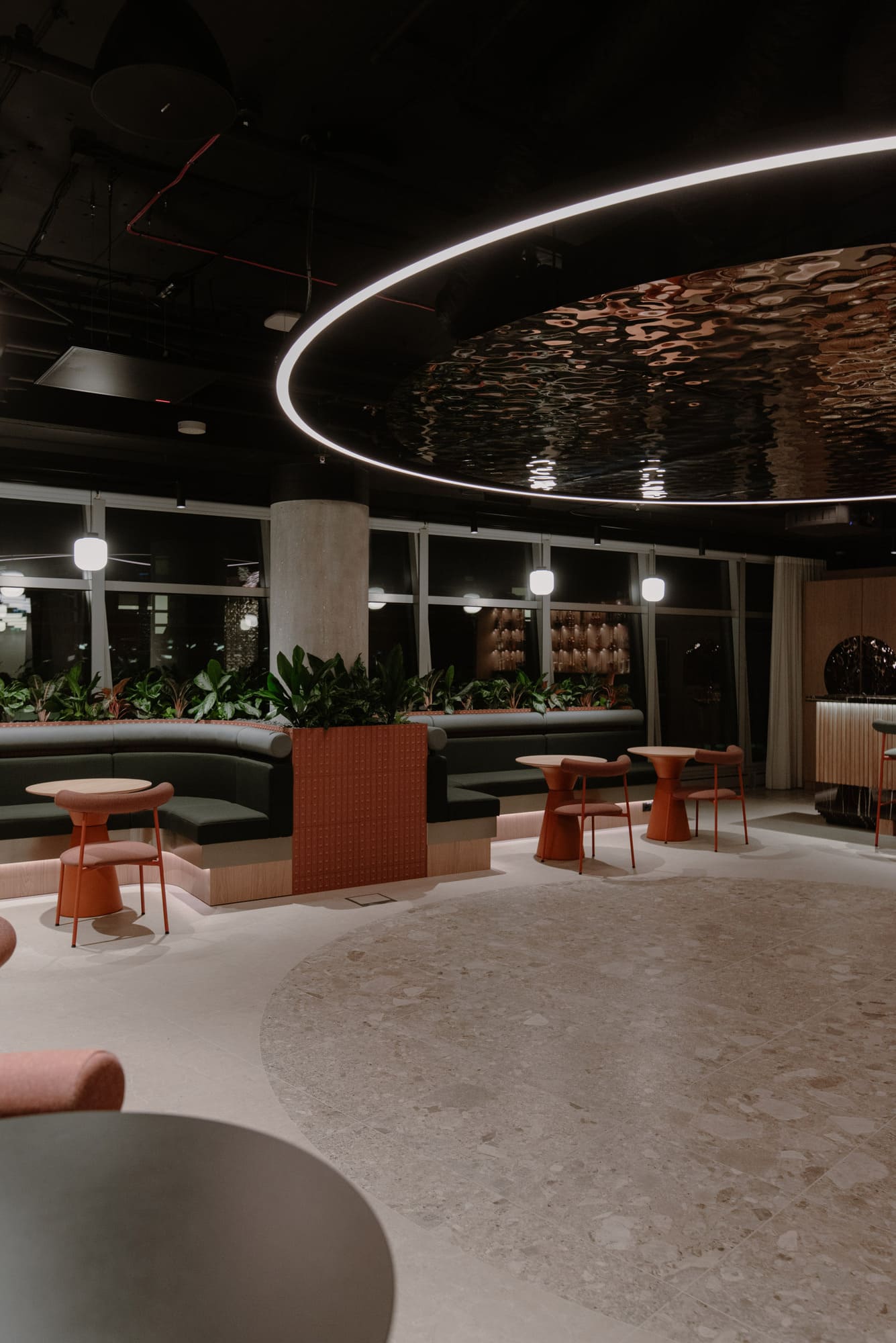 The bar is the most spectacular part of the office, symbolizing openness and hospitality. Its centerpiece is a large, suspended circular ceiling made of decorative copper-colored wavy metal, inspired by traditional distillation vats. A central, four-meter black marble bar with golden-white veins, complemented by wooden half-rounds and oak cubes with reinforced glass showcasing bottles from the group’s portfolio, defines the space. Comfortable upholstered seating areas enclosed by sculptural planters contrast with brick-red tiles, while the terrazzo flooring in two grey shades emphasizes the circular ceiling feature.