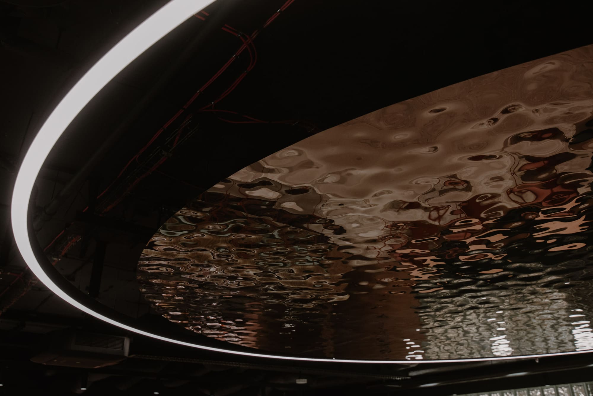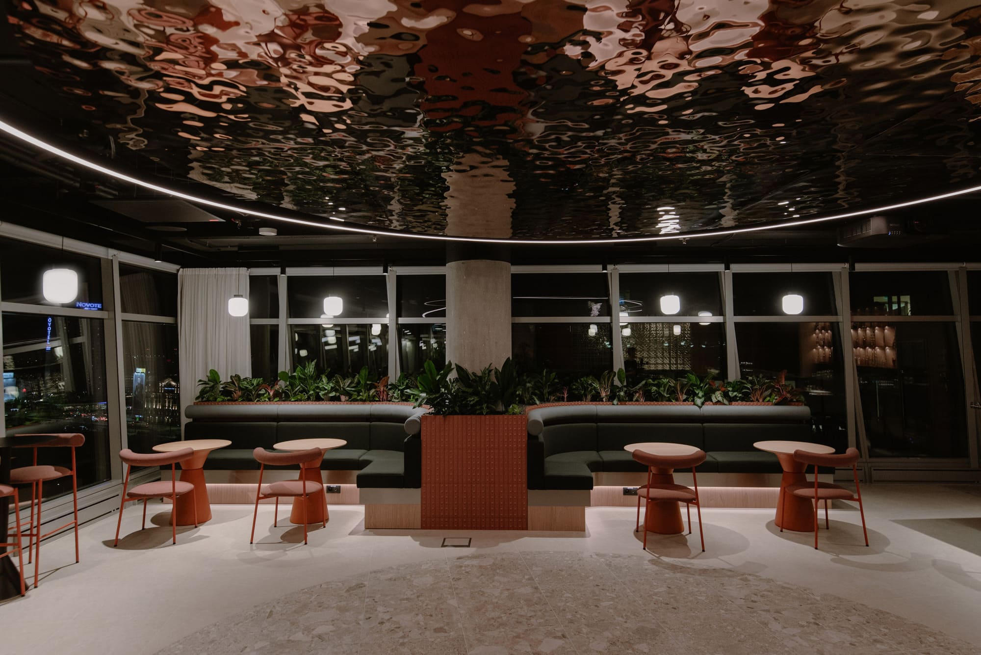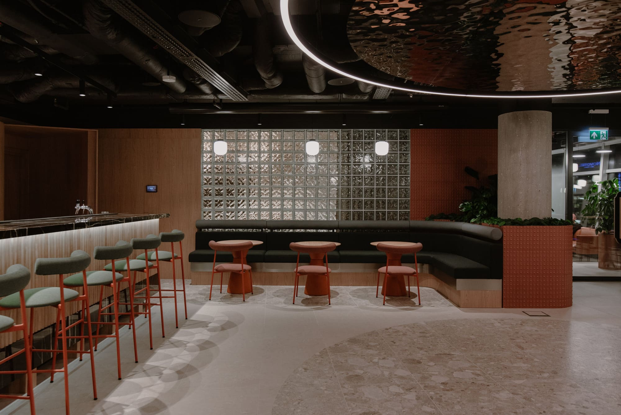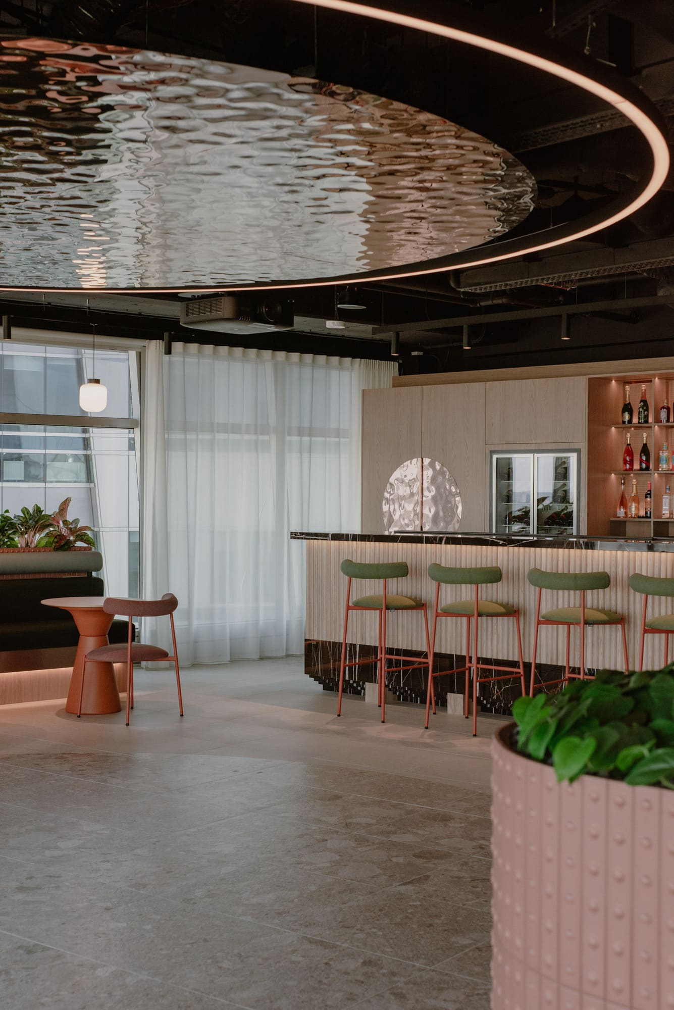 The bar is the most spectacular part of the office, symbolizing openness and hospitality. Its centerpiece is a large, suspended circular ceiling made of decorative copper-colored wavy metal, inspired by traditional distillation vats. A central, four-meter black marble bar with golden-white veins, complemented by wooden half-rounds and oak cubes with reinforced glass showcasing bottles from the group’s portfolio, defines the space. Comfortable upholstered seating areas enclosed by sculptural planters contrast with brick-red tiles, while the terrazzo flooring in two grey shades emphasizes the circular ceiling feature.