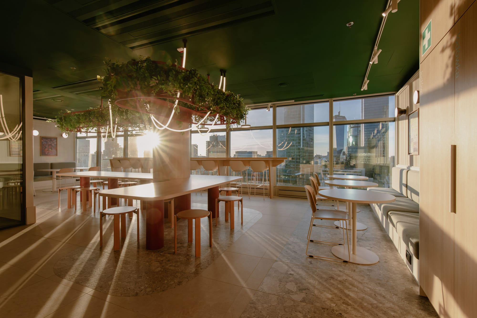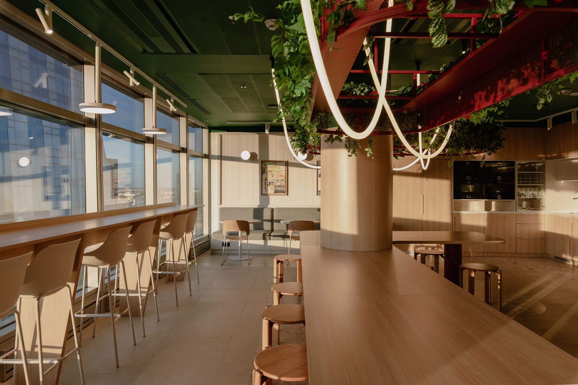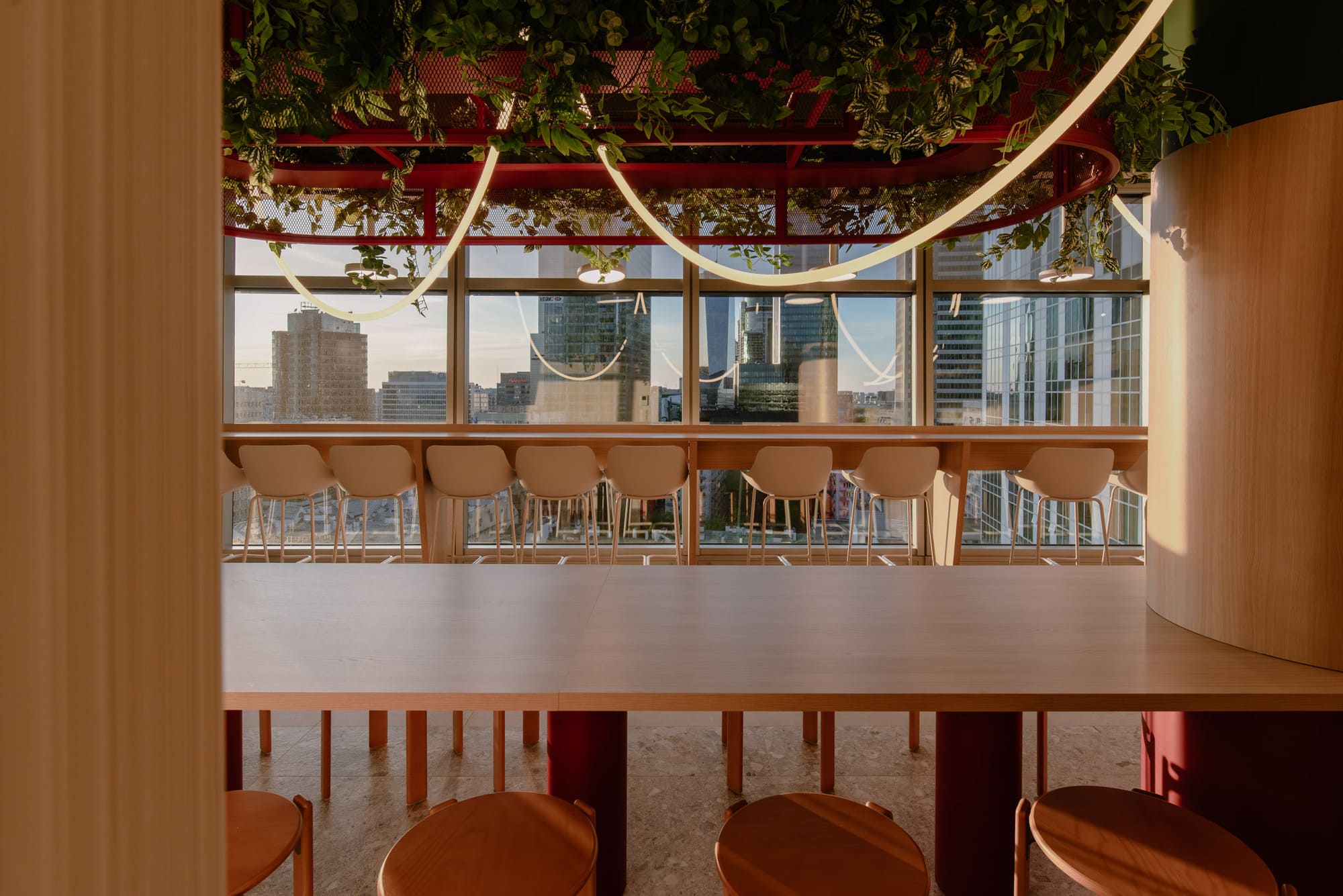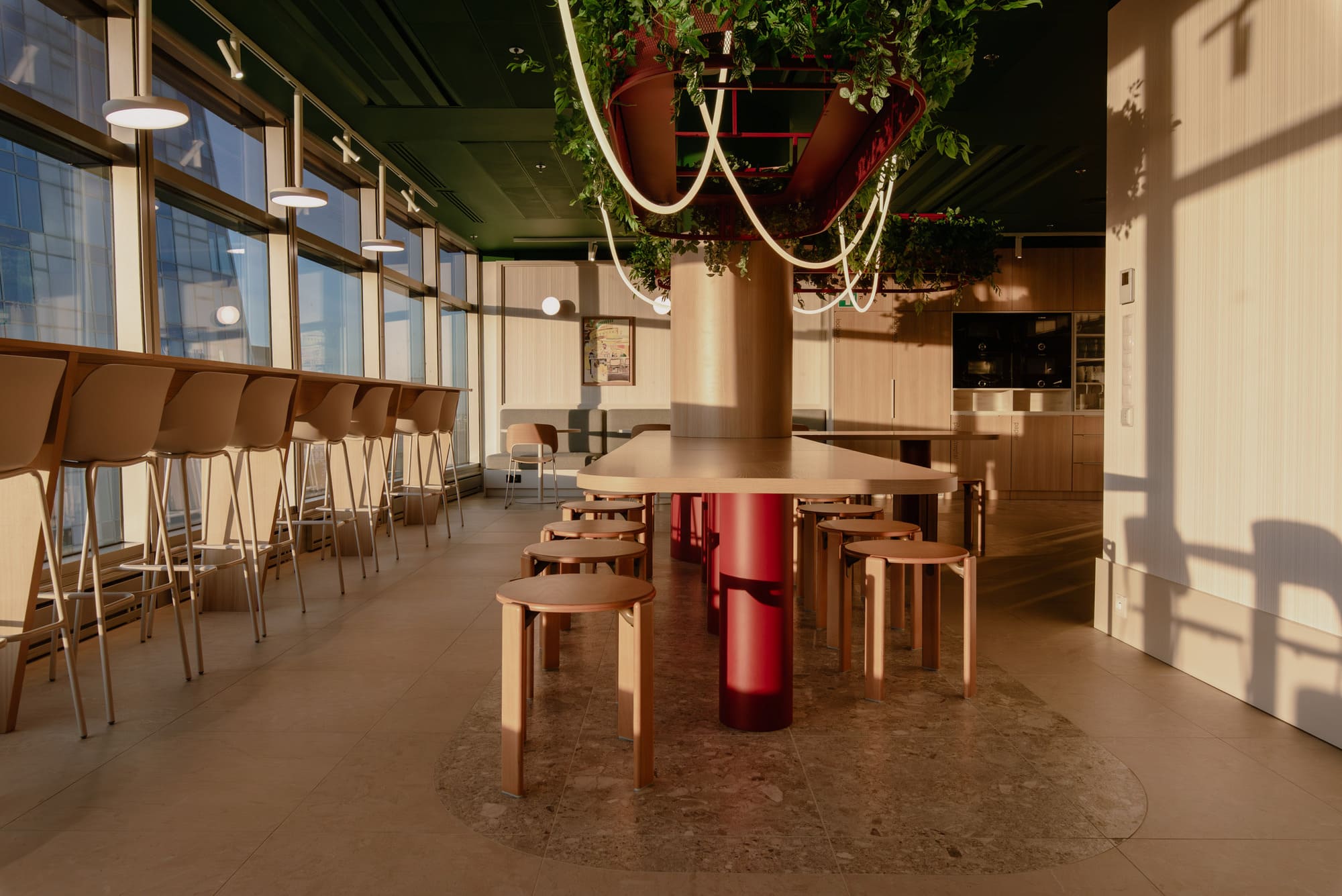 The spacious and bright kitchen is the heart of the office, inviting communal breaks and integration. A large communal table with stools in light wood acts as a meeting hub, beneath a steel installation with plants and flexible red light tubes against a dark green ceiling—colors inspired by one of the group’s brands. A table with bar stools offers a spectacular city view from panoramic windows.