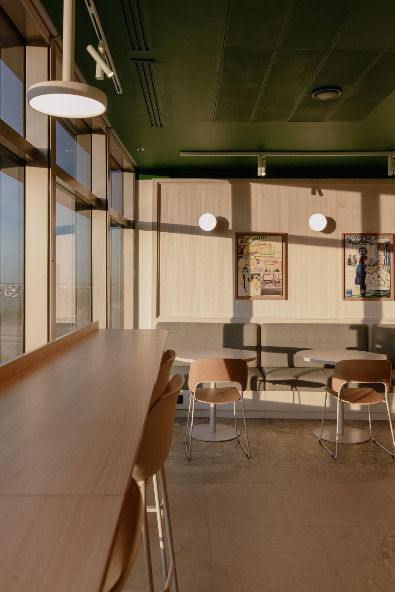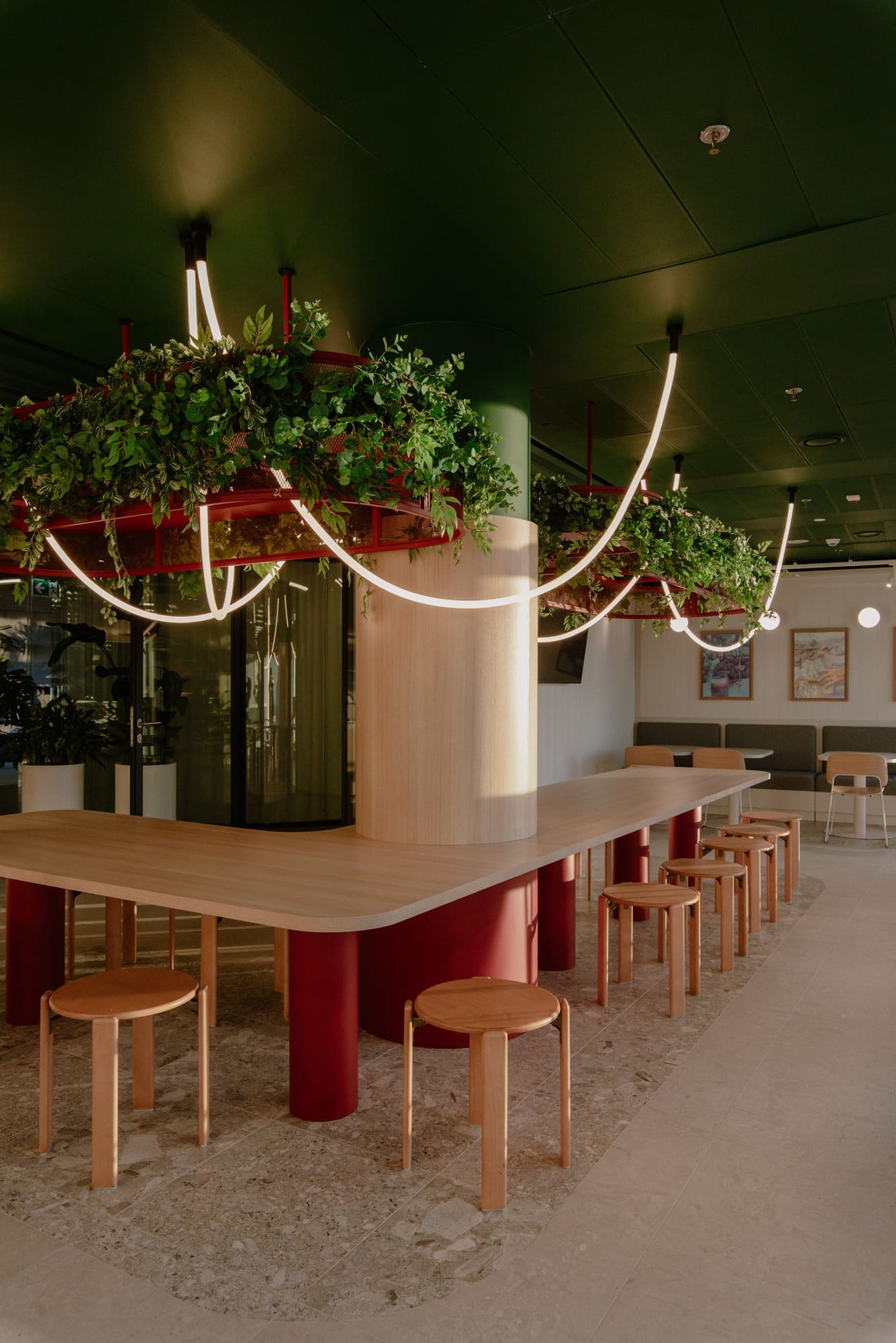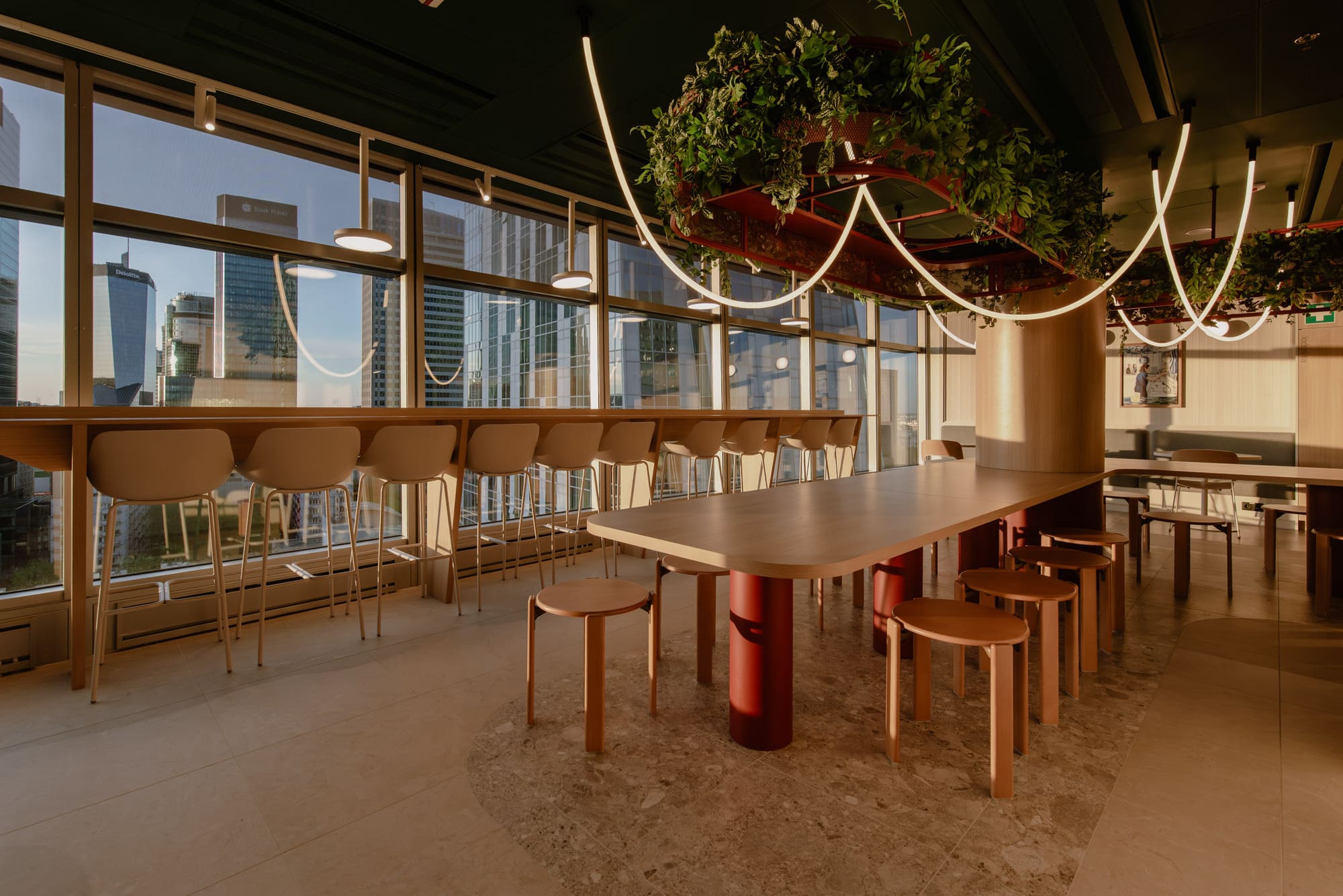 The spacious and bright kitchen is the heart of the office, inviting communal breaks and integration. A large communal table with stools in light wood acts as a meeting hub, beneath a steel installation with plants and flexible red light tubes against a dark green ceiling—colors inspired by one of the group’s brands. A table with bar stools offers a spectacular city view from panoramic windows.
