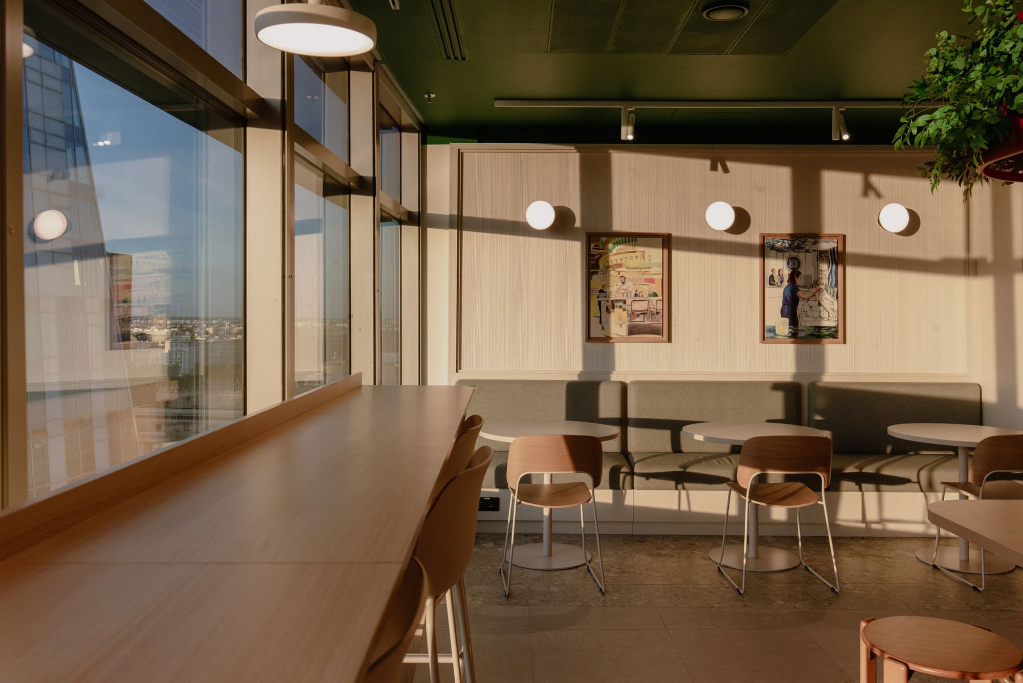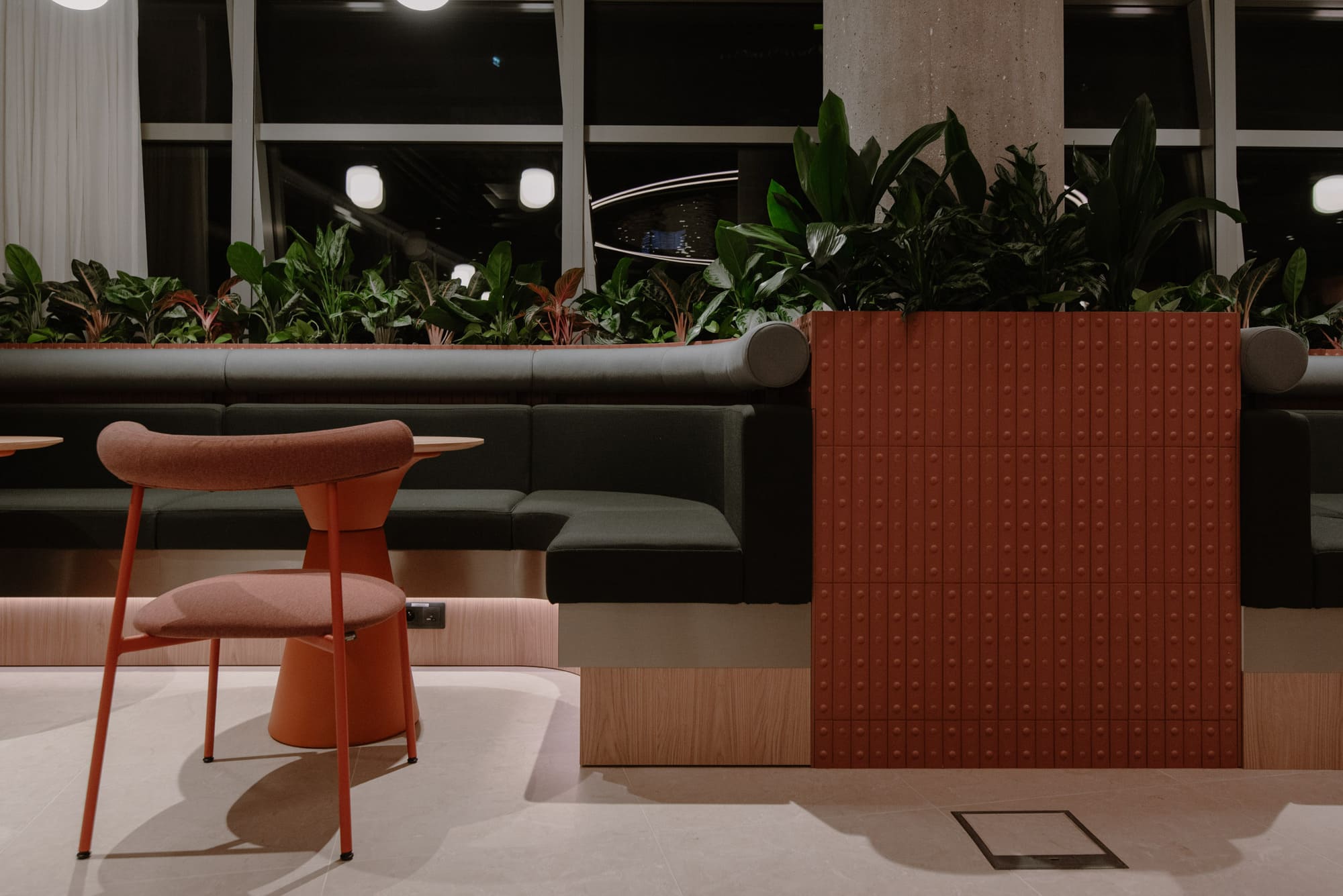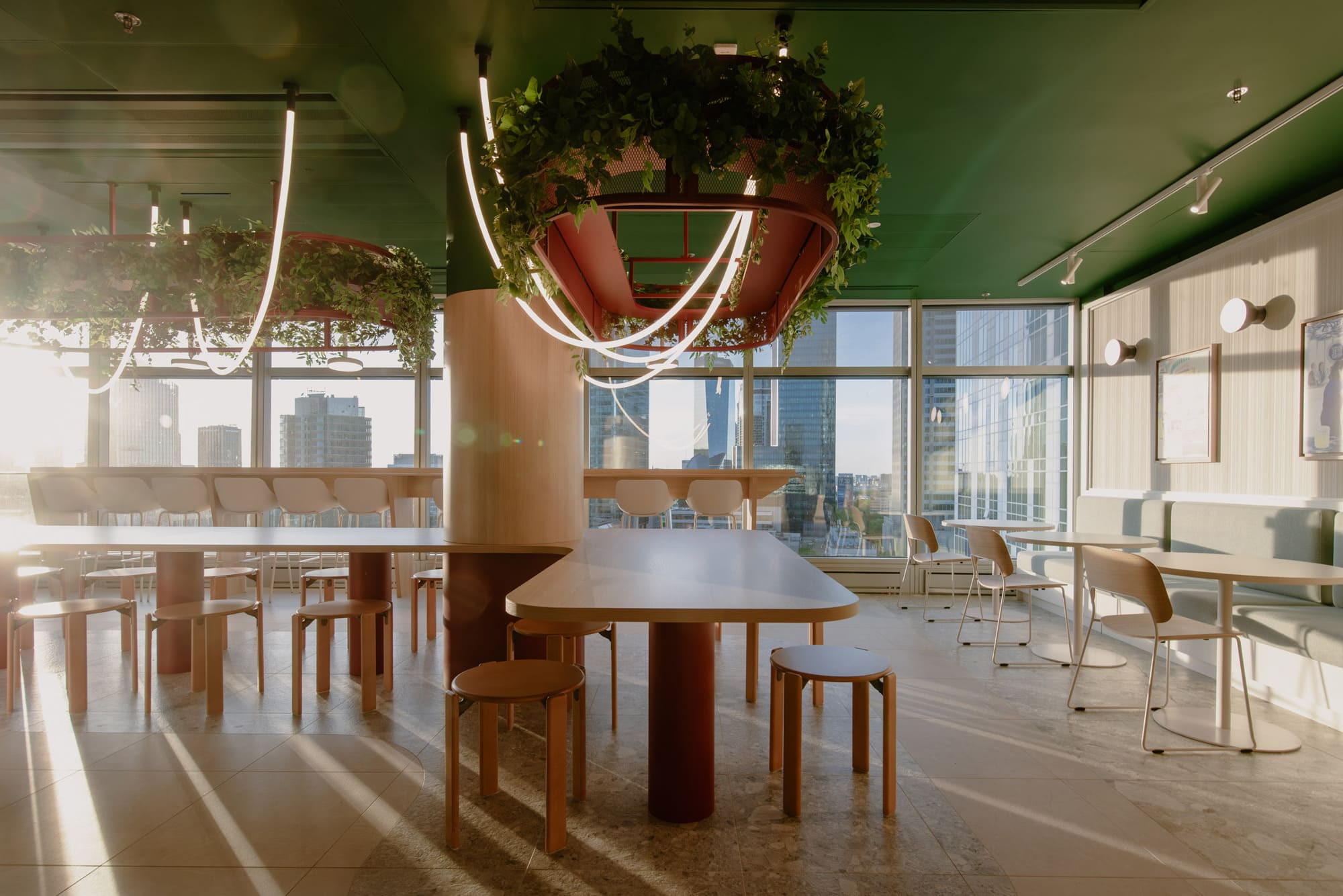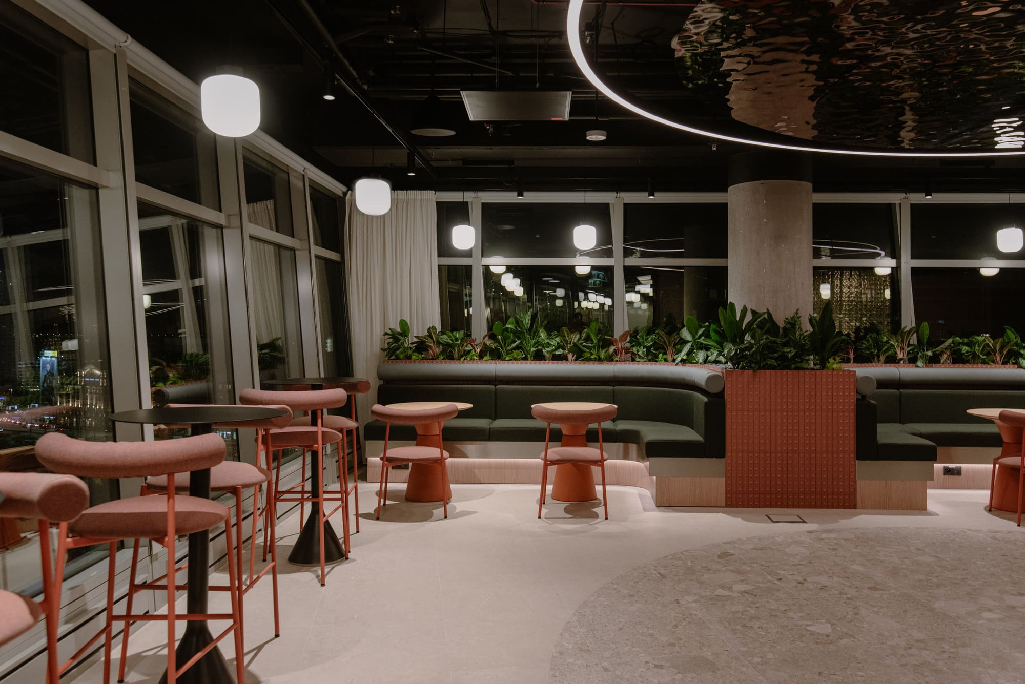 The spacious and bright kitchen is the heart of the office, inviting communal breaks and integration. A large communal table with stools in light wood acts as a meeting hub, beneath a steel installation with plants and flexible red light tubes against a dark green ceiling—colors inspired by one of the group’s brands. A table with bar stools offers a spectacular city view from panoramic windows.