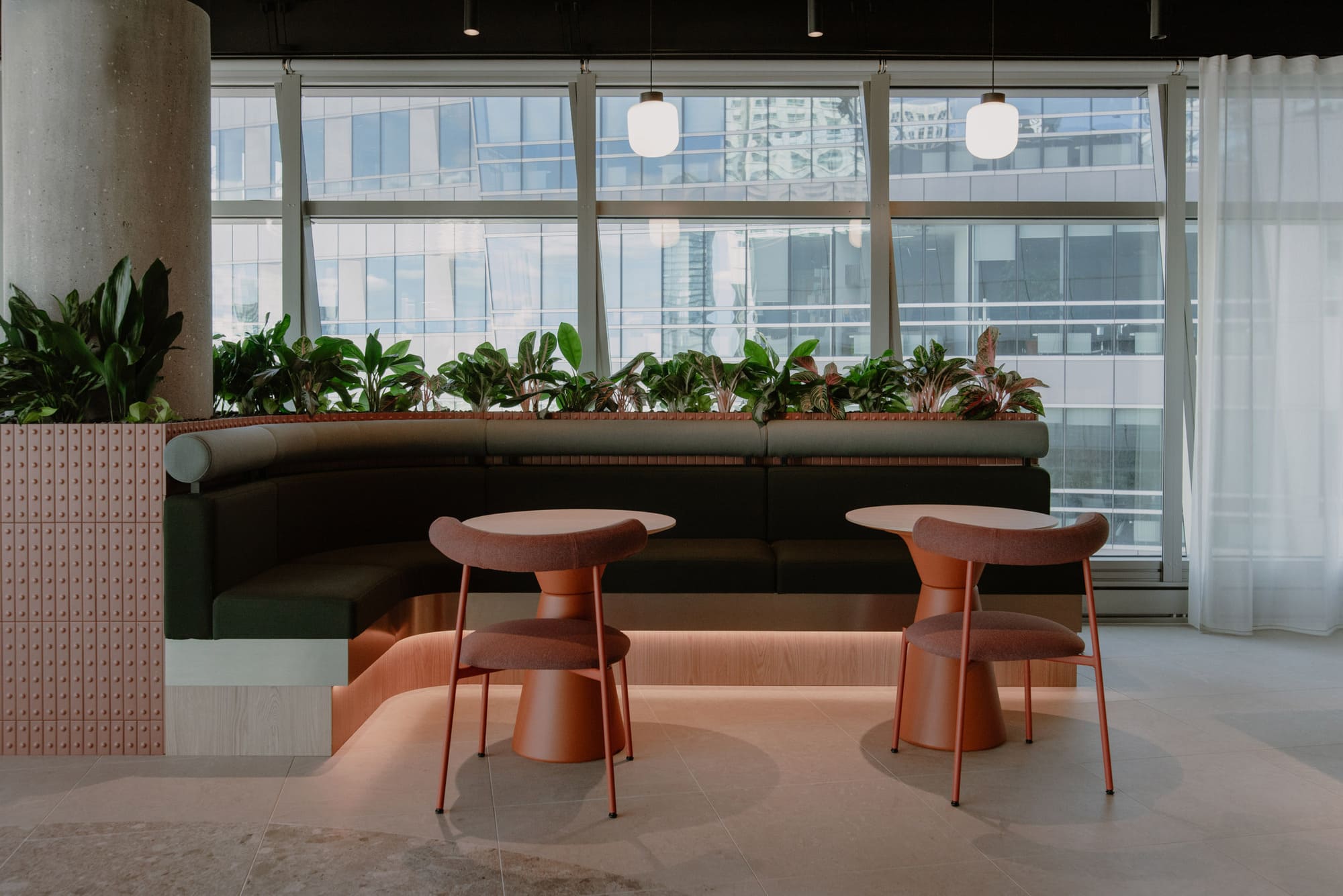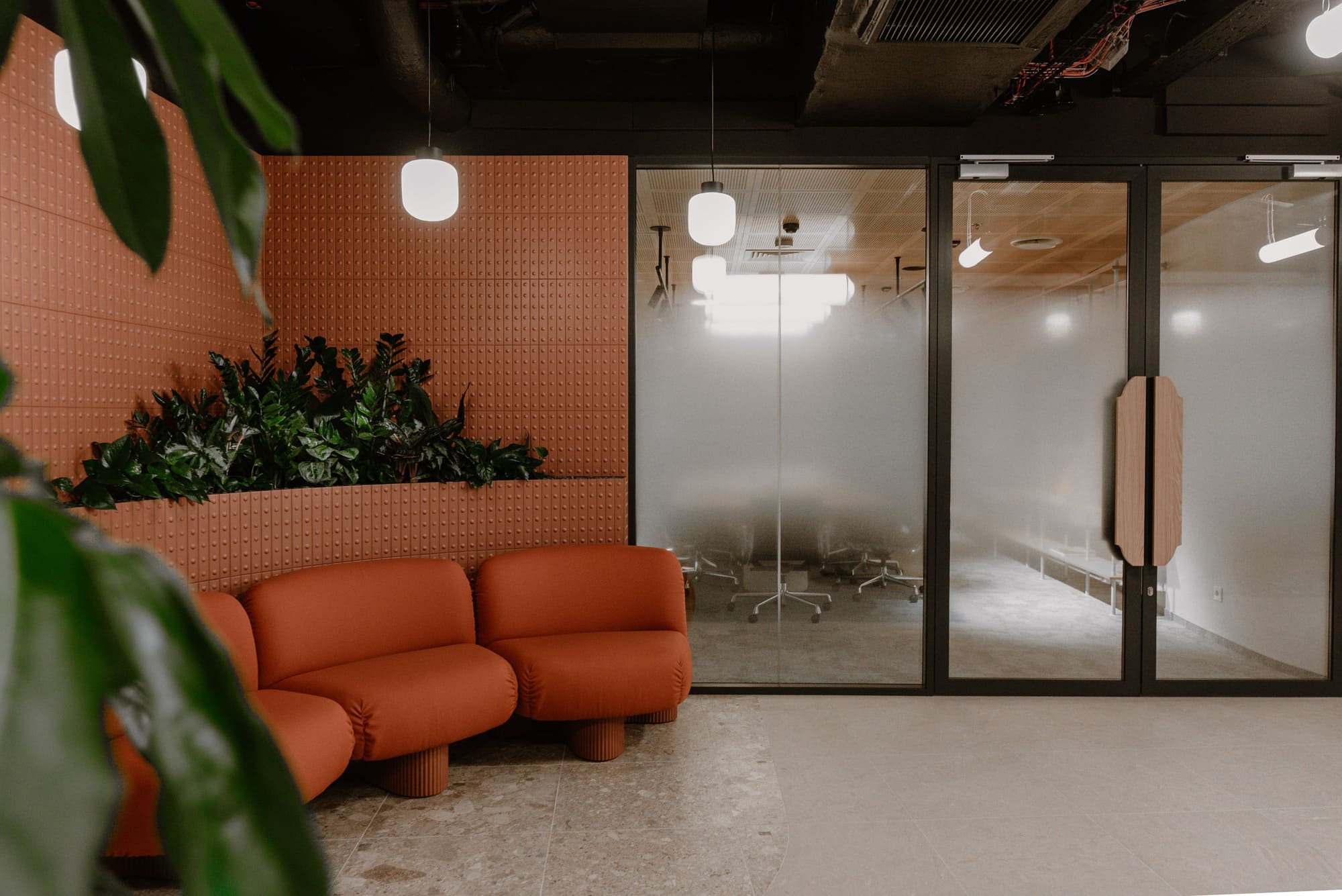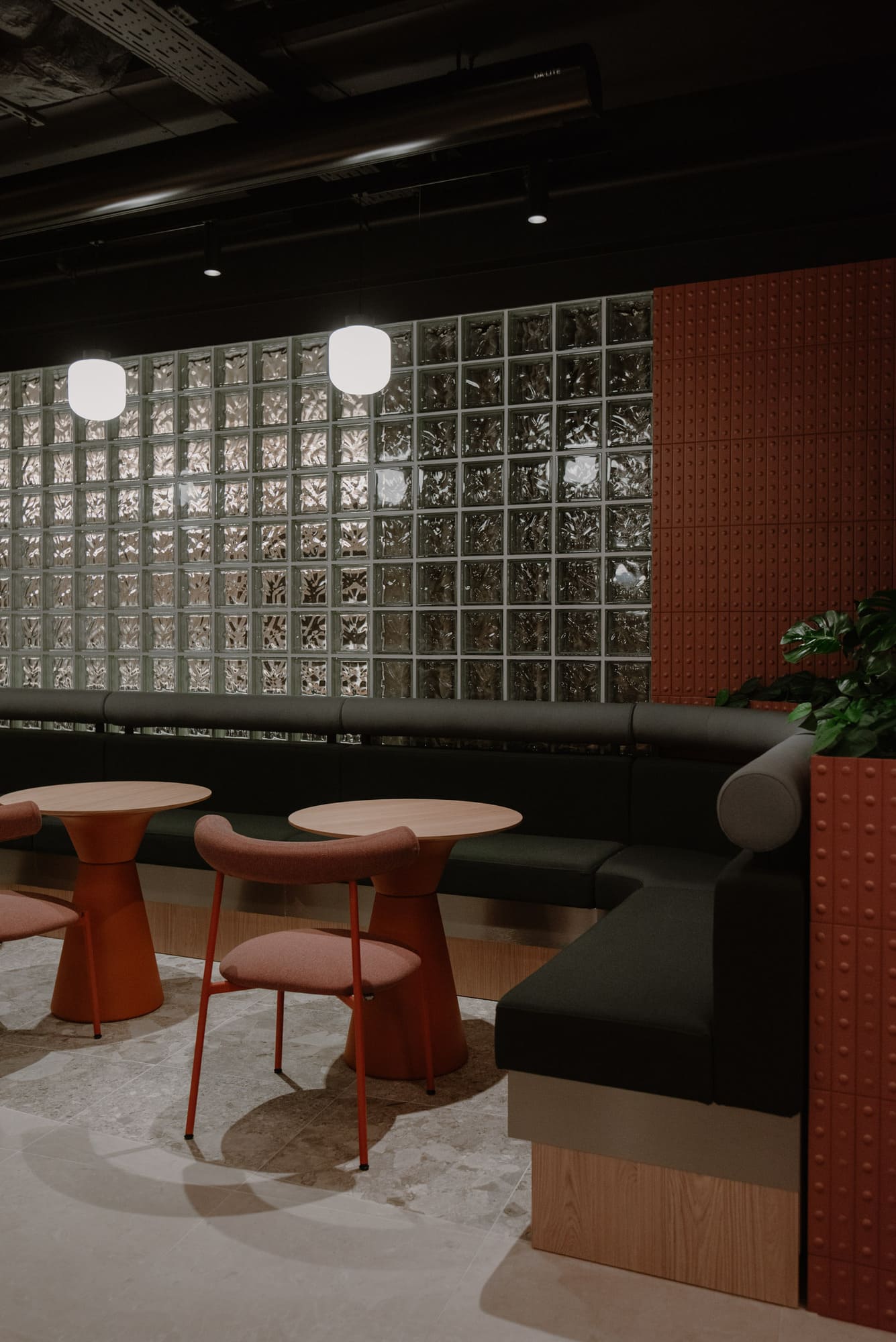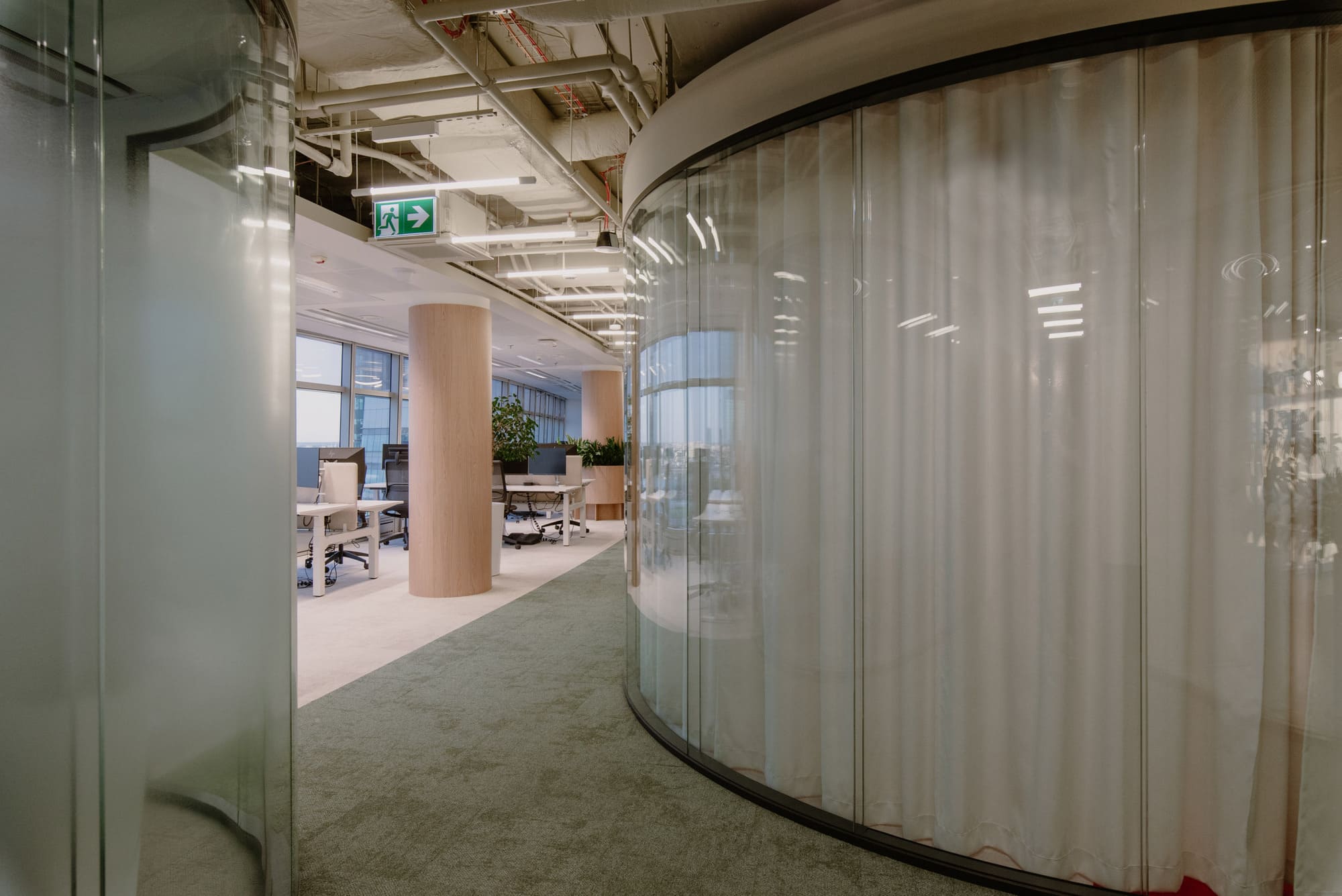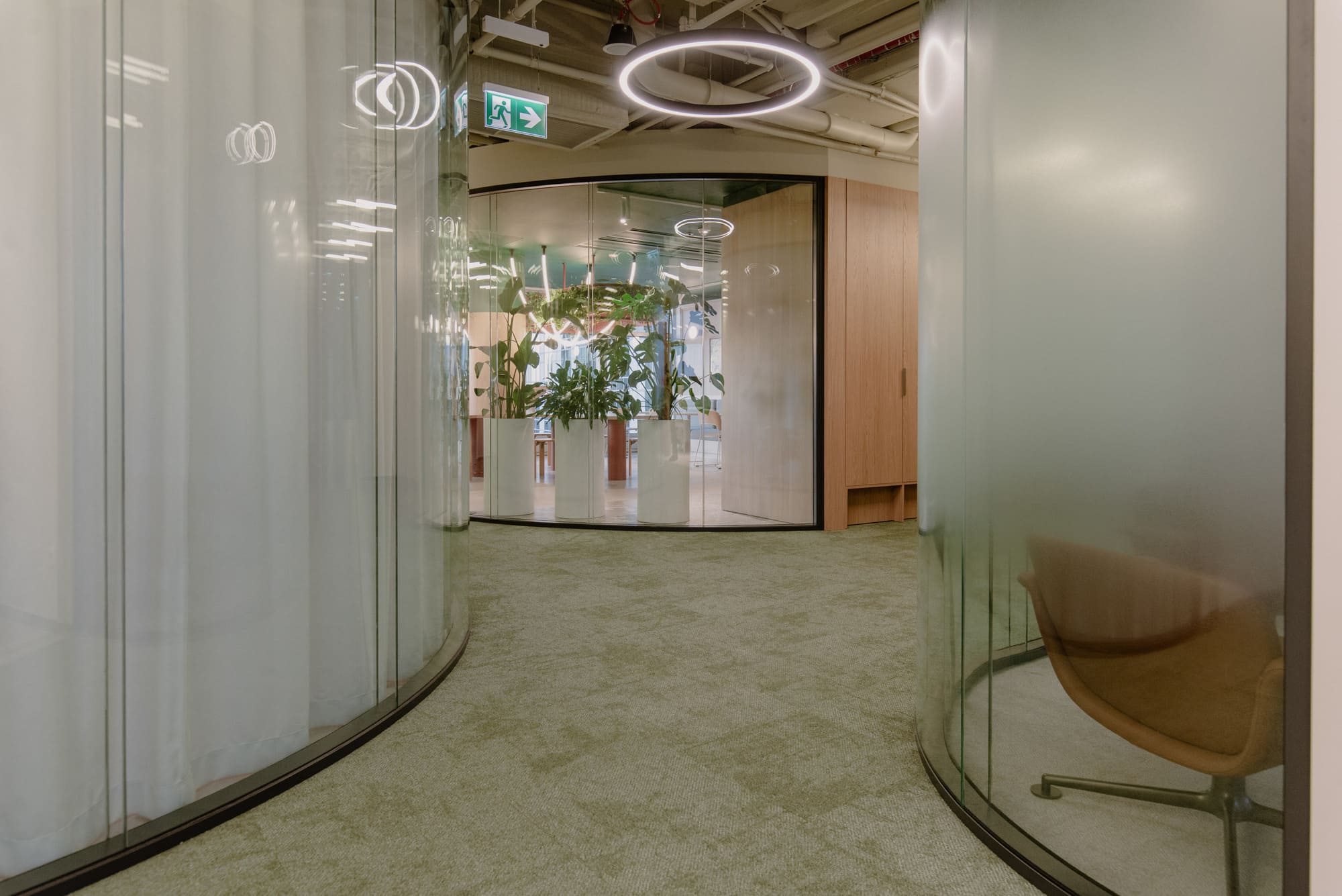 The designers harmoniously integrated the building’s distinctive curved architecture into the interior layout. Rounded furniture corners, phone booths, and focus rooms blend smoothly with the building’s shape, with most glazing featuring a gradient frosted effect, ensuring privacy and a contemporary look.