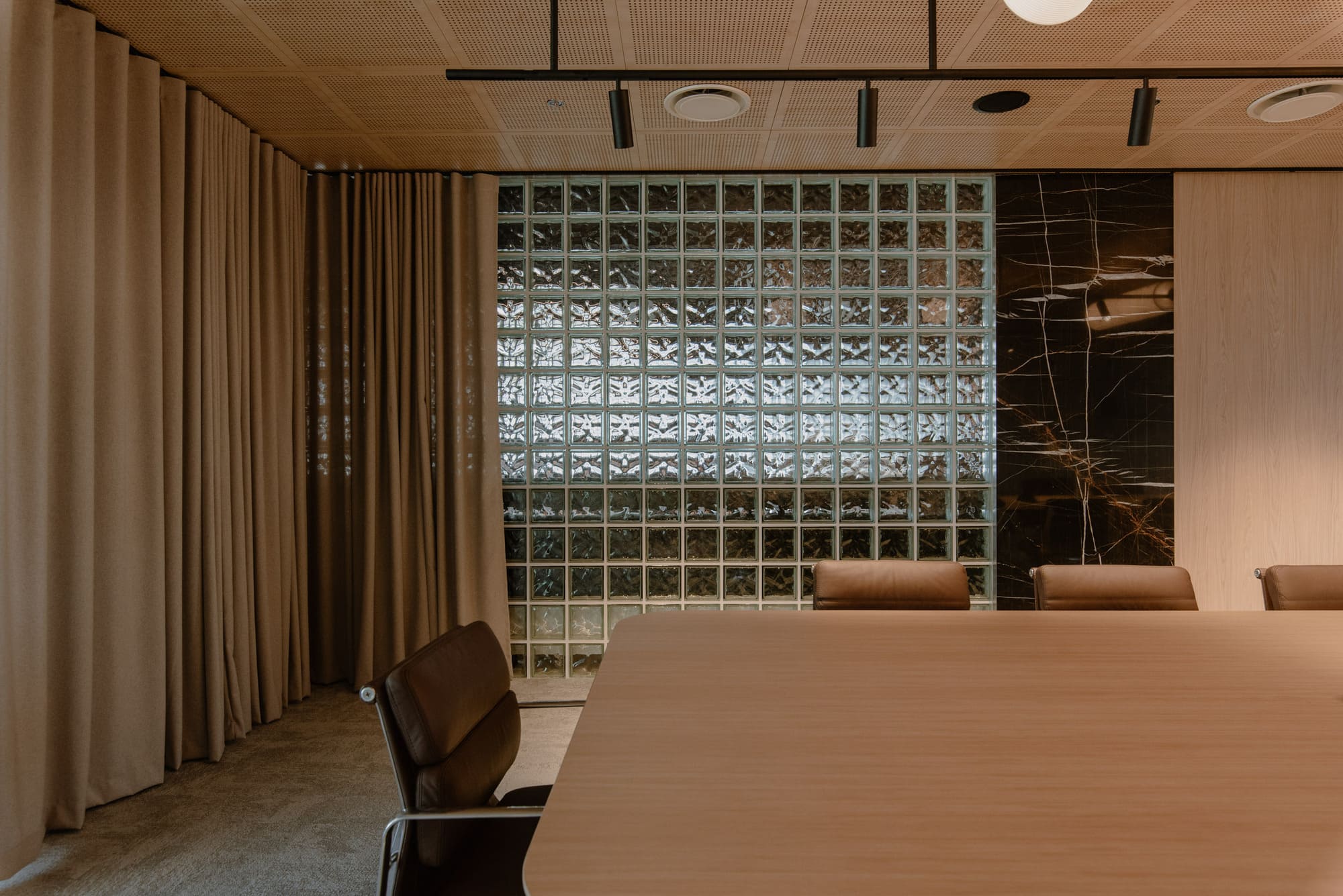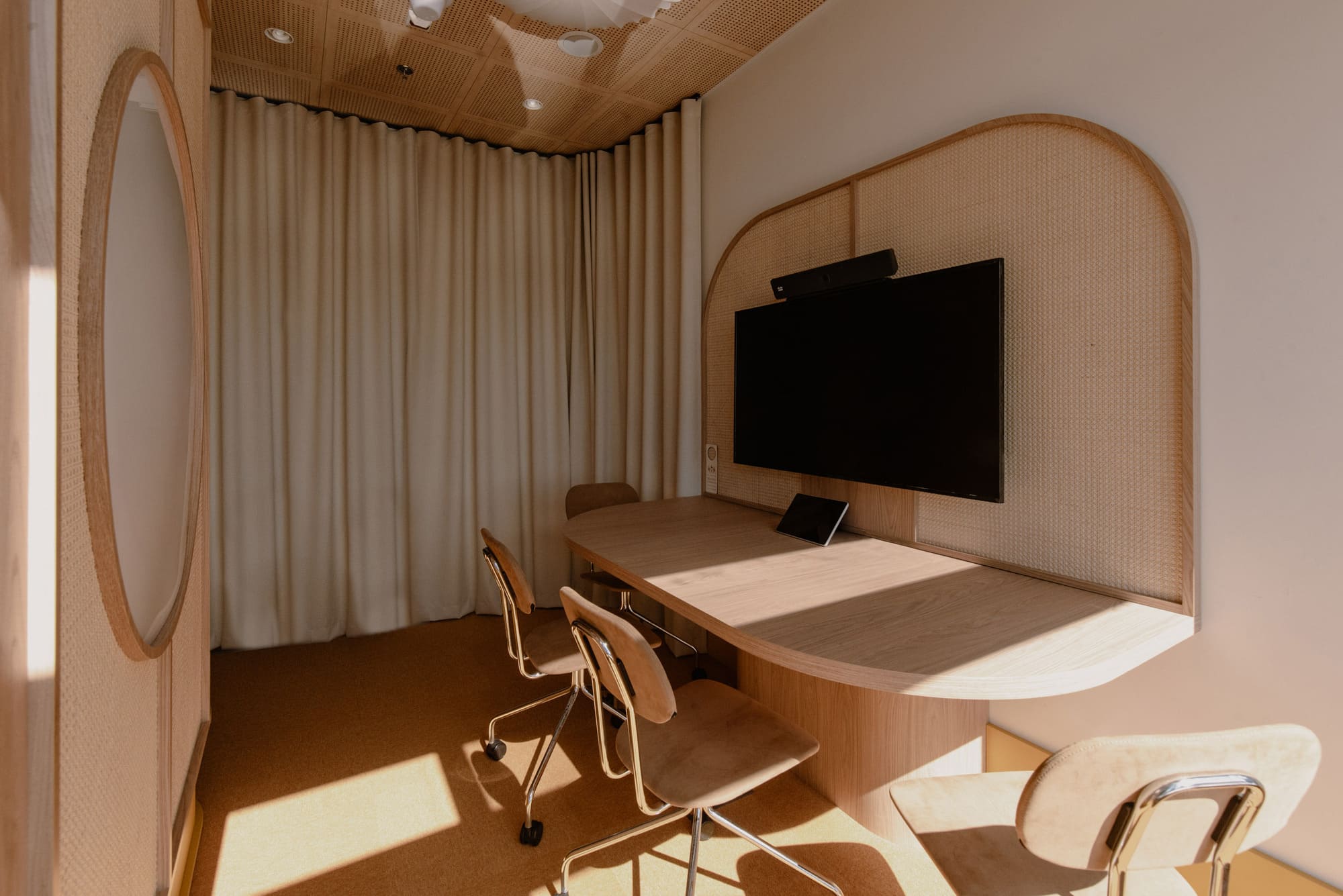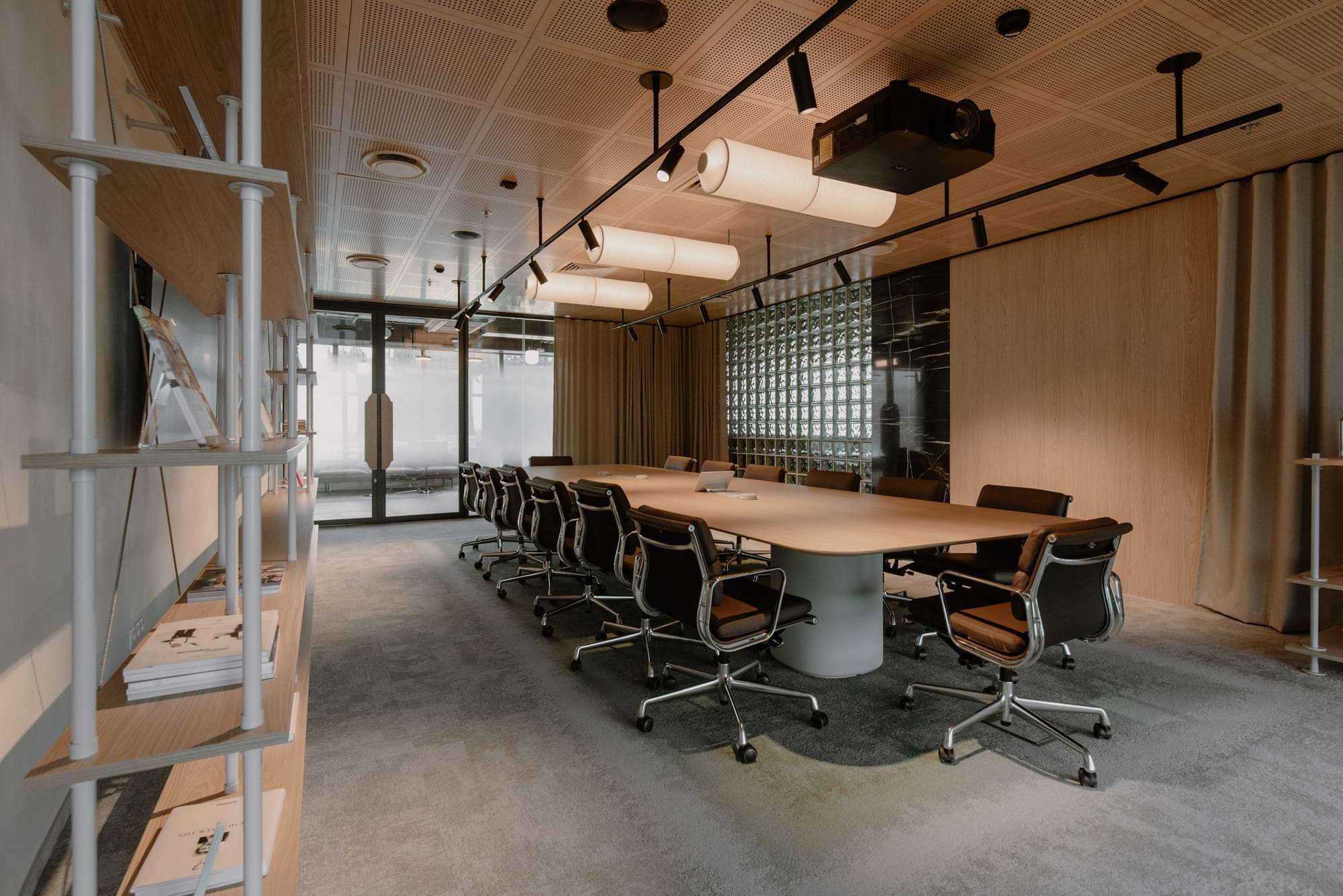 Directly adjacent to the bar, the Board Room serves as a representative and conferencing space. Its high-quality ergonomic table and designer chairs ensure comfort even during long meetings. Excellent acoustics were achieved through a perforated ceiling in light wood and a spectacular gradient carpet.